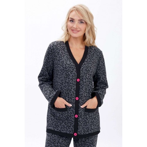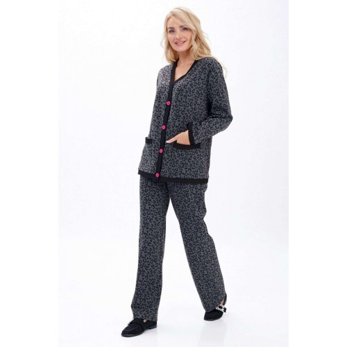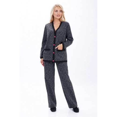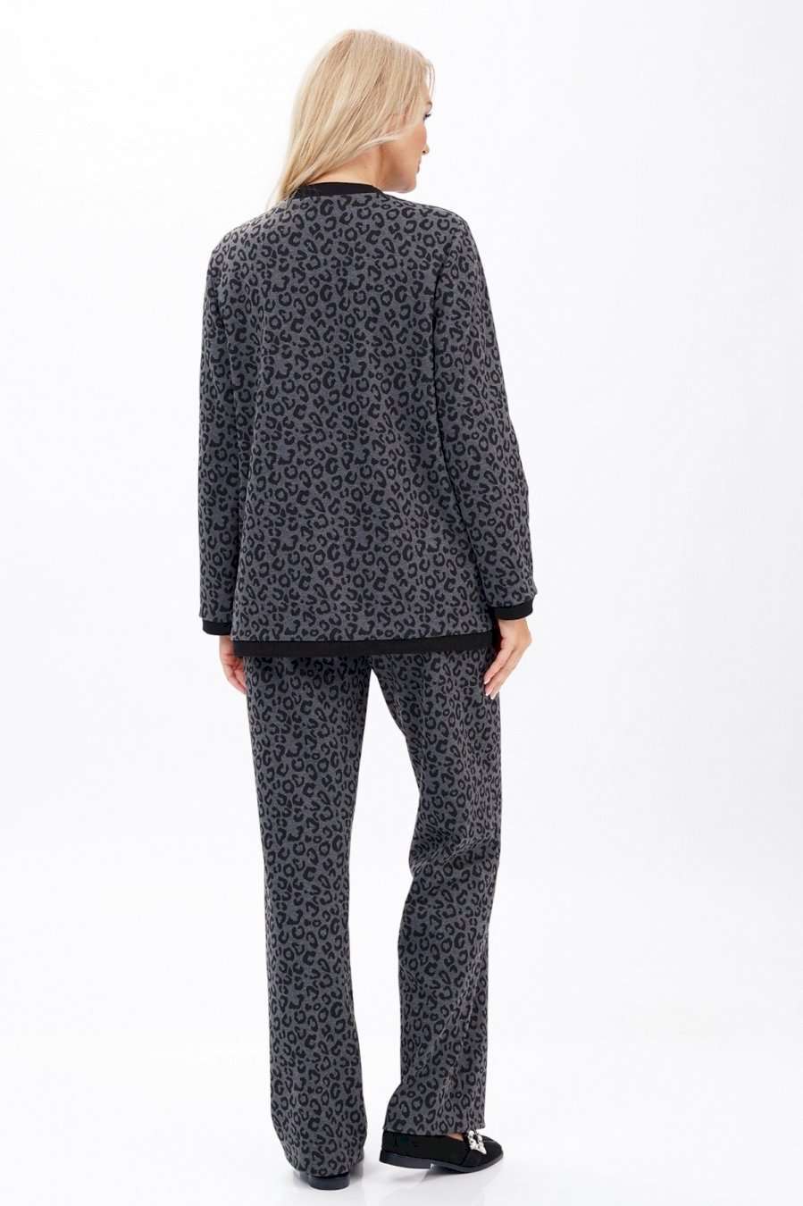 Комплект женский 2-х предметный состоит из кардигана и брюк. Кардиган прямого, свободного силуэта понизу с притачным поясом, с застёжкой по притачной планке на петли, пуговицы. Перед с накладными карманами. Рукава втачные, одношовные, длинные понизу с притачными манжетами. Планка борта и горловины, манжеты рукава, отделочная деталь кармана, пояс по низу выполнены из трикотажного довяза. Брюки прямого силуэта, с притачным поясом на резинке. Задние части с талевыми выточками.
