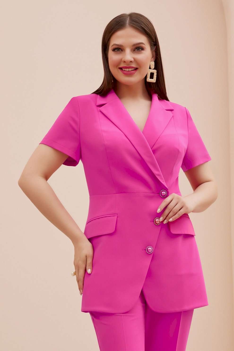 Костюм брючный 5055 Lissana привлекает внимание своим стильным дизайном и ярким цветом. Коллекция бренда Lissana выполнена из полиэстера, вискозы и спандекса, что обеспечивает комфорт и удобство в носке. Жакет со стояче-отложным воротником и смещенной застёжкой на пуговицы украшен карманами с клапанами на передней части, добавляя функциональности и элегантности. Брюки на притачном поясе с резинкой и наклонными карманами подходят для создания повседневного образа. Короткие рукава и светлая палитра делают этот комплект идеальным выбором для летнего сезона. Яркий розовый цвет подчёркивает женственность и уверенность в себе. Этот брючный костюм станет отличным выбором для работы, встреч и активного отдыха.