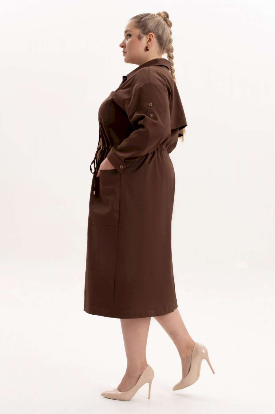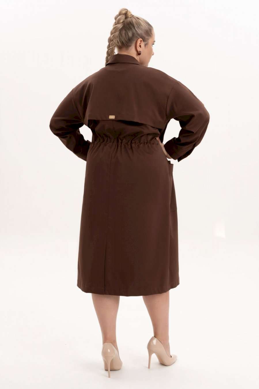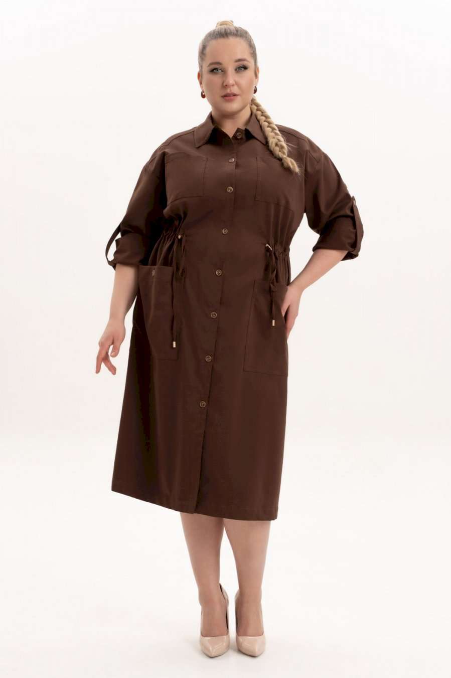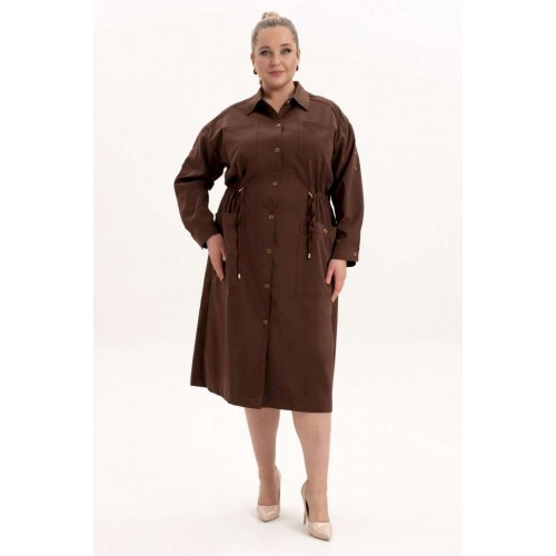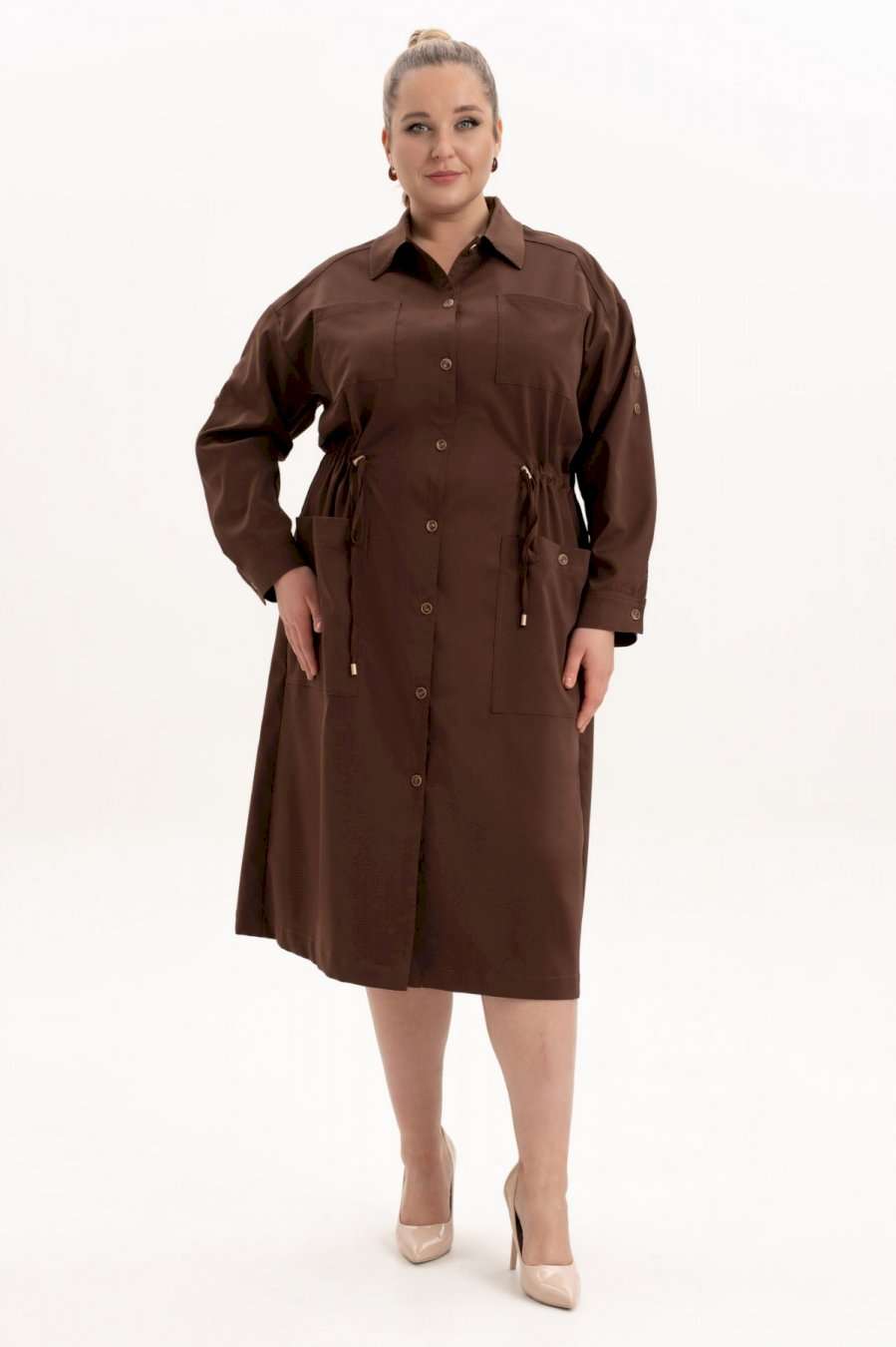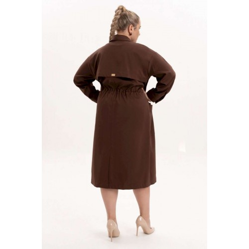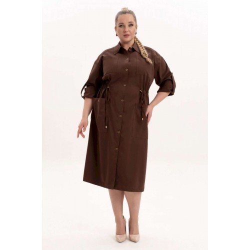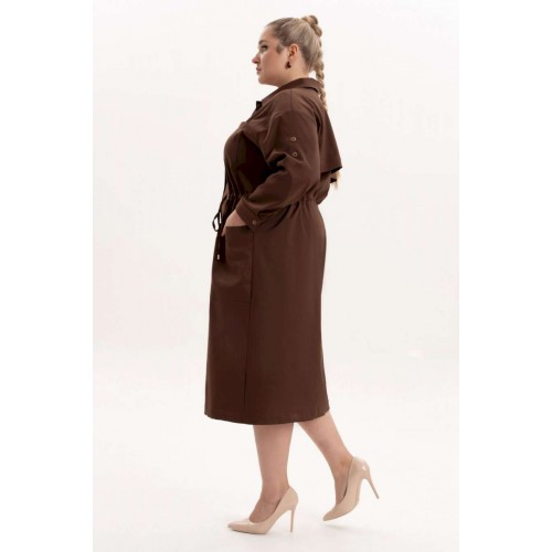 Платье офисное повседневное представляет собой идеальный выбор для женщин ищущих комфорт и стиль в ежедневной одежде. Это платье-плащ с застёжкой на петли и пуговицы, поясом на кулисе, добавляющими удобство в носке и возможность адаптации к различным фигурам. Благодаря универсальности, наряд можно носить и на работу, в офис, на прогулку и в ресторан. По спинке имеется средний шов, шлица и отлитная кокетка в верхней части спинки. Особенностью этой модели является декоративная кокетка , напоминающая плащ. Длинные рукава с манжетами и патами на петли и пуговицы, что позволяет регулировать длину рукава, гармонично дополняют классический фасон платья с воротником рубашечного типа. Большие накладные карманы и маленькие нагрудные по переду платья добавляют удобства в носке.Свободный оверсайз силуэт делает это платье универсальным. Такое платье призвано подчеркнуть природную женскую красоту и грацию, а также безупречный вкус его обладательницы.