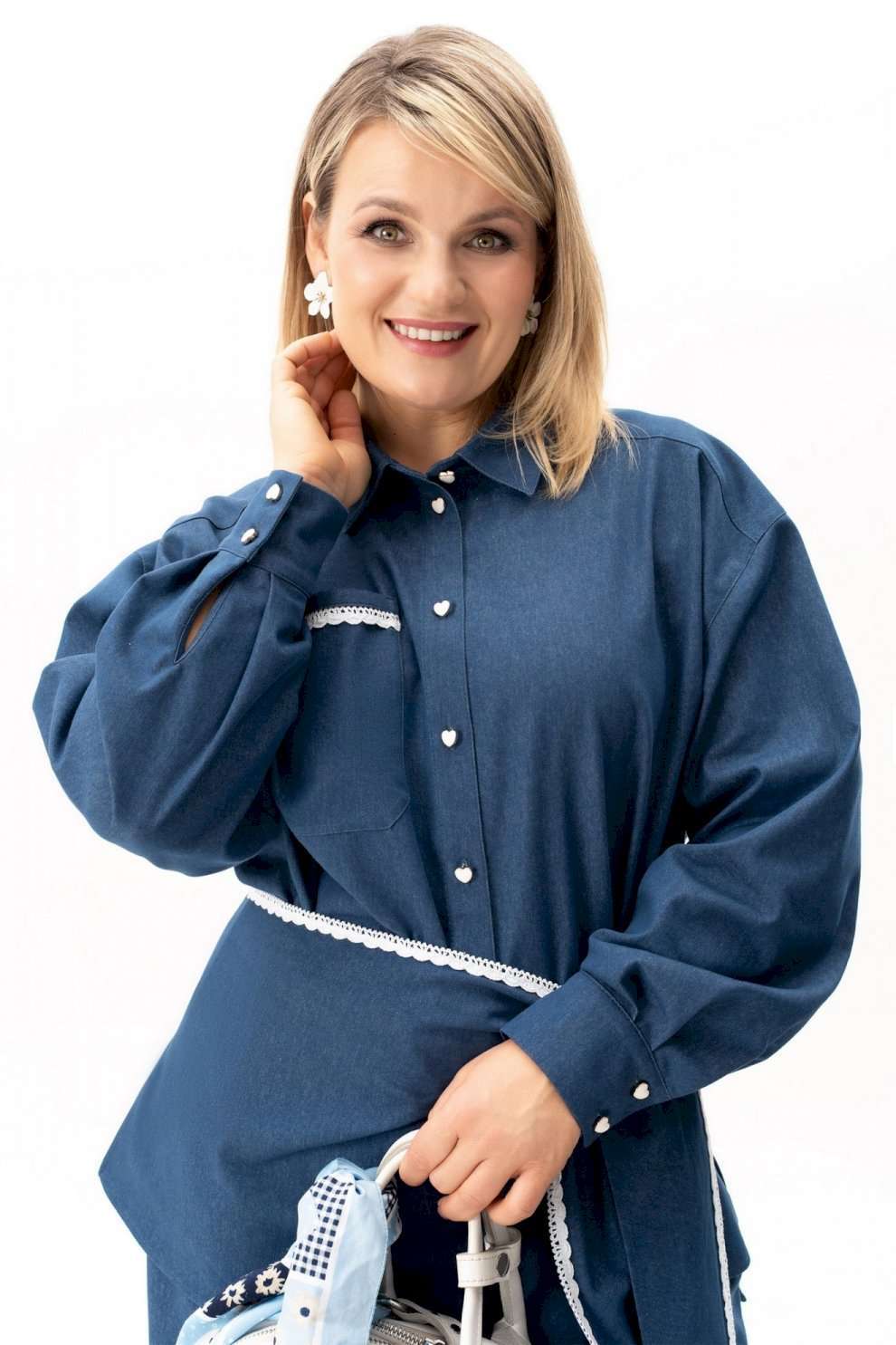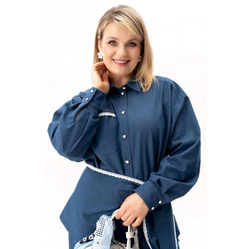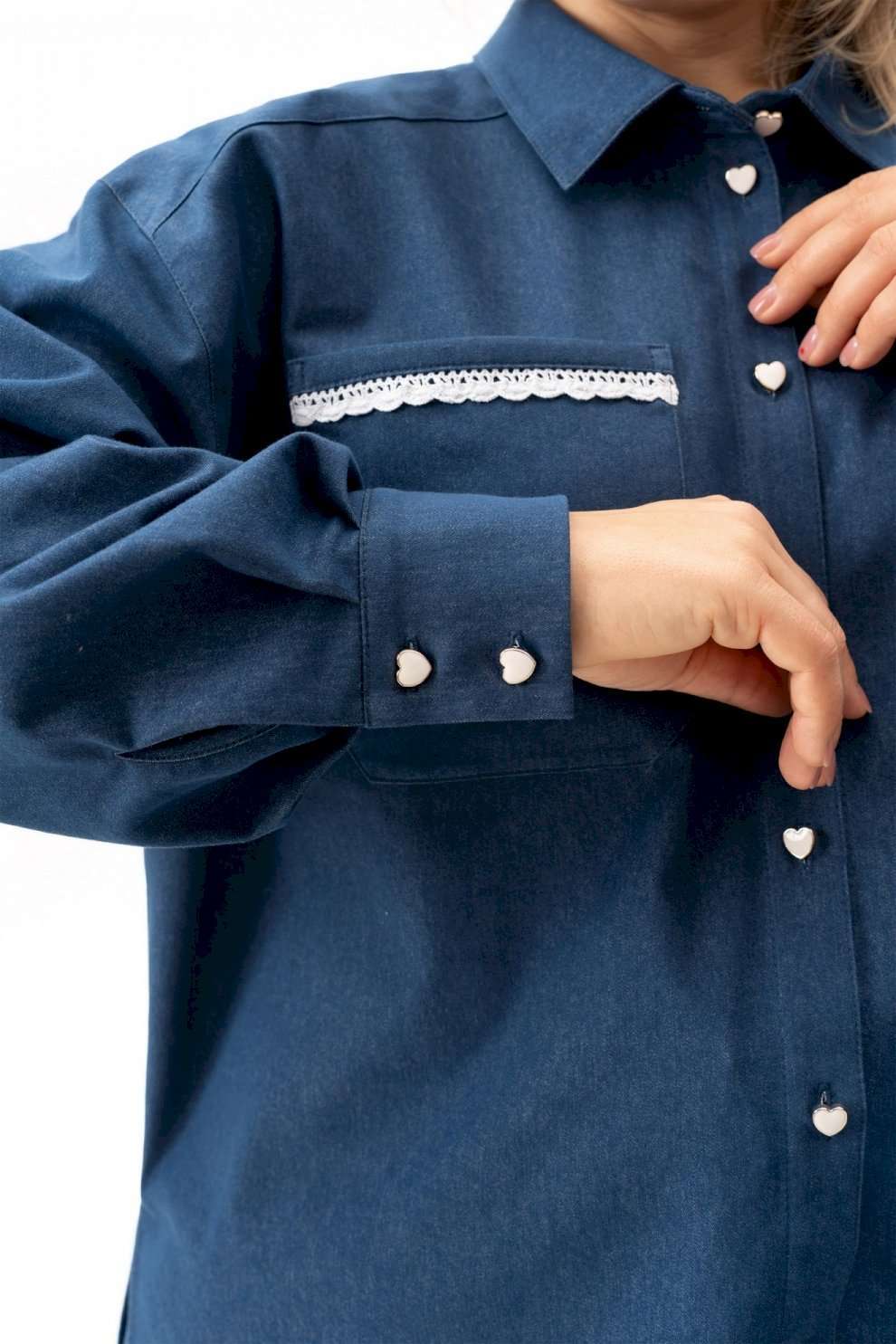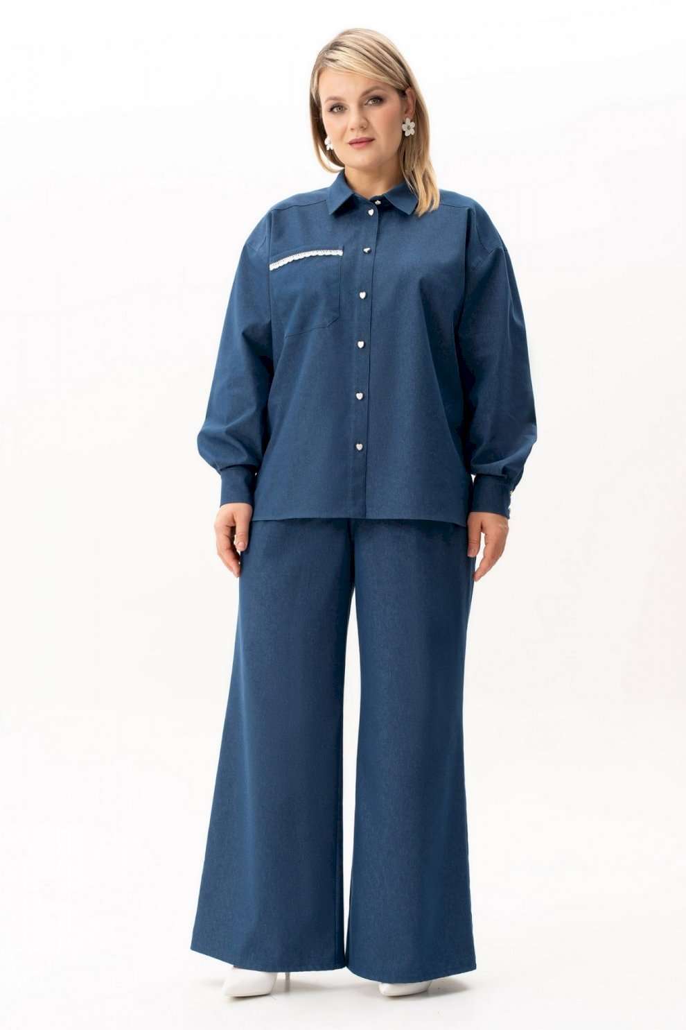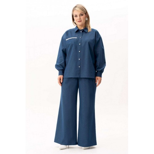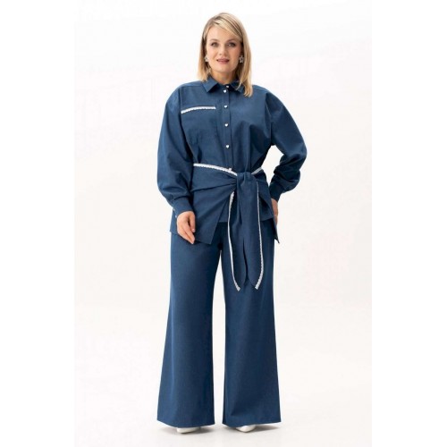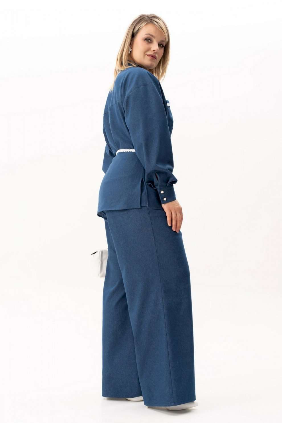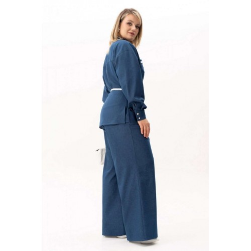 Костюм брючный 4153 Algranda (Новелла Шарм) — это стильный способ дополнить ваш гардероб. Коллекция бренда Algranda предлагает джинсовый костюм-двойку из хлопка с эластаном, обеспечивающим комфортную посадку. Темно-синий деним классично комбинируется с модной детализацией: долгие втачные рукава на манжетах, контрастные пуговицы в форме сердца и съемная баска-косынка. Брюки палаццо с высокой посадкой и эластичным поясом добавляют свободу движений и визуально удлиняют фигуру. Этот костюм подходит для повседневного стиля casual, прогулок и нестрогих офисных встреч. Длина жакета — 69 см, длина брюк — 112 см, а длина рукава — 61 см. Темно-синий цвет сочетается с белой кружевной отделкой, добавляя акцент в образ.