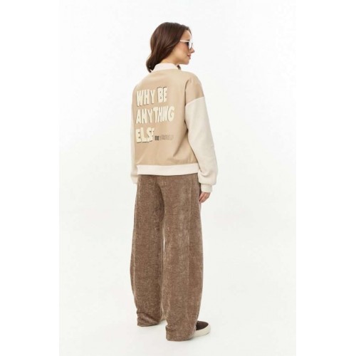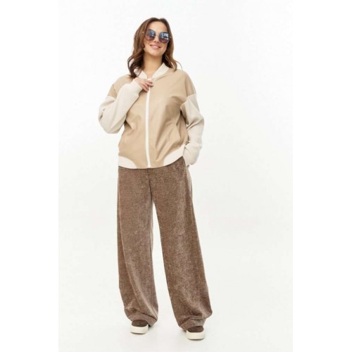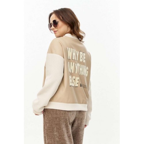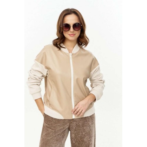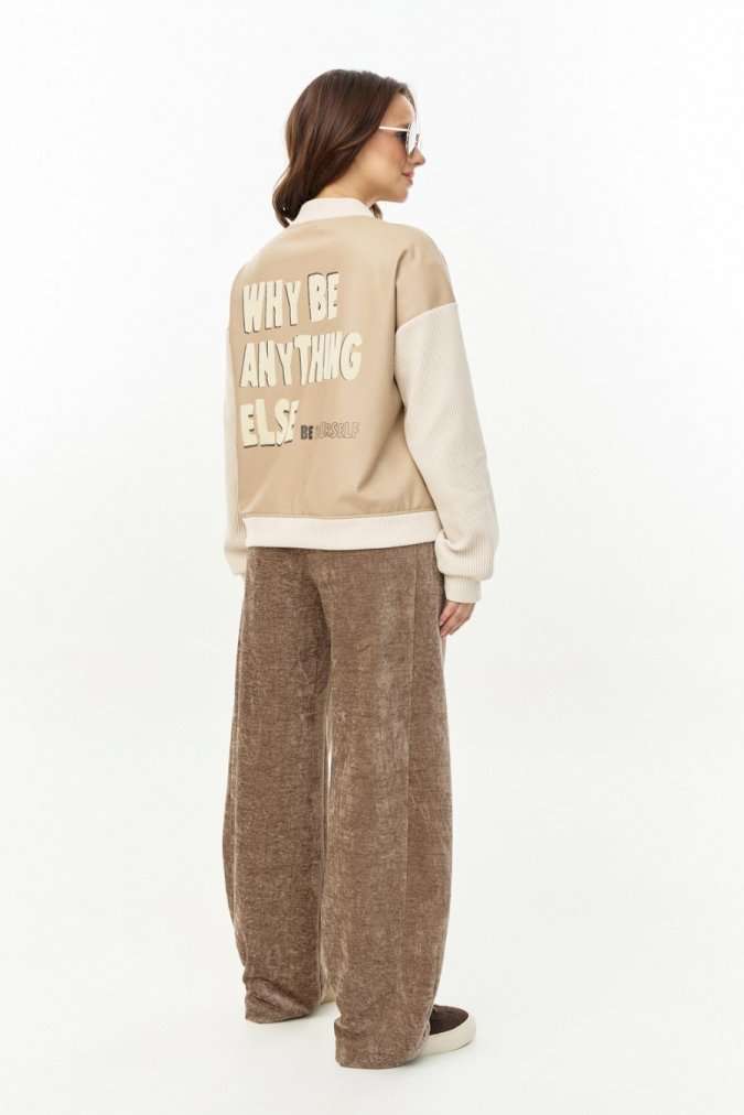 Бомбер из мягкой и эластичной экокожи, длиной до линии бедер, с застежкой на молнию, горловиной со стойкой и боковыми карманами в швах. Рукава, стойка и манжета низа из отделочного вельветового трикотажа. Спинка декорированаавторским принтом с использованием флока. Изделие на подкладке.