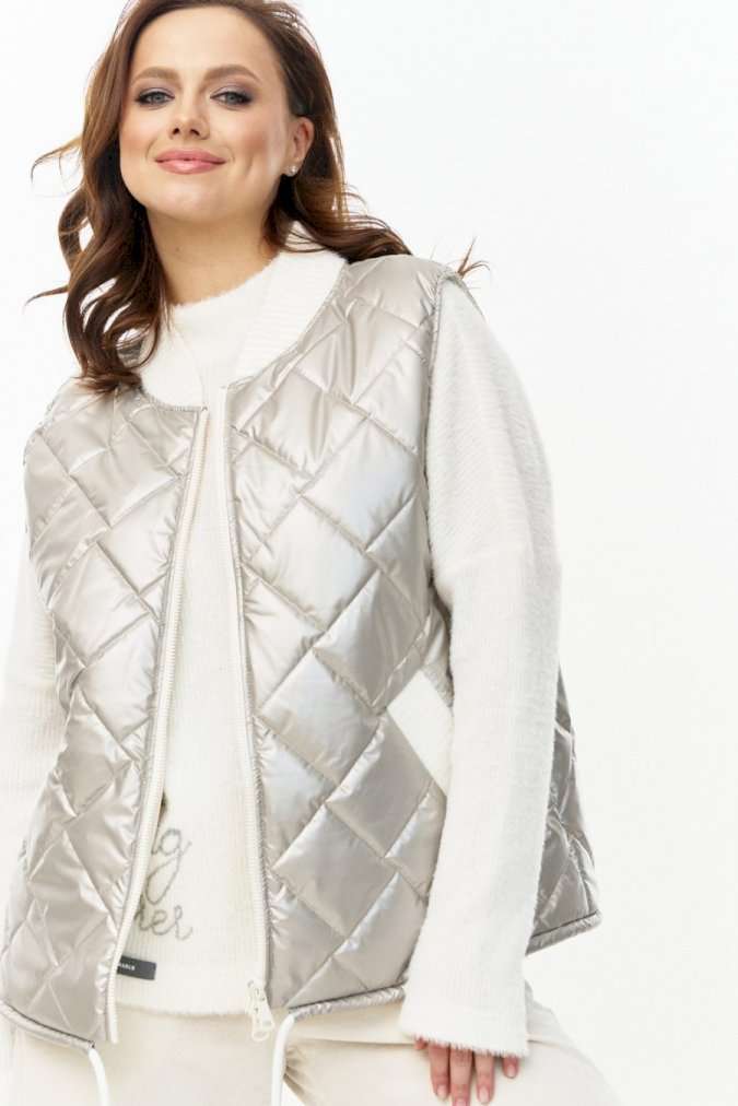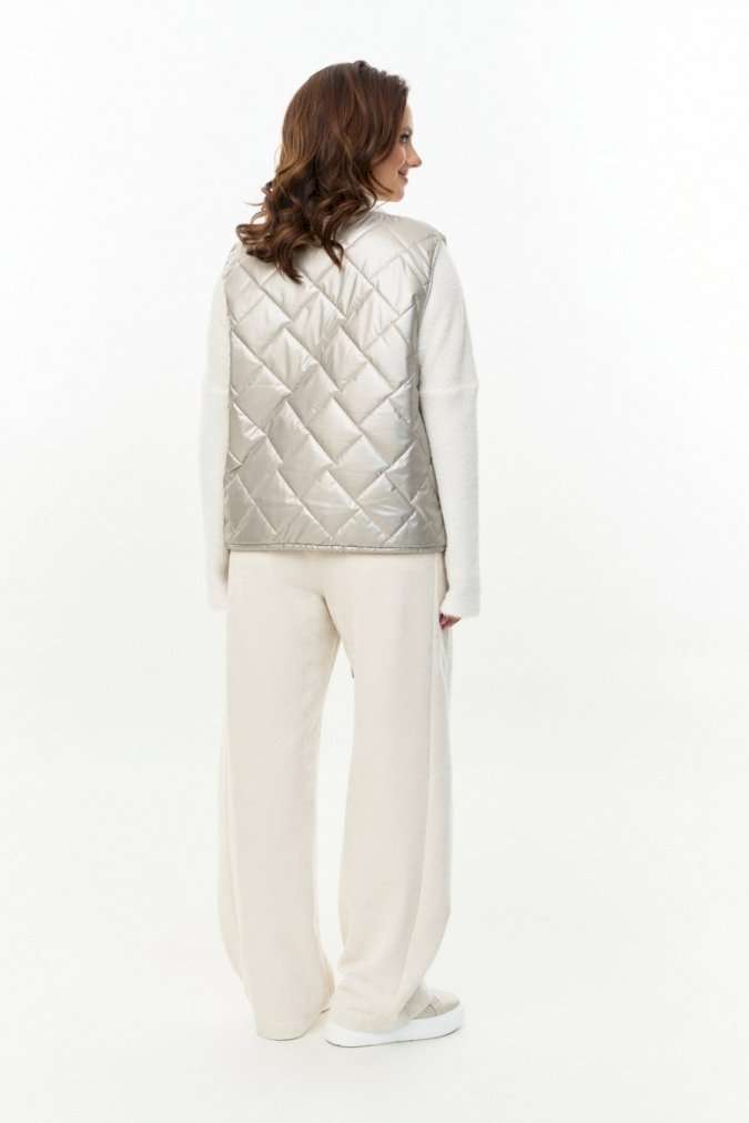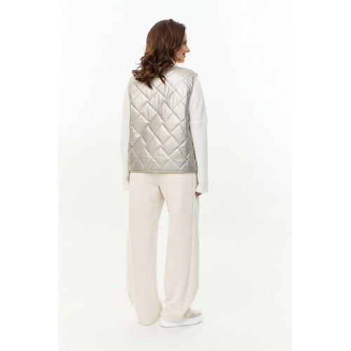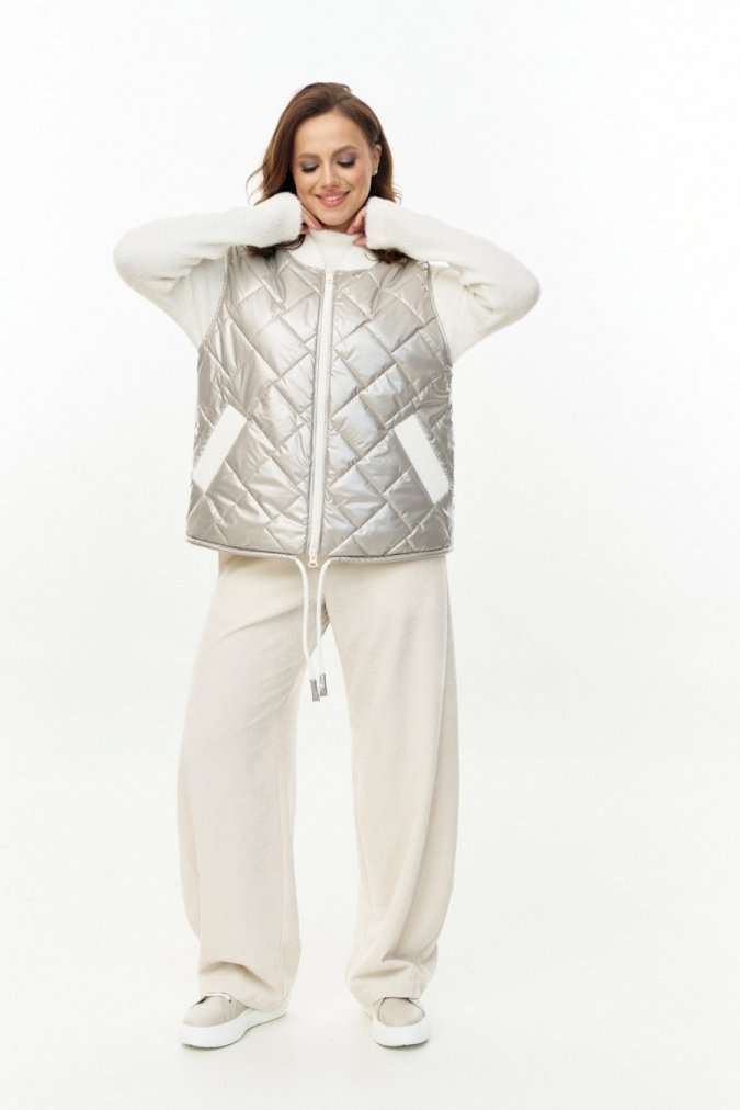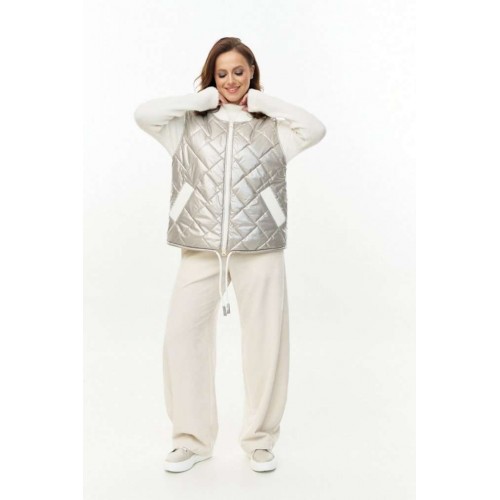 Стеганый жилет из водоотталкивающей плащевки на синтепоне, длиной до линии бедер, прямого силуэта, с застежкой на молнию и горловиной со стойкой. Стойка и листочки карманов из плотного трикотажного довяза "альпака". Низ жилета с кулисой и шнуром. Изделие на подкладке.