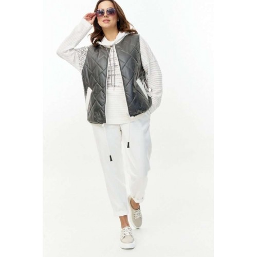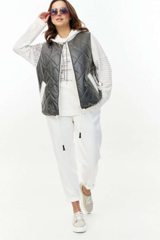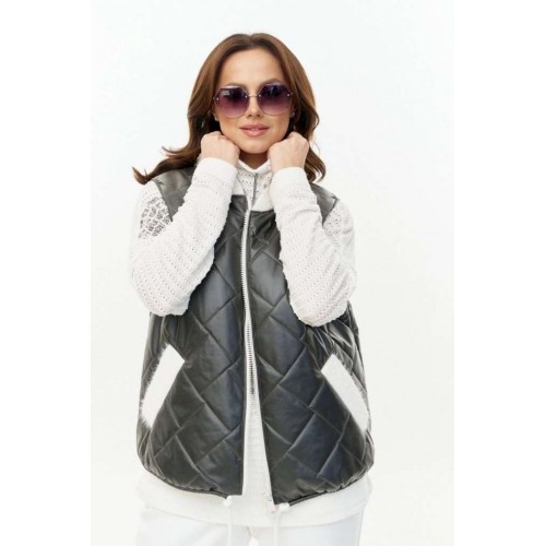 Стеганый жилет из водоотталкивающей плащевки на синтепоне, длиной до линии бедер, прямого силуэта, с застежкой на молнию и горловиной со стойкой. Стойка и листочки карманов из плотного трикотажного довяза "альпака". Низ жилета с кулисой и шнуром. Изделие на подкладке.