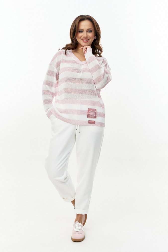 Джемпер из вискозного трикотажа, свободного силуэта и V-образной горловиной. Рукав длинный, линия плеча спущена. Изделие декорировано нашивками с авторским принтом.