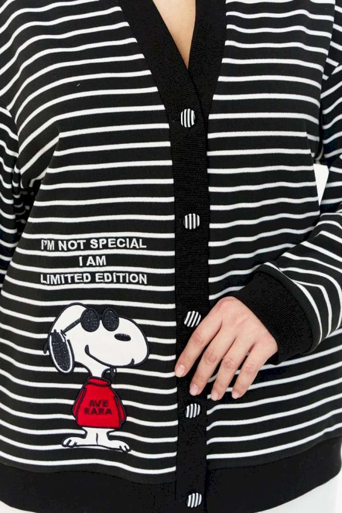 Кардиган из мягкого флиса с густым коротким ворсом, свободного силуэта, с застежкой на пуговицы спереди. Планки и манжеты из отделочного трикотажа. Рукав длинный, линия плеча спущена. На переде справа авторская вышивка с аппликацией.