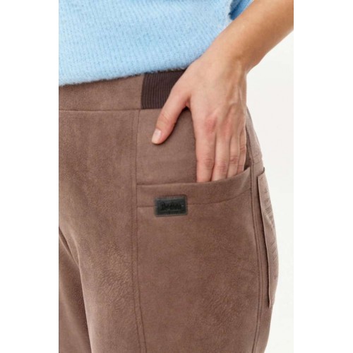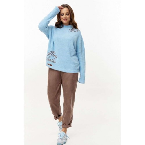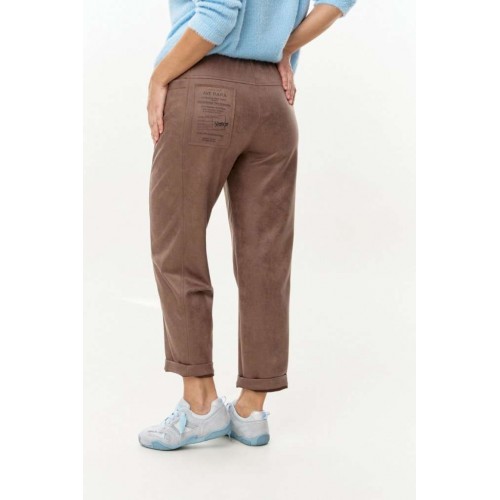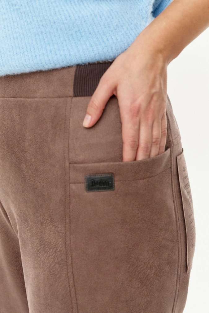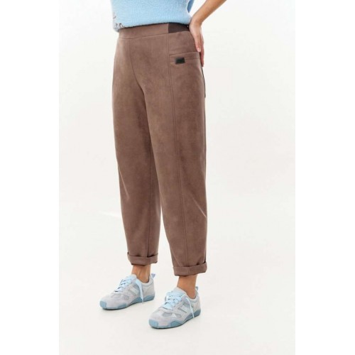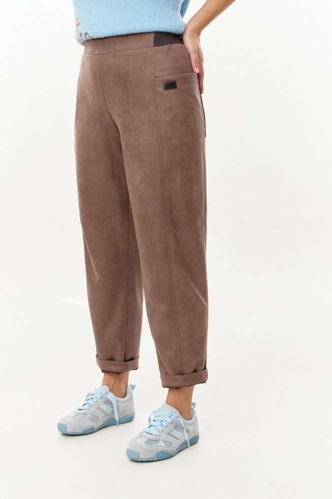 Брюки из плотного эластичного трикотажа с покрытием \"нубук\", прямого силуэта, зауженные к низу. Пояс с трикотажной вставкой с резинкой. Карманы брюк в боковых вставках. Изделие декорированонашивкой с авторским принтом.