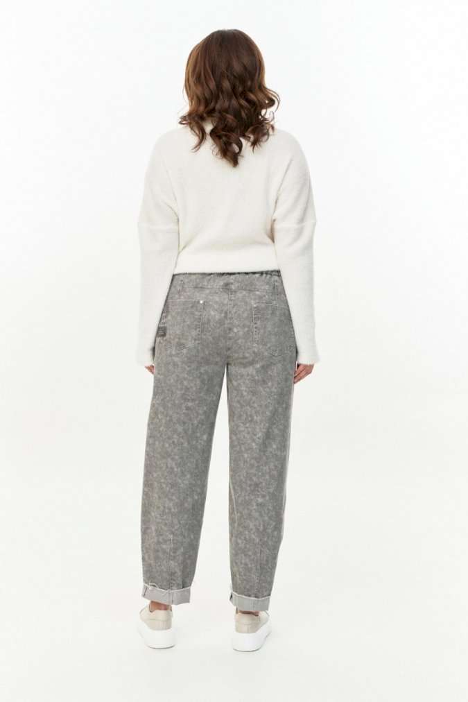 Джинсы из \"мраморного\" хлопка, с четырьмя функциональными карманами и поясом с резинкой на спинке. Боковые швы брюк переходят на перед. Изделие проходит энзимную стирку.