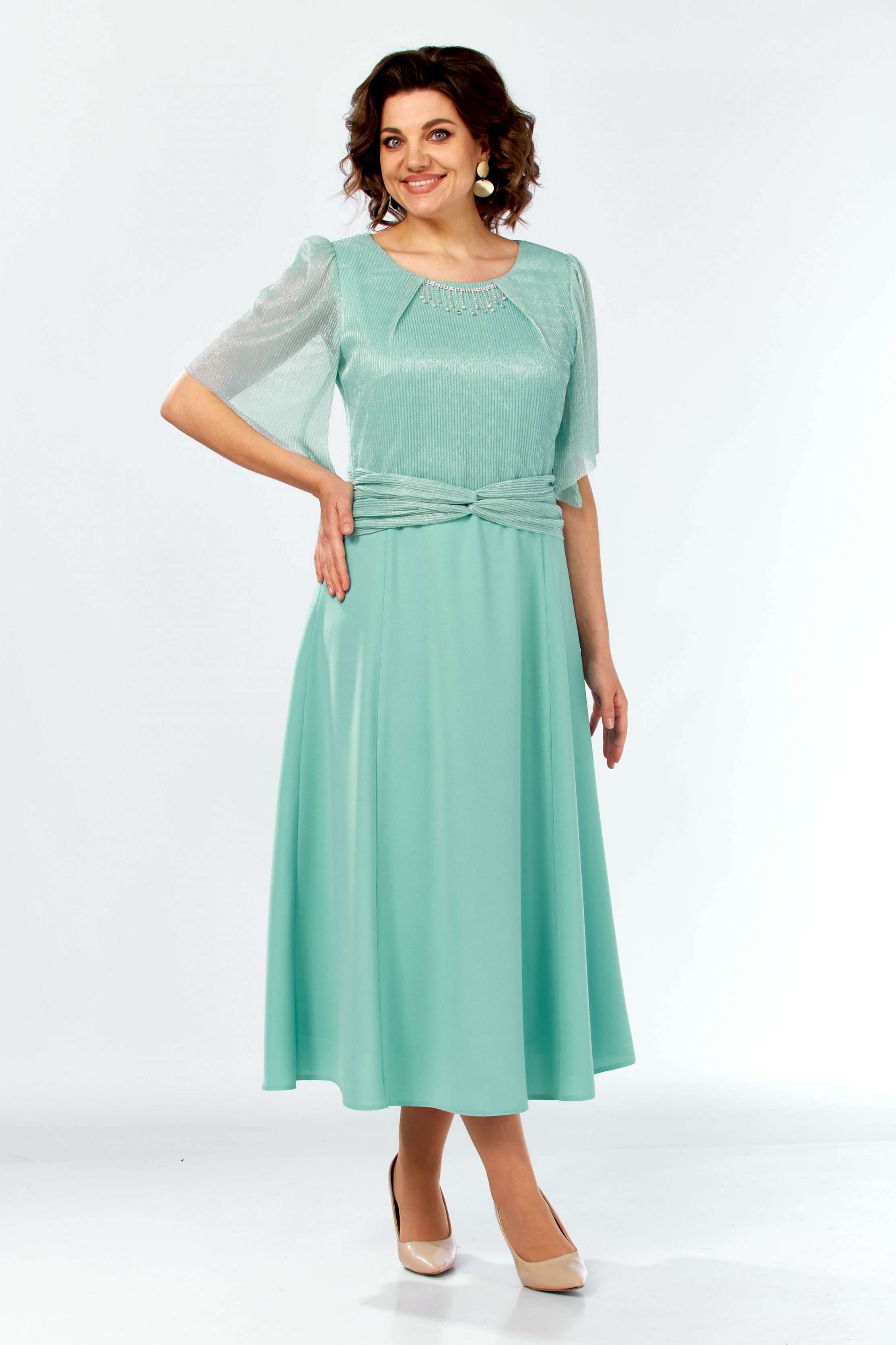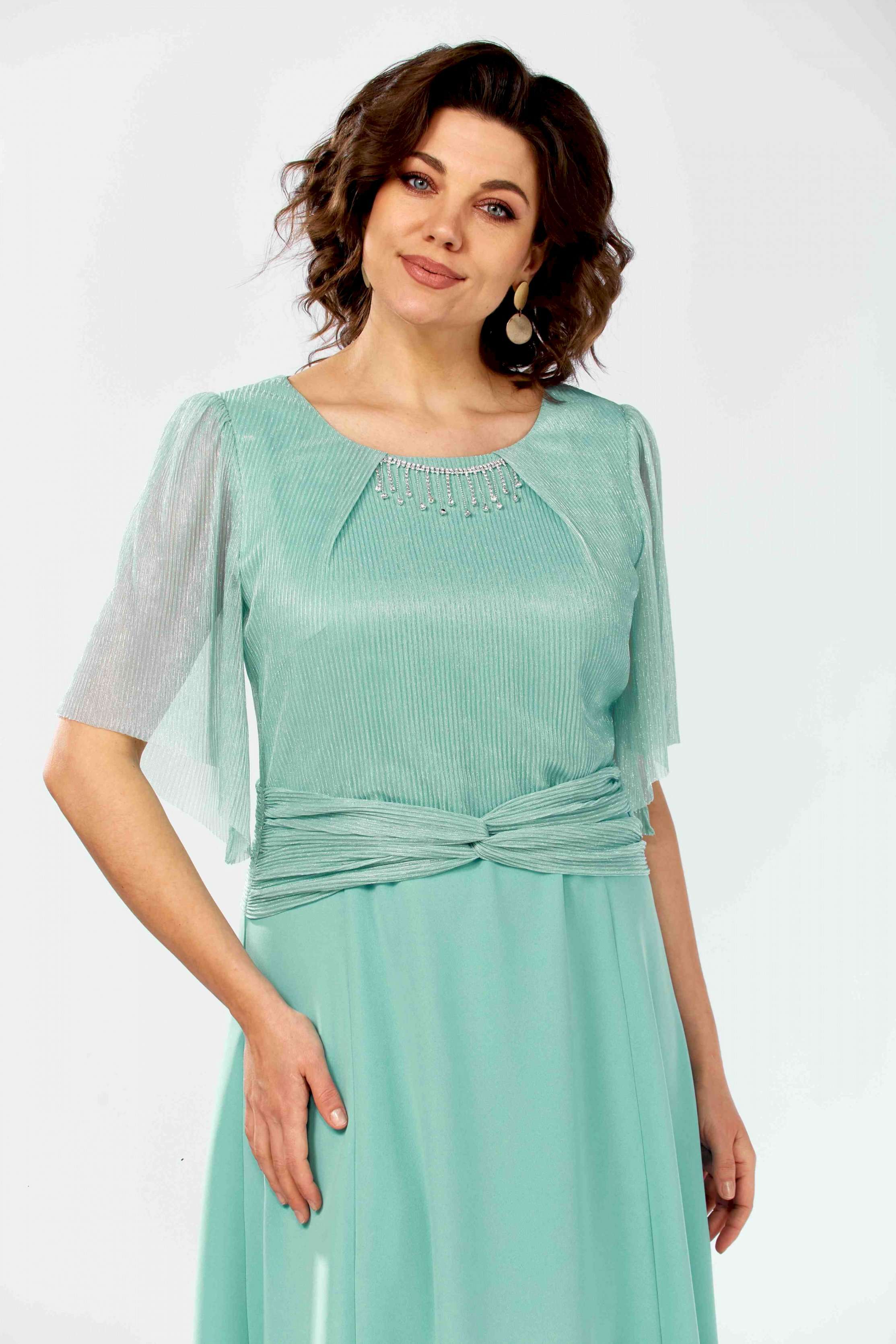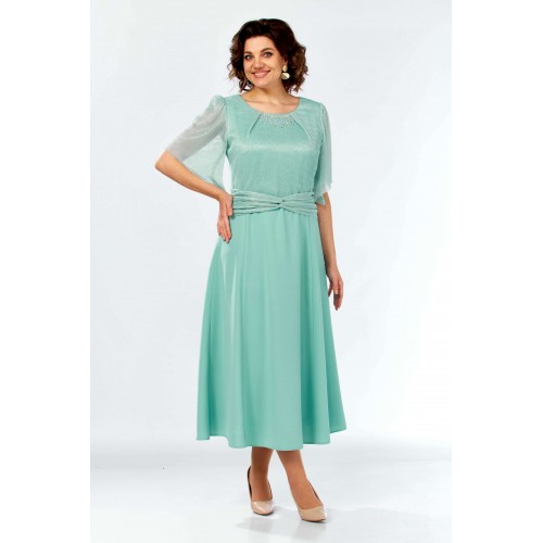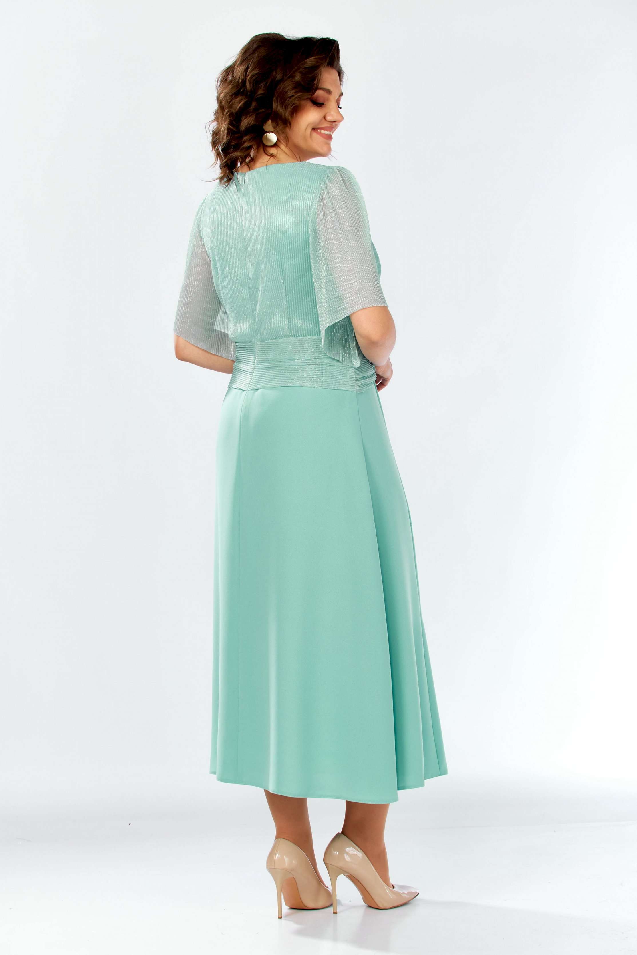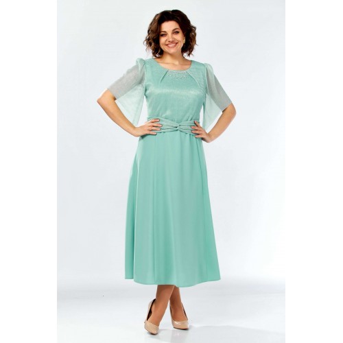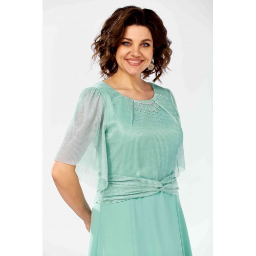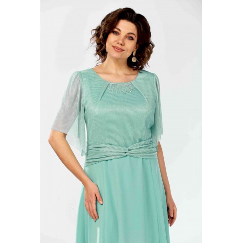 Платье женское нарядное, комбинированное их двух видов ткани:однотонной плательной и мелкой плиссированной с лёгким мерцающим блеском. Изделие отрезное по линии талии с драпировкой, вырез горловины-полукруглый с украшением из камешков, рукав расклешённый укороченный, фигурный по низу. Застёжка на молнию с среднем шве спинки, низ изделия расклешённый. Изделие на подкладке.