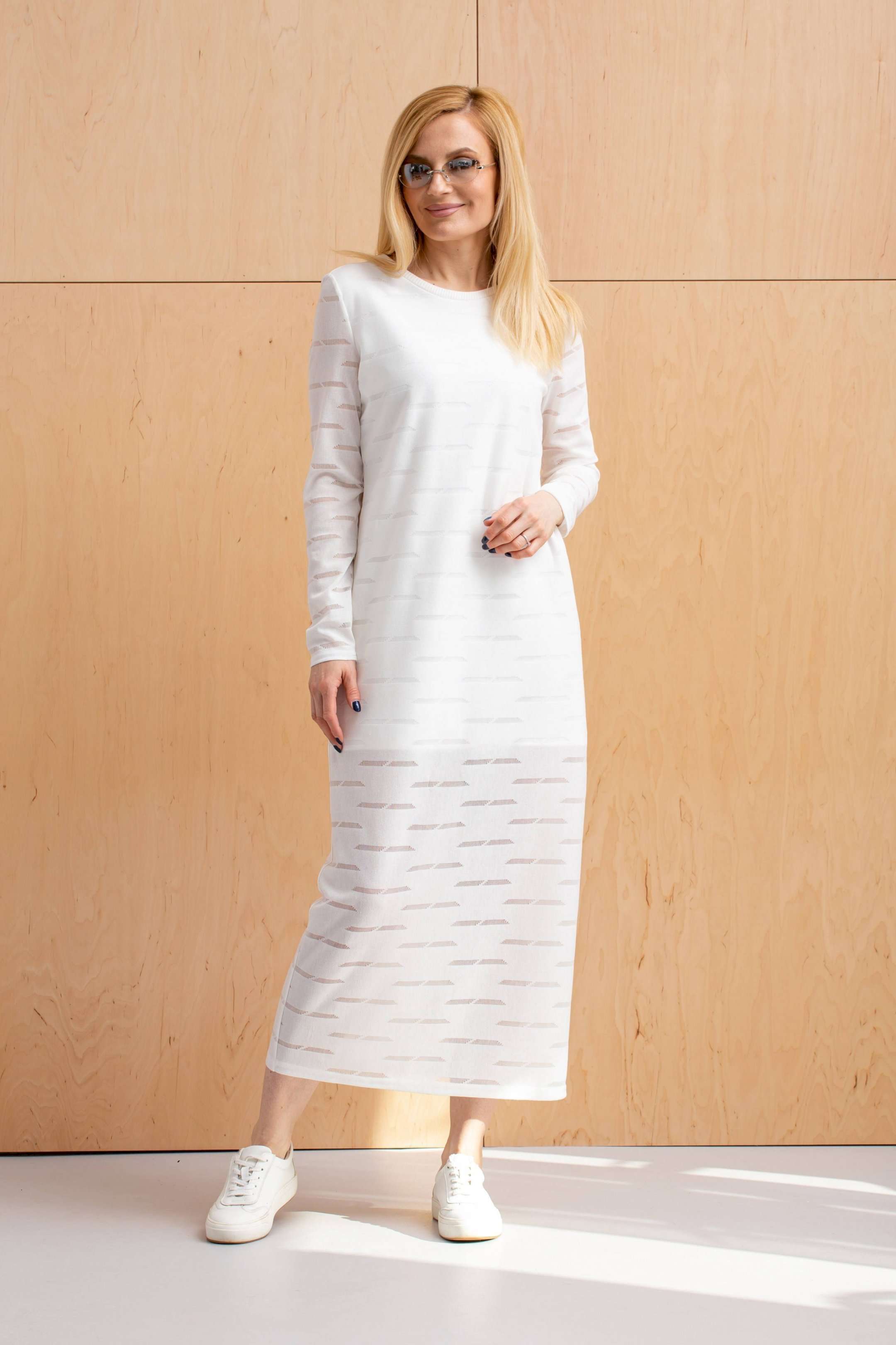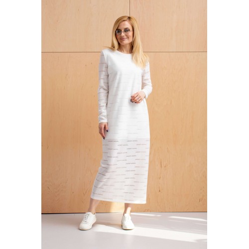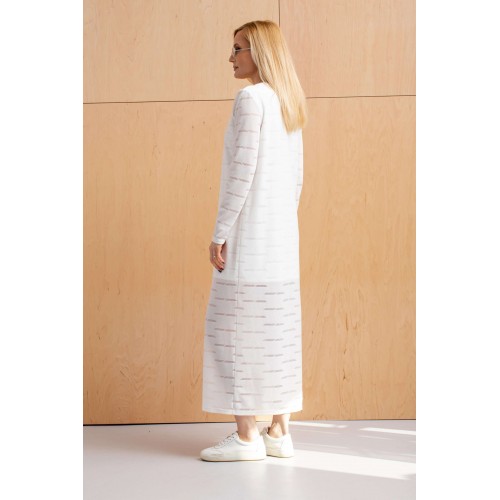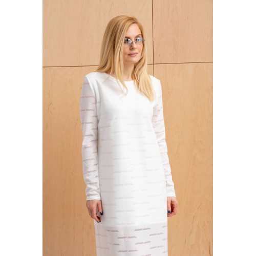 Платье женское из тонкого трикотажного полотна с неоднородной поверхностью. Изделие на подкладке из тонкого трикотажного полотна, до колена. Платье слегка прилегающего силуэта удлинённое с длинным втачным рукавом, вырез горловины полукруглый с узкой планкой.