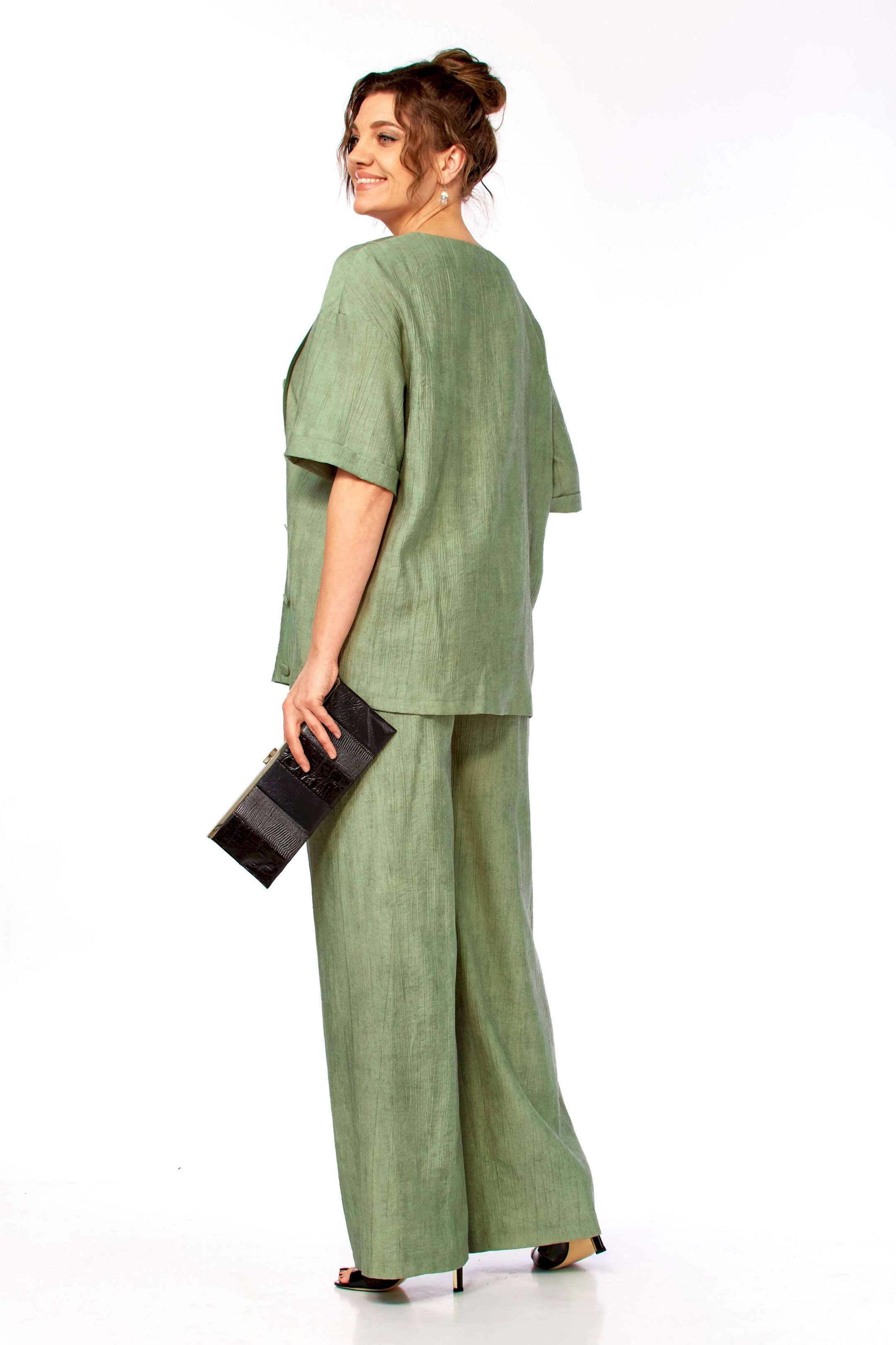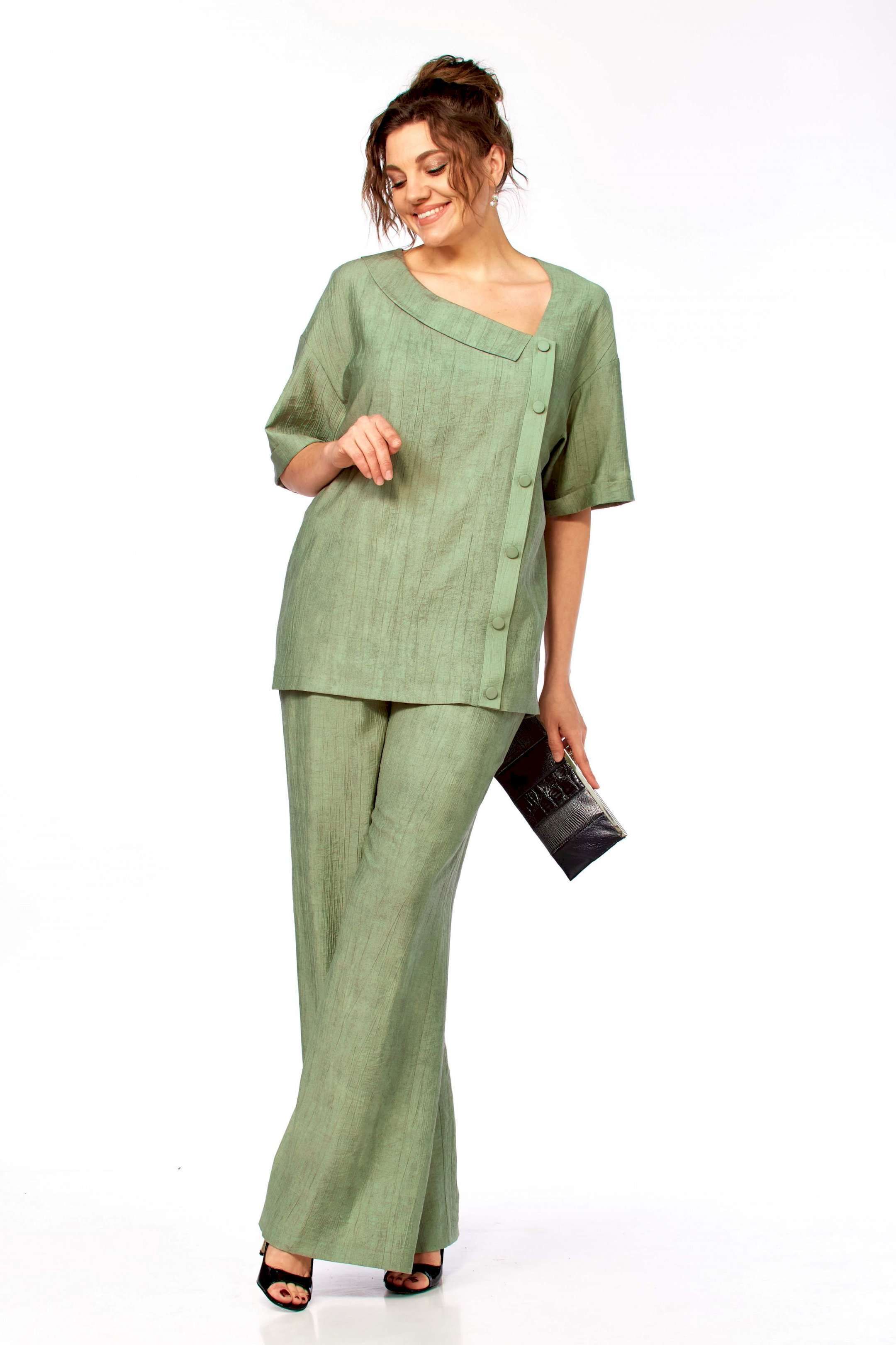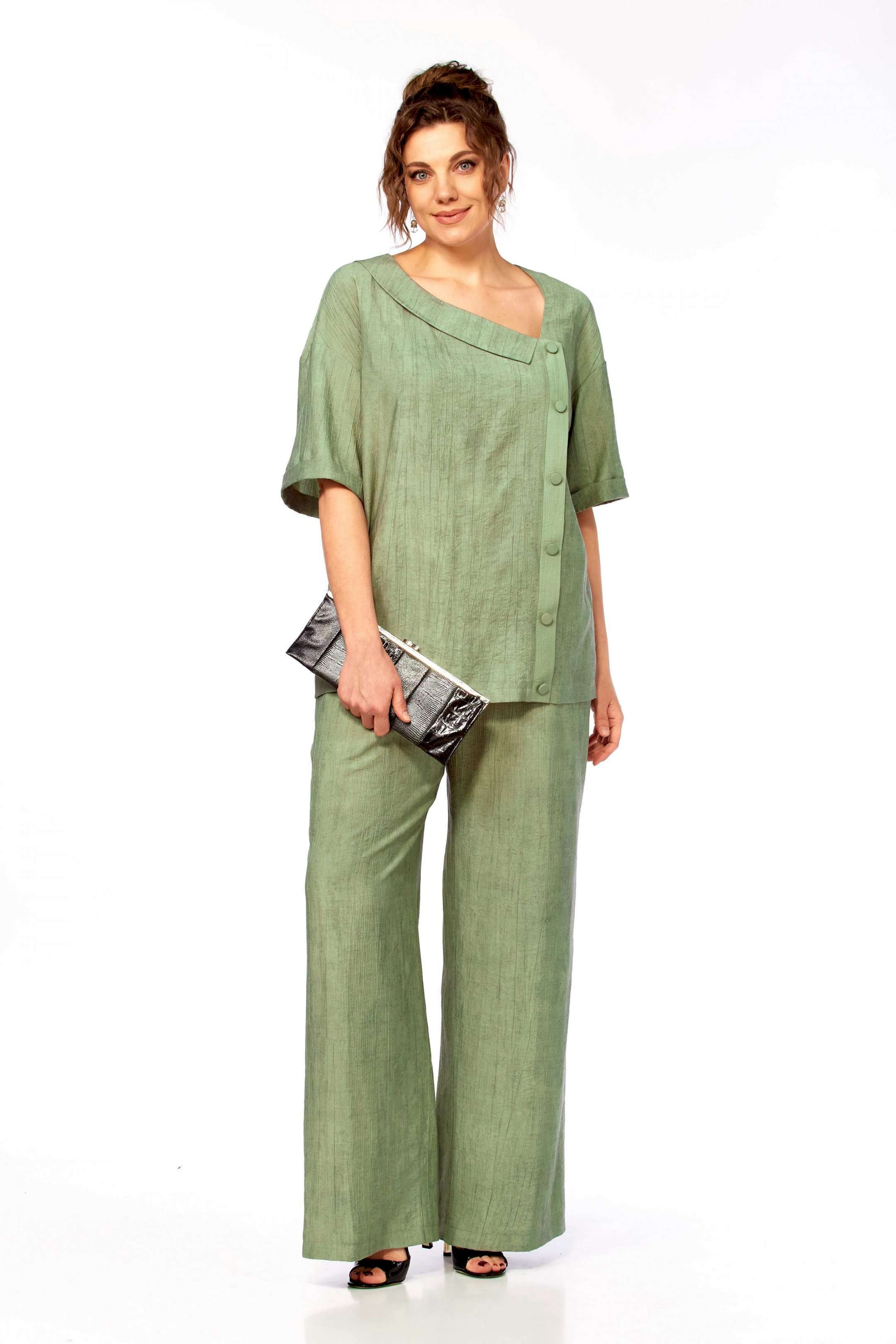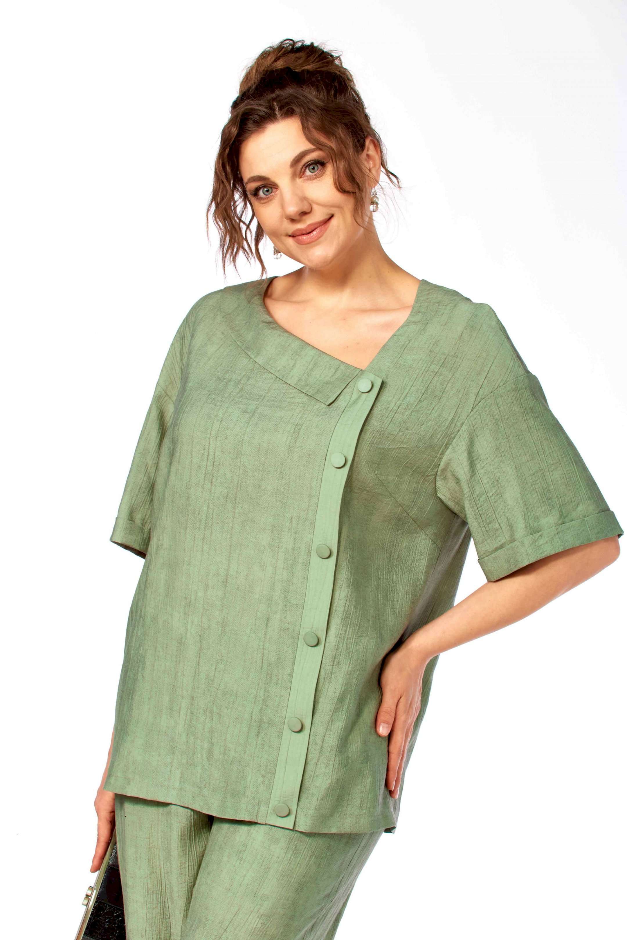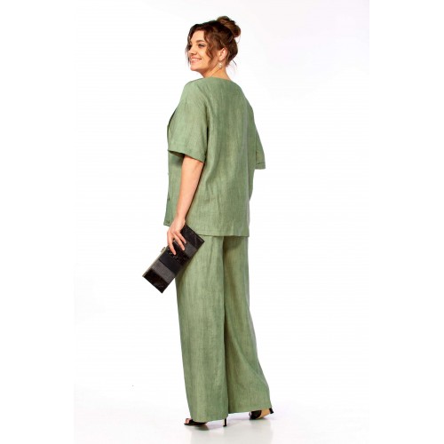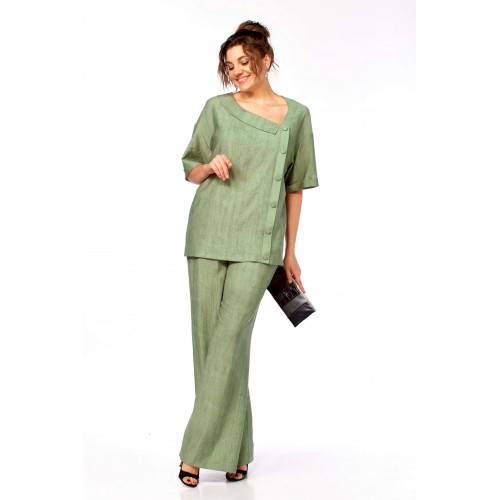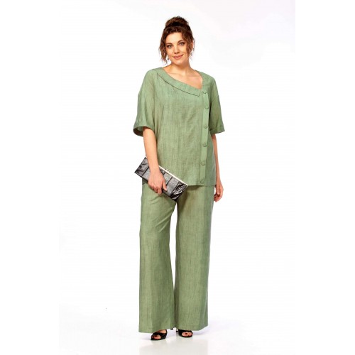 Комплект женский брючный, состоящий из блузы и брюк.Блуза свободного покроя до уровня бёдер с рукавом на спущенной пройме, рукав до локтя с отложной манжетой по низу. Вырез горловины ассиметричный V- образный, с воротничком, слева по переду планка с пуговицами от горловины до низа изделия, спинка цельная прямая. Брюки свободные, широкие на поясе с эластичной тесьмой, с боковыми карманами.