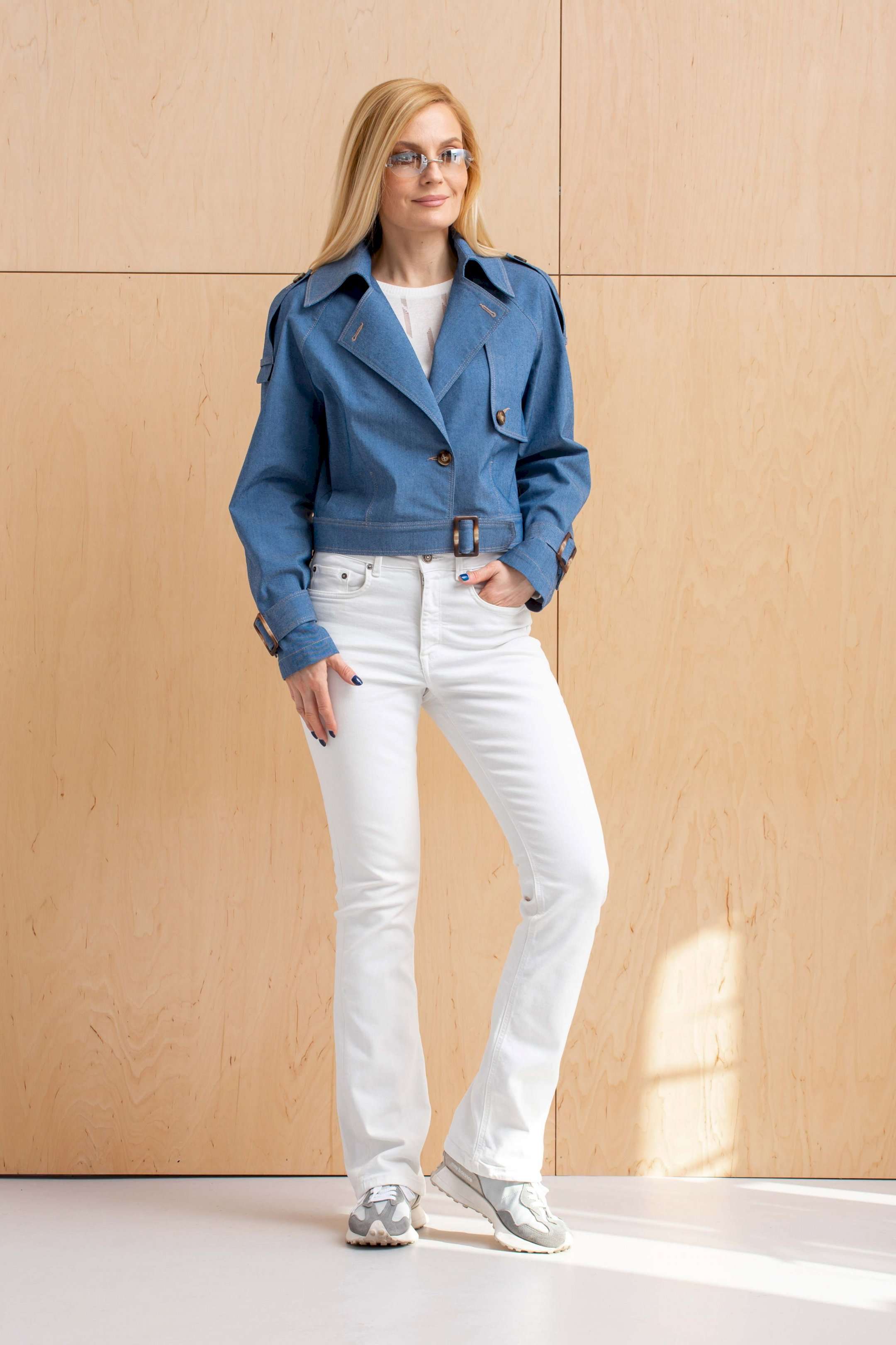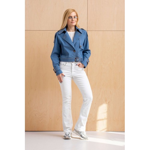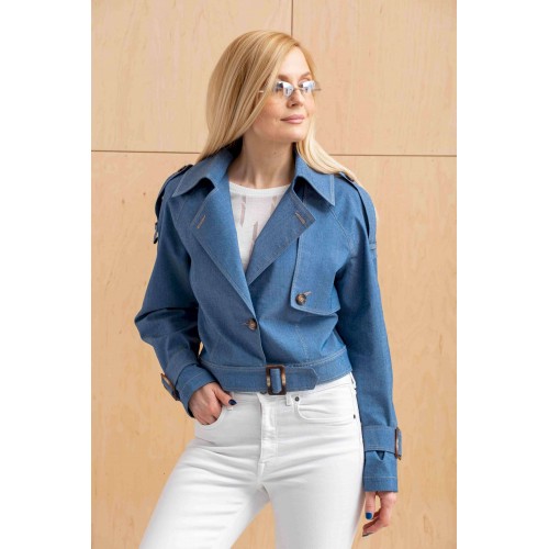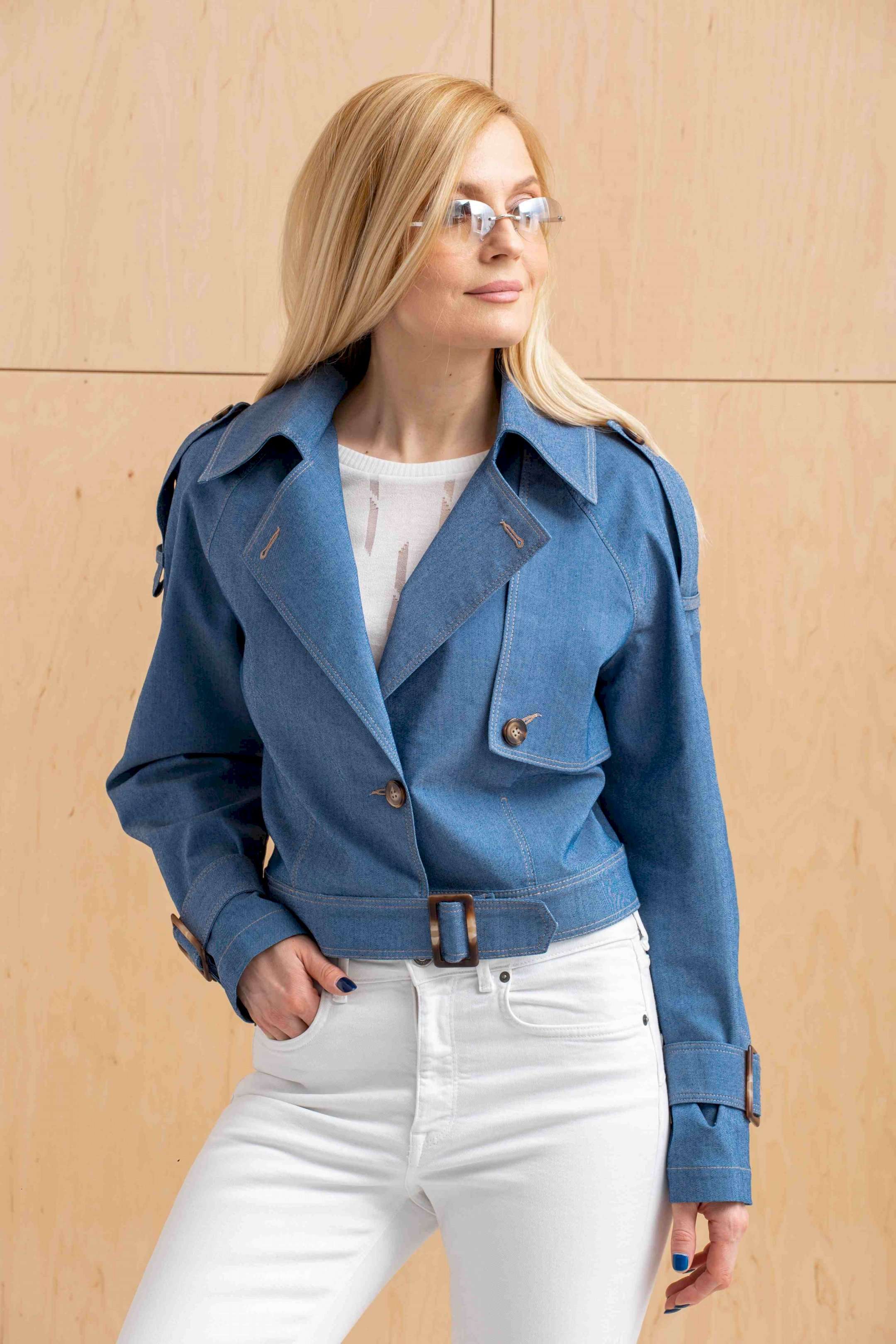 Куртка из джинсовой ткани с эластаном. Свободная, укороченная, на поясе с пряжкой, рукав реглан с катами по низу и с пряжками, воротник отложной на стойке с лацканами, с кокеткой слева по переду, с погонами по плечевым швам. Без подкладки.