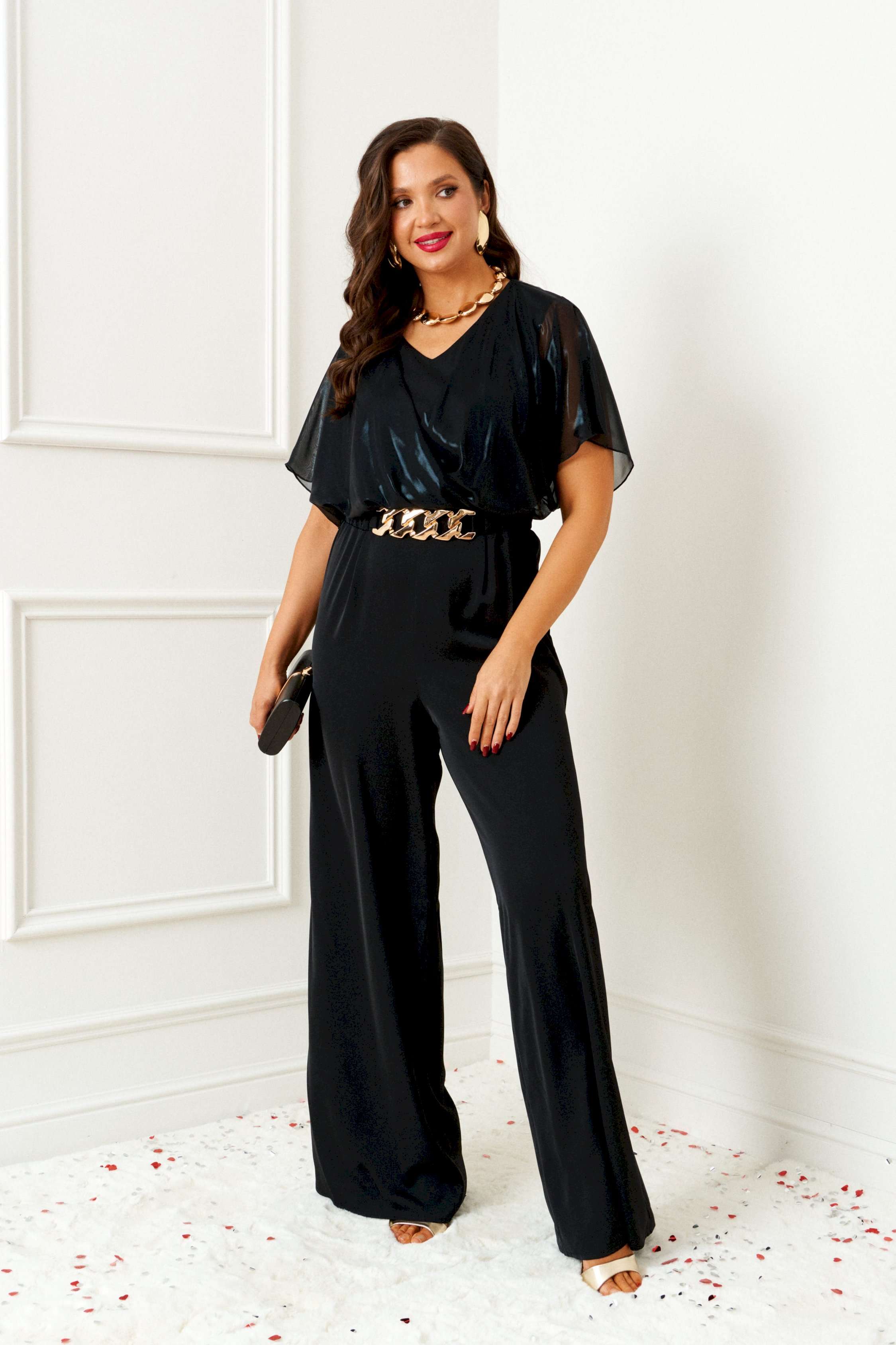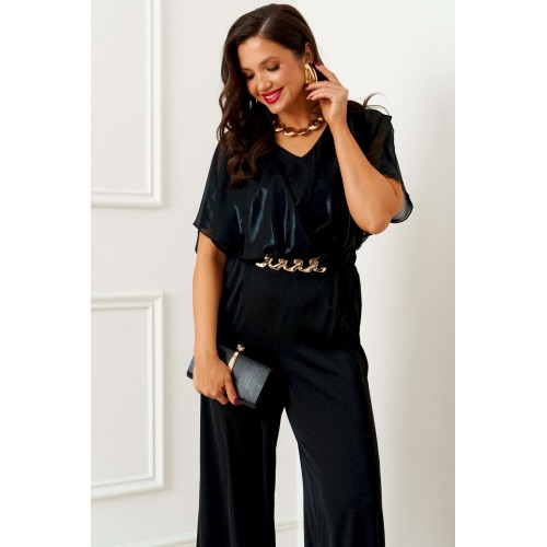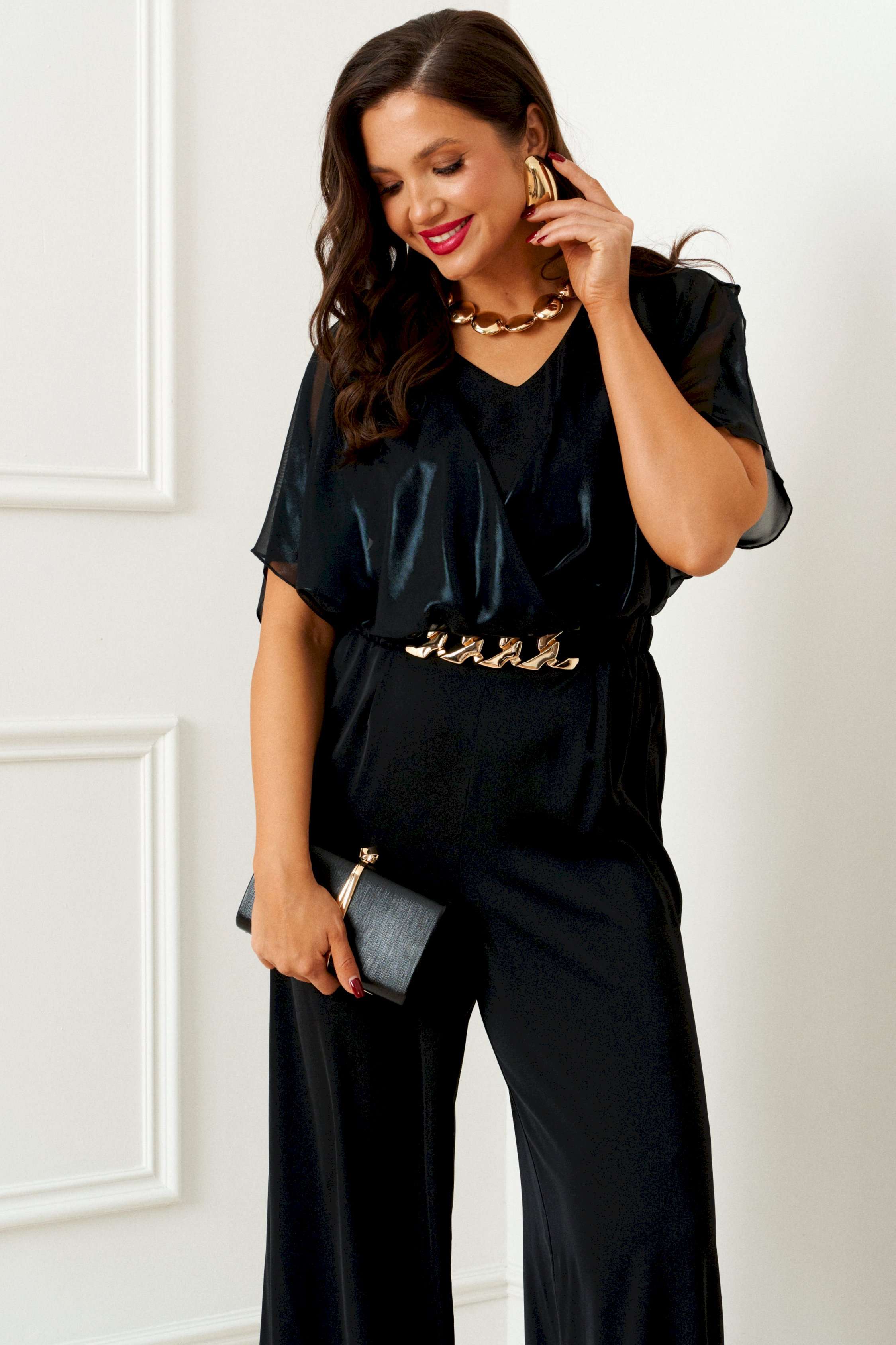 Это не только красивый, нарядный, но и очень практичный предмет гардероба. Соединение в одно целое женских брюк и верха, является чрезвычайно функциональным решением. Комбинезон изготовлен из 2-х видов смесового полотна. Предлагаемая модель свободного кроя. Передняя верхняя часть двуслойная, выполнена из двух видов ткани. Нижний слой из лёгкого костюмно-смесового полотна, без рукавов, с V-образным вырезом горловины спереди. Верхний накладной слой из лёгкой шифоновой ткани, в, полюбившемся многим, стиле «на запах», со спущенной линией плеча. Плечевой шов изделия предусматривает декоративные разрезы вдоль линии плеча. Задняя верхняя часть комбинезона разрезная по среднему шву, с застежкой на потайную молнию. Комбинезон отрезной по линии талии. Подрезная планка на талии шириной 4 см, в которую частично вставлена резинка. Брюки прямые широкие, в стиле «палаццо». На передней части изделия предусмотрен декоративный элемент в виде цепочки. Длина верхней части (по среднему шву спинки) ~ 43 см. Длина рукава (рукав +плечо) ~ 32-34 см. Длина брюк (по боковому шву с поясом) ~ 113 см.