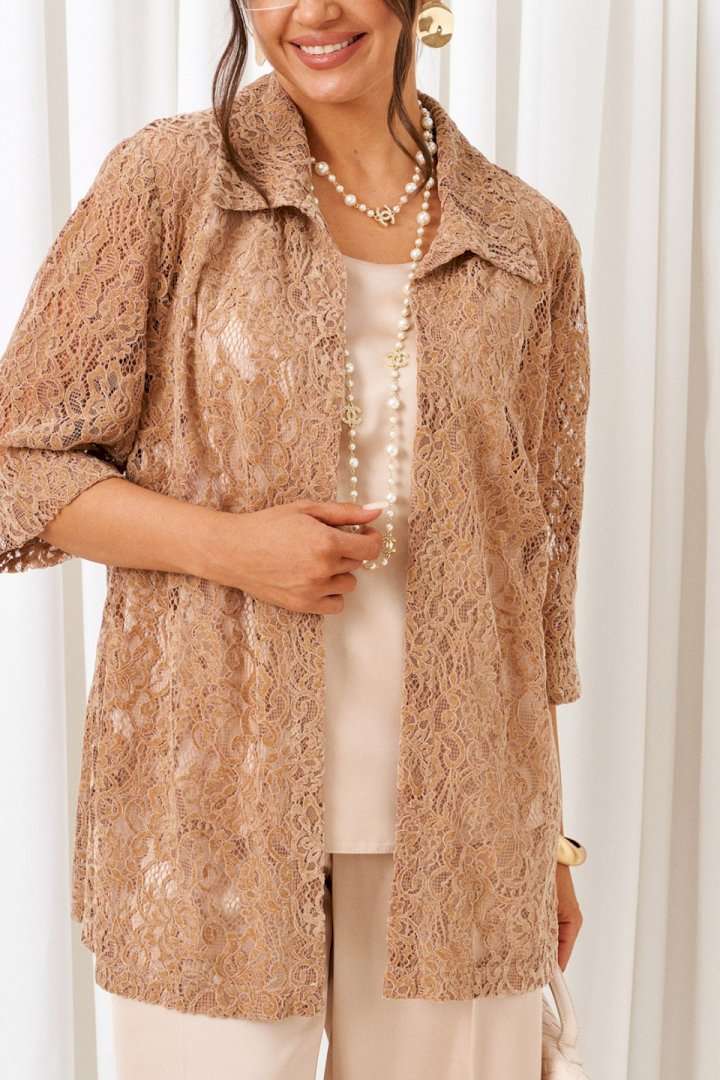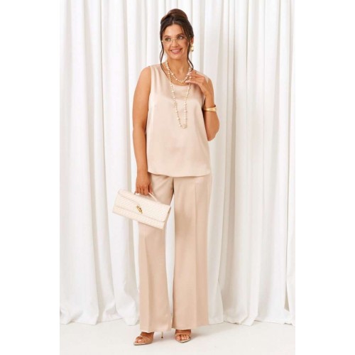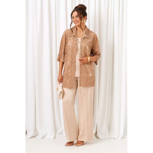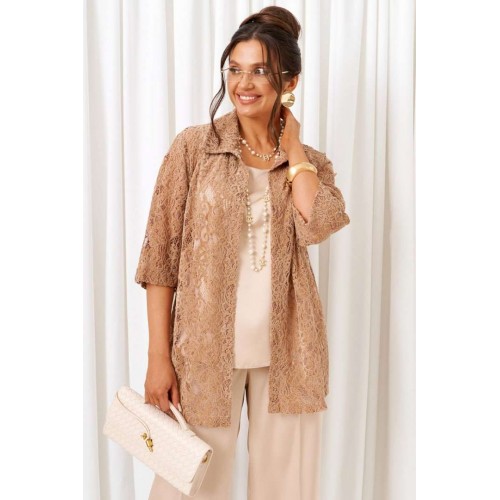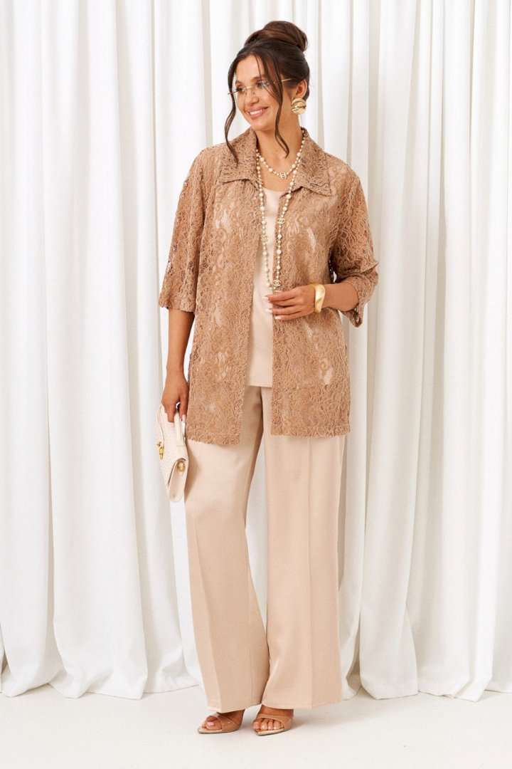 Комплект с блузкой из кружева, брюк и топа – изделие вне времени и трендов, созданное в различных интерпретациях: от оверсайза до классики. Предназначен для повседневного и выходного использования. Найдет применение в любую погоду. Блузка свободного силуэта выполнена из смесового полотна с содержанием вискозы. Передняя часть из двух половинок с нагрудными вытачками от бокового шва. Спинка цельная. Рукав одношовный втачной длиной ¾ свободный. Воротник классический стояче-отложной на цельнокроеной стойке. Без застёжки. Низ изделия ровный, в боковых швах предусмотрены высокие разрезы. Топ полуприлегающего силуэта, выполнен из тонкого смесового вискозного полотна. Перед цельный, с двумя нагрудными вытачками от бокового шва. Спинка цельная. Горловина округлой формы. Низ слегка закруглен к боковым участкам. Брюки длинные, прямые свободные; выполнены из смесового вискозного полотна. Посадка классическая, высокая. Застежка центральная на молнию и петлю с пуговицей на поясе. Спереди расположены боковые функциональные карманы. Пояс притачной, сзади на резинке, шириной 4см. Длина блузки (по середине спинки) ~ 74 см. Длина рукава блузки (от плечевой точки до низа) ~ 41 см. Длина топа (по среднему шву спинки) ~ 62-63 см. Длина брюк (по боковому шву с поясом) ~ 108 см.