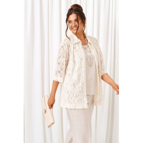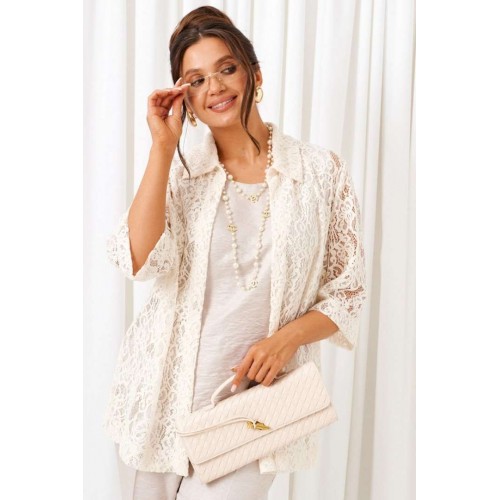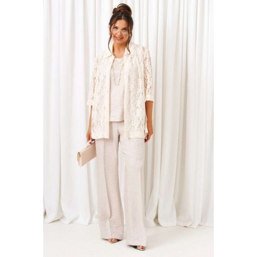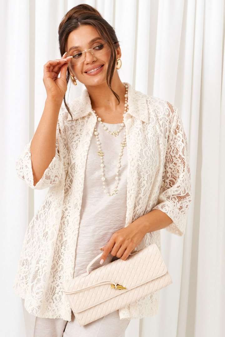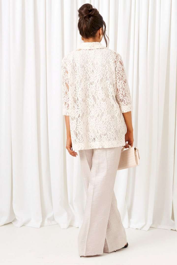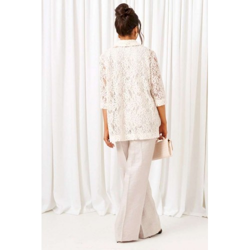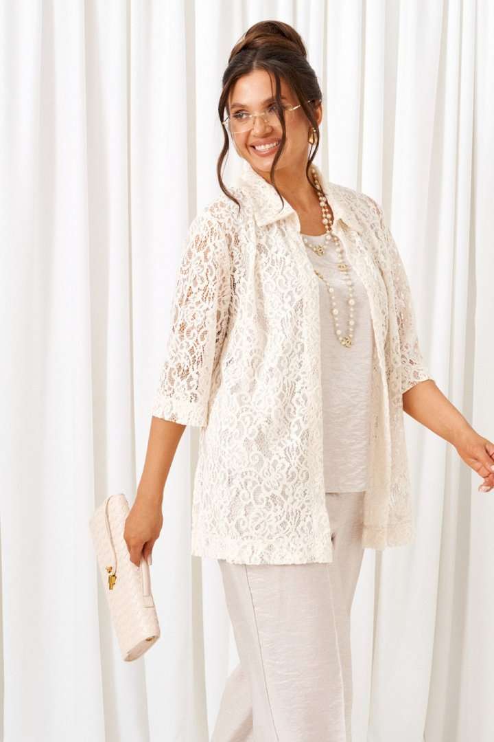 Комплект с блузкой из кружева, брюк и топа – изделие вне времени и трендов, созданное в различных интерпретациях: от оверсайза до классики. Предназначен для повседневного и выходного использования. Найдет применение в любую погоду. Блузка свободного силуэта выполнена из смесового полотна с содержанием вискозы. Передняя часть из двух половинок с нагрудными вытачками от бокового шва. Спинка цельная. Рукав одношовный втачной длиной ¾ свободный. Воротник классический стояче-отложной на цельнокроеной стойке. Без застёжки. Низ изделия ровный, в боковых швах предусмотрены высокие разрезы. Топ полуприлегающего силуэта, выполнен из тонкого смесового вискозного полотна. Перед цельный, с двумя нагрудными вытачками от бокового шва. Спинка цельная. Горловина округлой формы. Низ слегка закруглен к боковым участкам. Брюки длинные, прямые свободные; выполнены из смесового вискозного полотна. Посадка классическая, высокая. Застежка центральная на молнию и петлю с пуговицей на поясе. Спереди расположены боковые функциональные карманы. Пояс притачной, сзади на резинке, шириной 4см. Длина блузки (по середине спинки) ~ 74 см. Длина рукава блузки (от плечевой точки до низа) ~ 41 см. Длина топа (по среднему шву спинки) ~ 62-63 см. Длина брюк (по боковому шву с поясом) ~ 108 см.