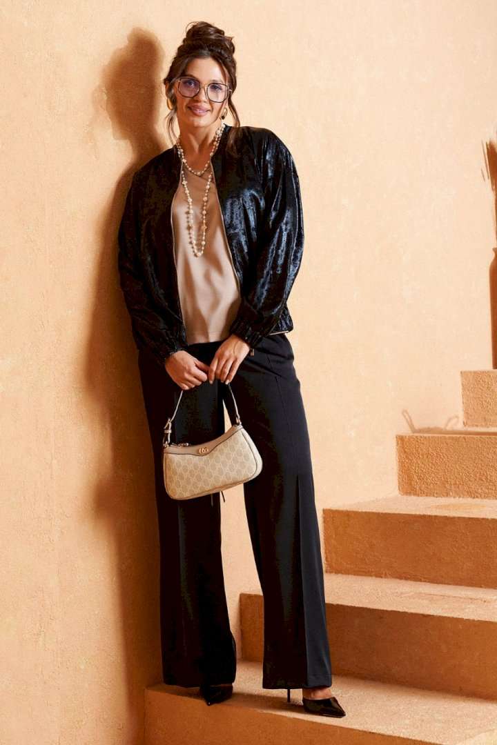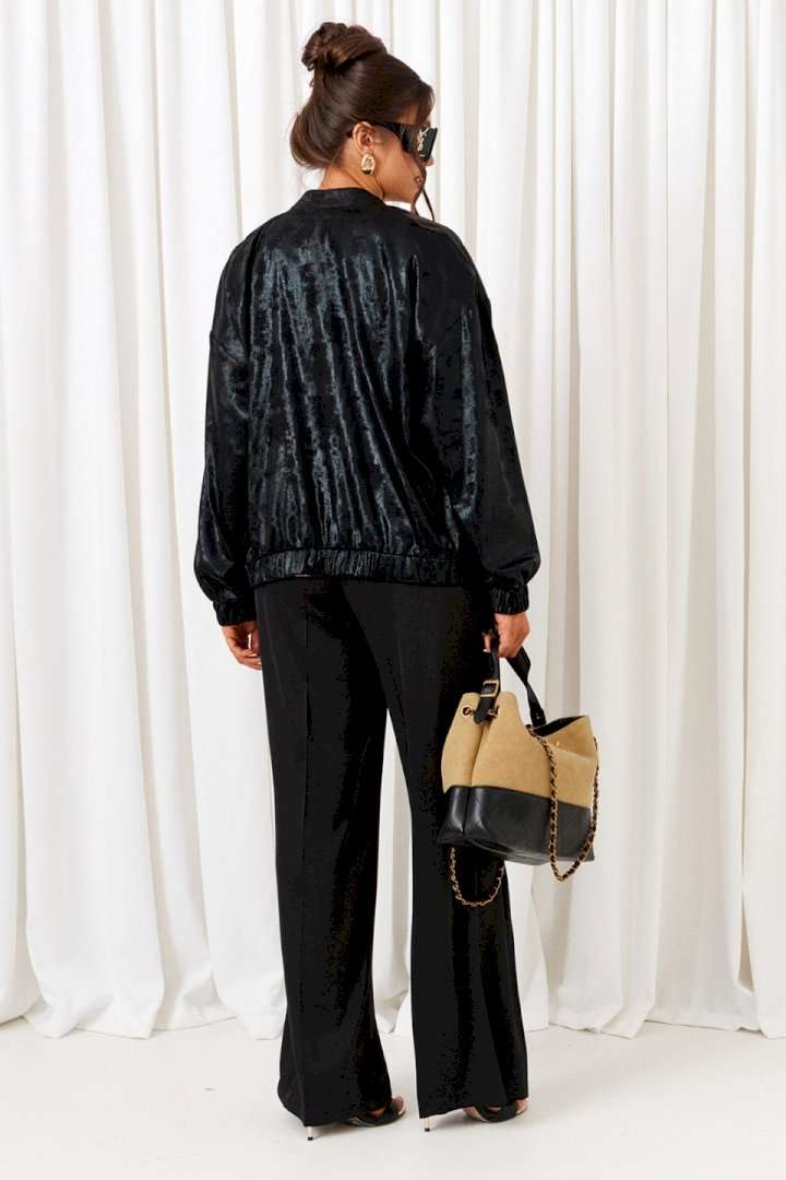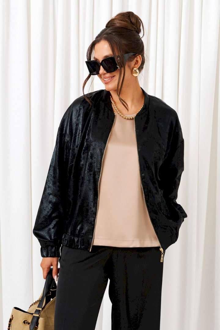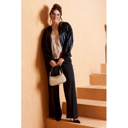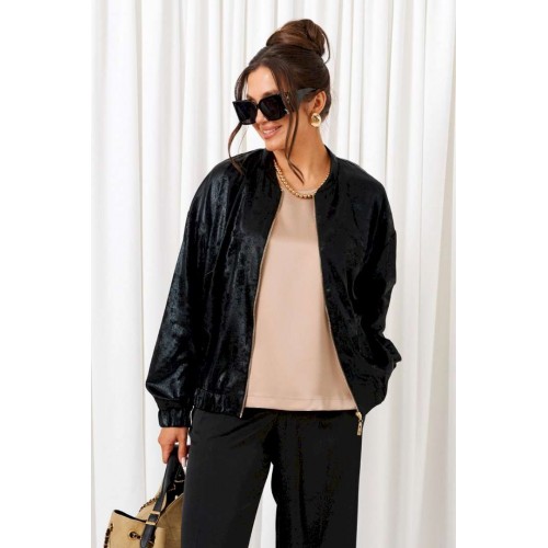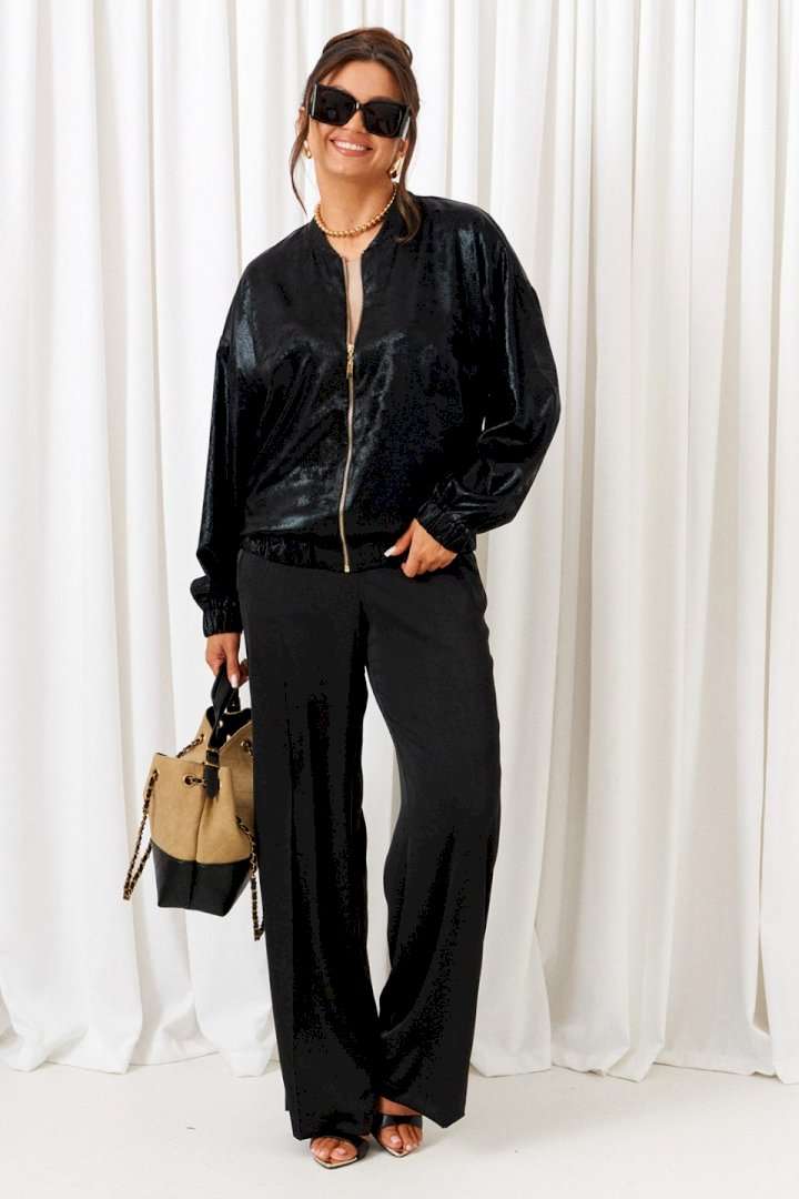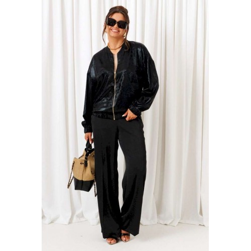 Брючный комплект в комбинации сияющего роскошного атласа с эксклюзивным ворсовым шифоном не останется незаметным! Блузон свободного силуэта тип «бомбер» с удлиненной линией плеча. Перед с нагрудными вытачками от бокового шва. Спинка цельнокроеная. Рукав рубашечный одношовный длинный. Низ рукава обработан притачной манжетой с резинкой. Горловина округлой формы с плосколежащим воротником-стойкой. Застежка центральная на декоративную разъёмную молнию. Нижняя часть блузона обработана планкой с резинкой. Брюки свободного силуэта прямые, с двумя верхними боковыми функциональными карманами. Высота сиденья классическая. Застежка центральная на молнию и на петлю с пуговицей на поясе. Брюки на поясе, в задней части которого для удобного прилегания по талии вставлена резинка. Топ полуприлегающего силуэта. Перед цельный, с двумя нагрудными выточками от бокового шва. Спинка разрезная по среднему шву, в верхней части которого предусмотрен небольшой разрез для застежки на одну навесную петлю с пуговицей; с вытачками на талии. Горловина округлой формы. В боковых швах выполнены разрезы. Длина блузона (по середине спинки) ~ 63 см. Длина рукава блузона (+ плечо) ~ 72,5 см. Длина брюк (по боковому шву с поясом) ~ 108 см. Длина топа (по среднему шву спинки) ~ 60 см.
