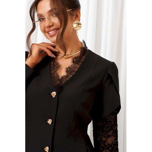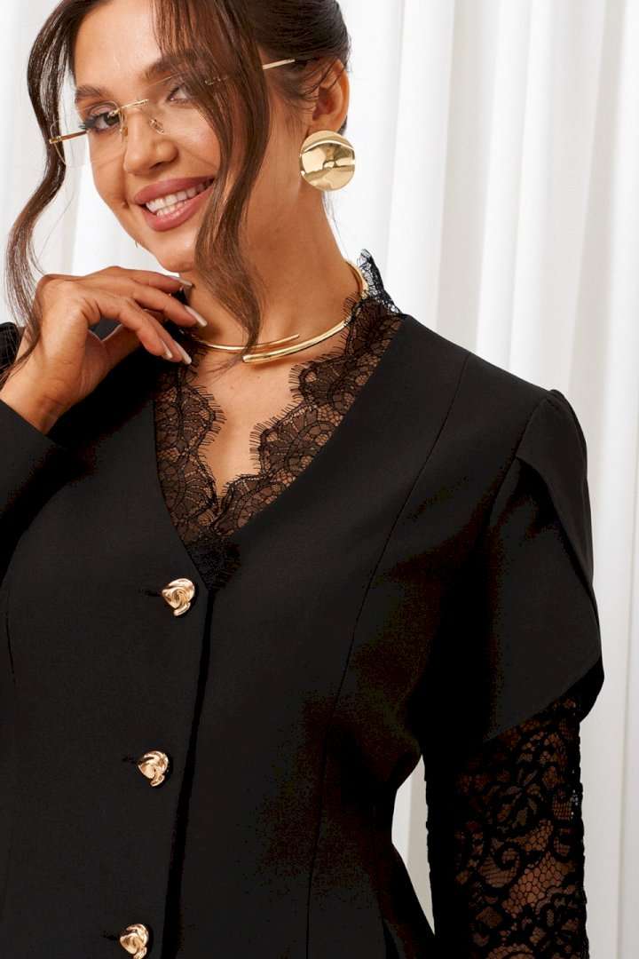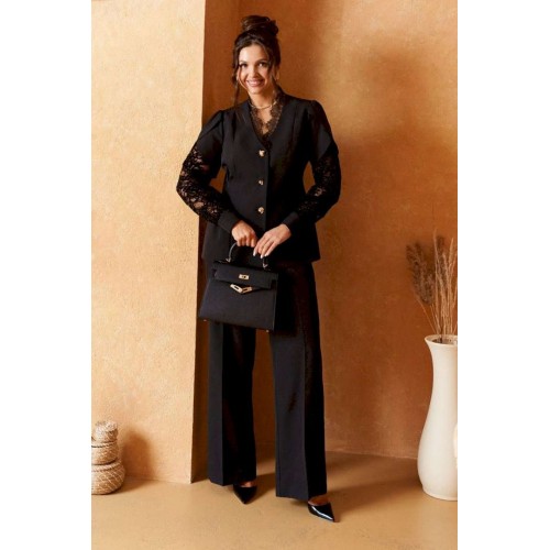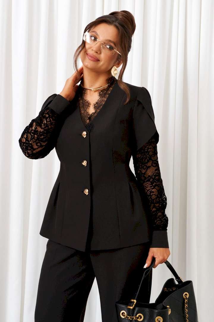 Удобство брючного костюма – неоспоримый факт, проверенный жизнью. Костюм женский 2-ух предметный: жакет и брюки в деловом стиле. Выполнен из костюмного смесового полотна нежной и приятной фактуры с кружевной отделкой. Жакет классический полуприлегающего силуэта длиной ниже бедер. На подкладке. Передняя часть с вертикальными рельефами от плеча. На талии застрочены две дополнительные встречные складки. Спинка с центральным швом и с вертикальными рельефами от плеча. На талии также застрочены две дополнительные встречные складки. Рукав двойной втачной. Верхний - короткий из основной ткани, фантазийный с мягкой сборкой по окату, нижний – длинный из отделочного полотна на притачной манжете и сборкой от нее. Вырез горловины V-образный, оформлен фестонным кружевом в цвет костюма. Низ борта ровный. Застежка центральная однобортная на три петли и пуговицы. Брюки прямого силуэта классической посадки, длинные, с двумя верхними боковыми карманами. Высота сиденья стандартная. Застежка центральная на молнию и на петлю и пуговицу на поясе. В задней части пояса для удобного прилегания по талии вставлена резинка. Длина жакета (по среднему шву спинки) – 67 см. Длина рукава жакета – 62 см. Длина брюк (по боковому шву с поясом) –108 см.