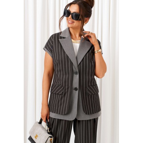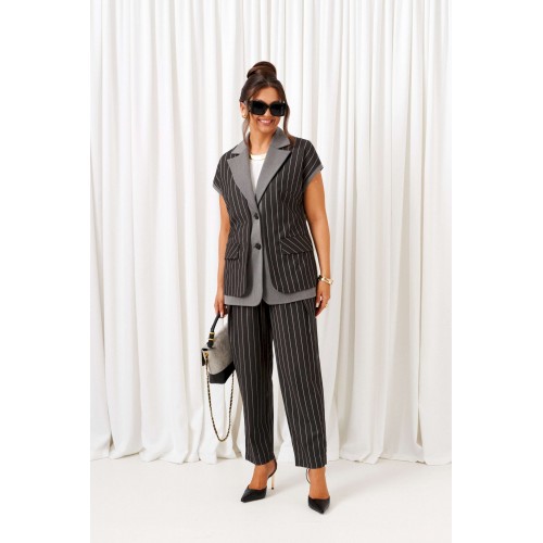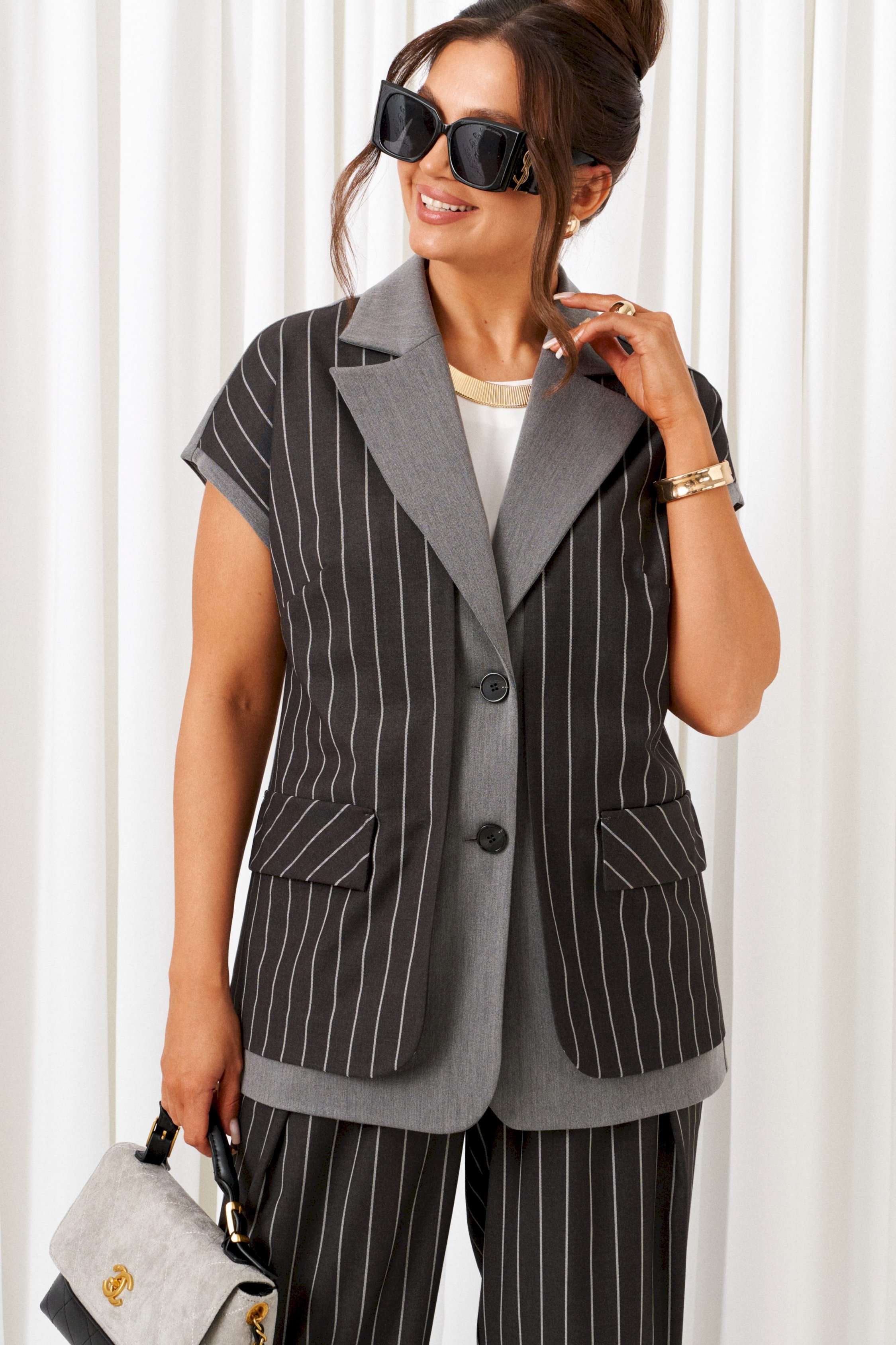 Брючный комплект в комбинации двух полотен компаньонов, дополненный лёгкой блузой не останется незаметным! Жилет полуприлегающего силуэта, имитирующий эффект двойного изделия, с цельнокроеным покроем рукава и удлиненной линией плеча, выполнен из костюмной ткани. Перед с нагрудными вытачками от бокового шва и боковыми накладными клапанами. Спинка со средним швом и вытачками на талии. Воротник отложной пиджачного типа с лацканами. Застежка центральная на две петли и пуговицы. Низ борта округлый. Центральная часть переда, спинка, воротник, лацканы, бейка рукава выполнены из отделочной ткани смежного тона. Брюки свободного силуэта прямые, с двумя верхними боковыми функциональными карманами. Высота сиденья классическая. Застежка центральная на молнию и петлю с пуговицей на поясе. Брюки на поясе, в задней части которого для удобного прилегания по талии вставлена резинка. Блузка полуприлегающего силуэта. Перед цельный, с двумя нагрудными вытачками от бокового шва. Спинка разрезная по среднему шву, в верхней части которого предусмотрен небольшой разрез для застежки на одну навесную петлю с пуговицей; с вытачками на талии. Горловина округлой формы. В боковых швах выполнены разрезы. Длина жилета (по середине спинки) ~ 73 см. Длина рукава жилета (+ плечо) ~ 27,5 см. Длина брюк (по боковому шву с поясом) ~ 108 см. Длина топа (по среднему шву спинки) ~ 60 см.