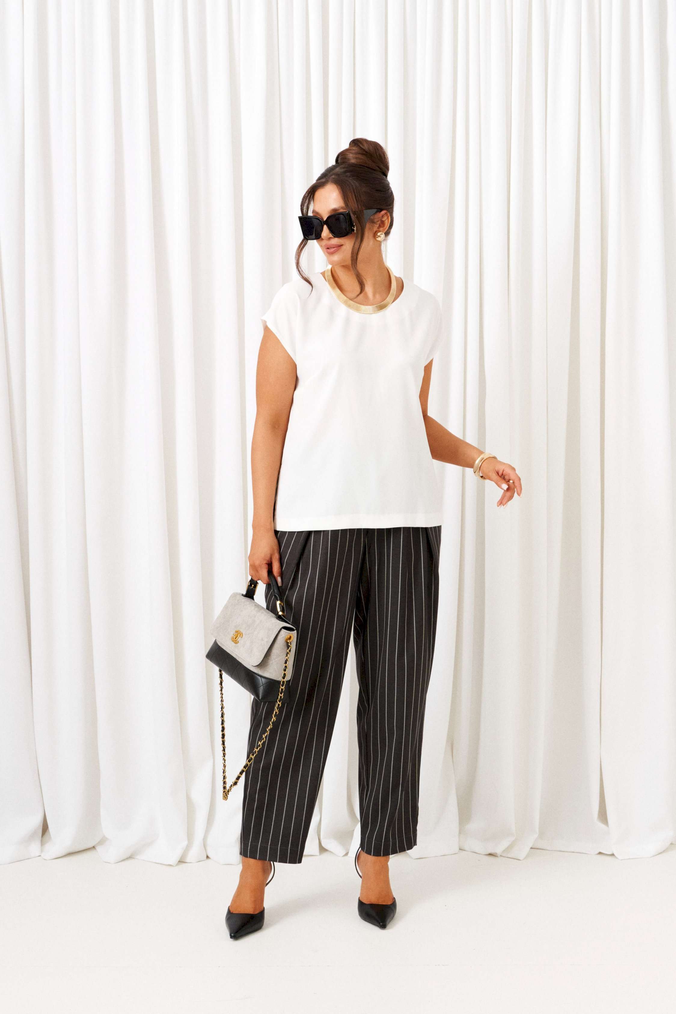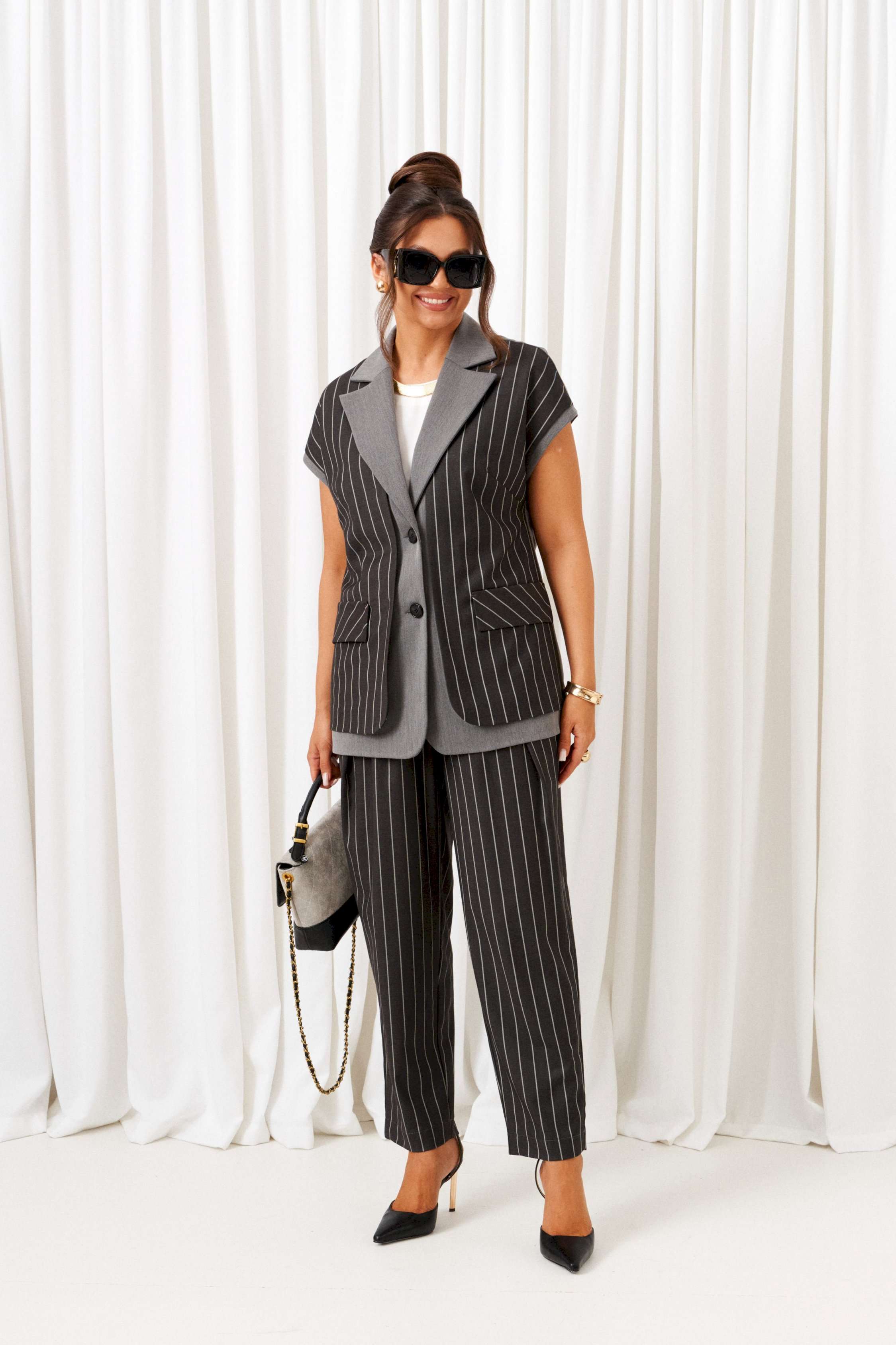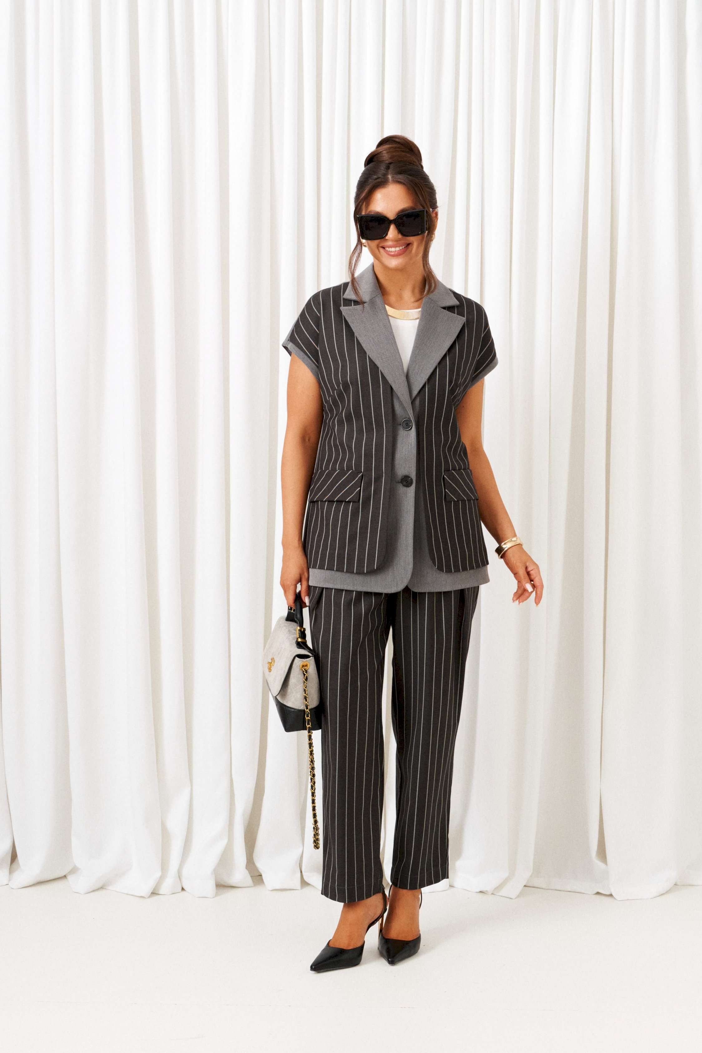 Состав: брюки, жилет – вискоза 64%, пэ 33%, спандекс 3%, блузка – пэ 68%, вискоза 27%, спандекс 5%