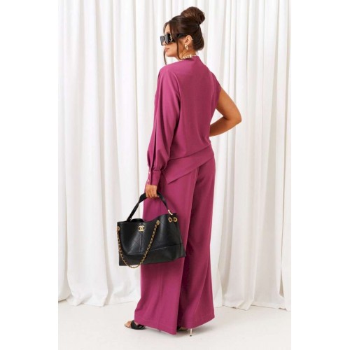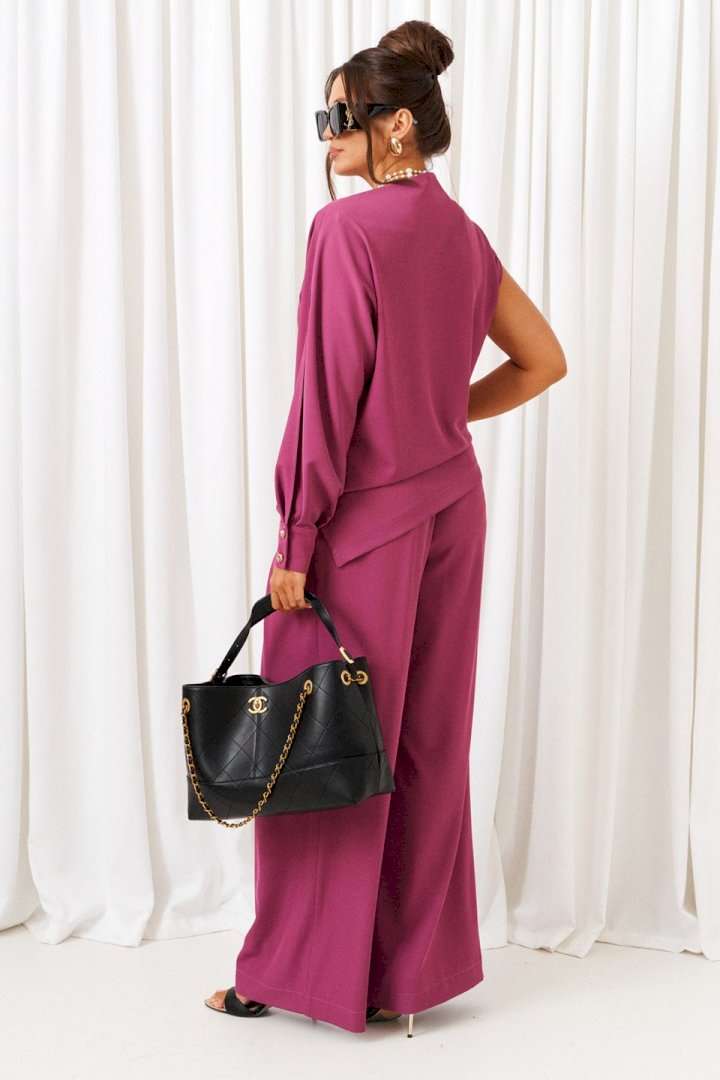 Яркий акцентный костюм - идеальный пример сочетания комфорта и стиля. Нарядно-повседневный костюм, состоящий из блузона и брюк, выполнен из смесовой ткани с содержанием вискозы, подчеркнет индивидуальность и неповторимость образа. Блузон полуприлегающего силуэта асимметричного кроя. Передняя часть цельная, слева с цельнокроеным длинным рукавом и справа с удлиненной линией плеча, чуть приспущенной, мягко закрывающее предплечье. Спинка цельная, слева с цельнокроеным рукавом и справа с удлиненной линией плеча, закрывающее предплечье. Горловина асимметричная: цельнокроеная стойка справа, переходящая слева в плечевую линию. Рукав свободный длинный с мягкими складками по низу и фиксируемый манжетой с двумя декоративными пуговицами. По центральному верхнему шву предусмотрен высокий разрез. Низ асимметричный, заканчивающийся слева в боковом шве небольшим разрезом. Брюки широкие фантазийного кроя со встречной складкой спереди от пояса. Высота посадки стандартная. В верхней части бокового шва предусмотрены функциональные карманы. Застежка боковая на потайную молнию слева. Задняя часть пояса на резинке, что придает изделию дополнительный комфорт при носке. Длина блузона (по середине спинки) ~ 70 см. Длина брюк с поясом ~ 108 см.