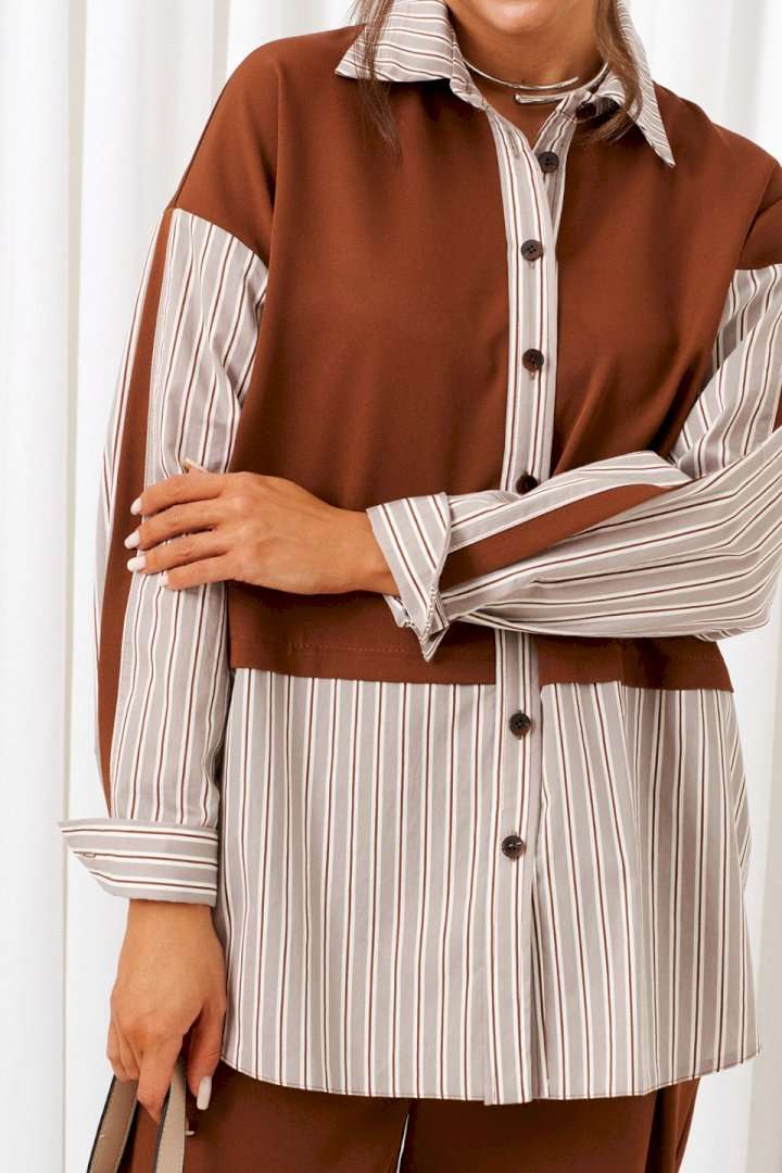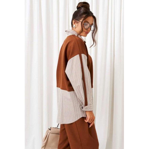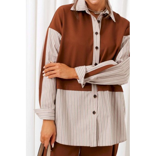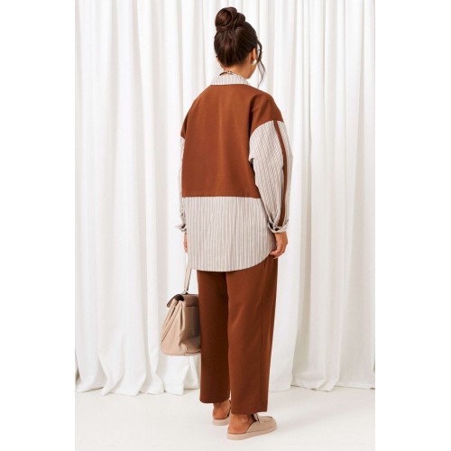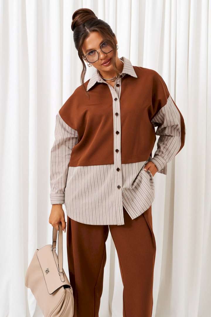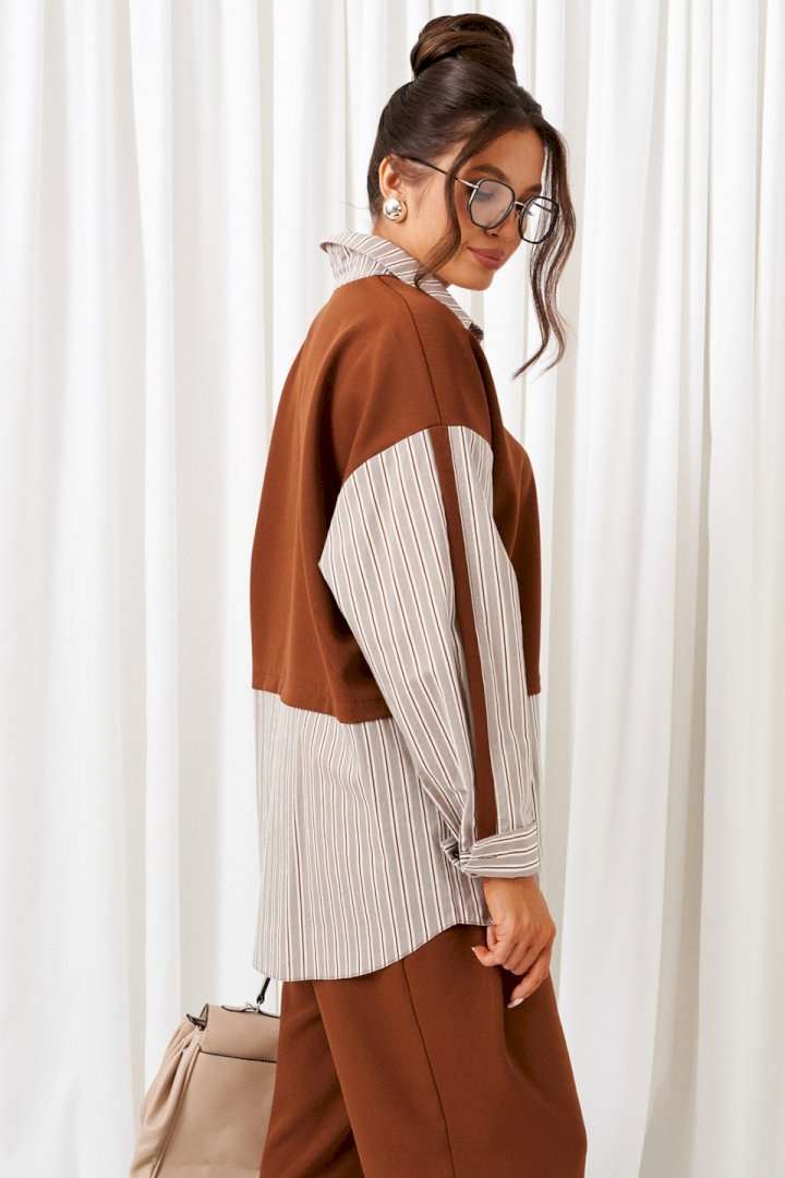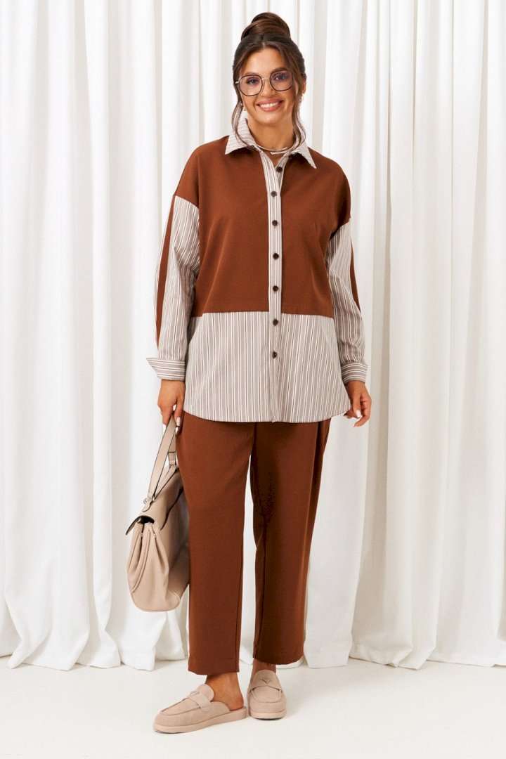 Стильный повседневный женский комплект в винтажном стиле, дополненный акцентными деталями, весьма актуален в будущем сезоне. Предметы комплекта можно смело комбинировать по отдельности с другими вещами гардероба. Комплект состоит из 2-х предметов одежды: рубашки и брюк. Выполнен из костюмной и рубашечной тканей стильного актуального дизайна с содержанием натуральных волокон. Брюки и верхняя часть, имитирующая жилет, из костюмного полотна. Нижняя часть из хлопковой ткани «в полоску». Рубашка прямого силуэта свободного кроя с удлиненной линией плеча. Перед из симметричных деталей, члененных чуть ниже талии. Спинка цельная по середине, но повторяет горизонтальным членением перед. Рукав рубашечный двухшовный полной длины с мягкими складками по низу от притачной манжеты, с возможностью отворота. По центральному верхнему шву располагается отделочная деталь из ткани компаньона. Манжет застегивается на две пуговицы. Застежка передняя центральная на прорезные петли и пуговицы по притачной отделочной планке. Воротник рубашечный стояче-отложной на отрезной стойке. Низ слегка округлой формы с поднятием к боковым участкам. Брюки прямого силуэта свободные вверху и слегка зауженные внизу, длиной до щиколотки, с двумя верхними боковыми карманами и двумя заложенными глубокими складками от пояса спереди. Высота сиденья классическая. Застежка центральная на молнию и на петлю с пуговицей на поясе. Брюки на притачном поясе, в задней части которого для удобного прилегания по талии вставлена резинка. Длина рубашки (по середине спинки) ~ 78 см. Длина рукава рубашки ~ 51 см. Длина брюк с поясом ~ 96 см.