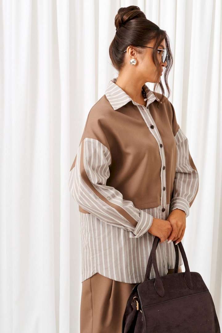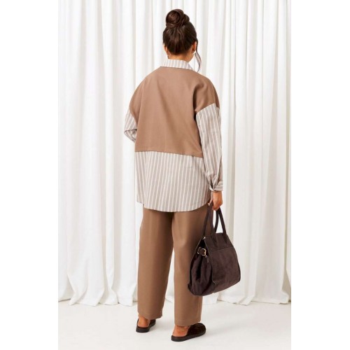 Стильный повседневный женский комплект в винтажном стиле, дополненный акцентными деталями, весьма актуален в будущем сезоне. Предметы комплекта можно смело комбинировать по отдельности с другими вещами гардероба. Комплект состоит из 2-х предметов одежды: рубашки и брюк. Выполнен из костюмной и рубашечной тканей стильного актуального дизайна с содержанием натуральных волокон. Брюки и верхняя часть, имитирующая жилет, из костюмного полотна. Нижняя часть из хлопковой ткани «в полоску». Рубашка прямого силуэта свободного кроя с удлиненной линией плеча. Перед из симметричных деталей, члененных чуть ниже талии. Спинка цельная по середине, но повторяет горизонтальным членением перед. Рукав рубашечный двухшовный полной длины с мягкими складками по низу от притачной манжеты, с возможностью отворота. По центральному верхнему шву располагается отделочная деталь из ткани компаньона. Манжет застегивается на две пуговицы. Застежка передняя центральная на прорезные петли и пуговицы по притачной отделочной планке. Воротник рубашечный стояче-отложной на отрезной стойке. Низ слегка округлой формы с поднятием к боковым участкам. Брюки прямого силуэта свободные вверху и слегка зауженные внизу, длиной до щиколотки, с двумя верхними боковыми карманами и двумя заложенными глубокими складками от пояса спереди. Высота сиденья классическая. Застежка центральная на молнию и на петлю с пуговицей на поясе. Брюки на притачном поясе, в задней части которого для удобного прилегания по талии вставлена резинка. Длина рубашки (по середине спинки) ~ 78 см. Длина рукава рубашки ~ 51 см. Длина брюк с поясом ~ 96 см.