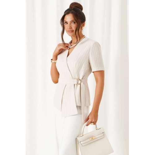 Комплект женский 2-ух предметный: жакет и брюки в деловом стиле. Выполнен из льняного полотна с содержанием вискозной нити. Жакет прилегающего силуэта на подкладке. Передняя часть с горизонтальным подрезом в виде декоративного пояса. Верхняя часть переда с двумя боковыми рельефами и дополнительными вытачками на уровне талии. Нижняя часть переда с декоративными подрезными вставками. Спинка разрезная по среднему шву и с дополнительными вытачками на линии талии и горловины. V- образный вырез горловины. Рукав короткий втачной одношовный. Застежка двубортная на декоративные пряжку в виде полуколец и пояс, и потайные петлю и пуговицу. Брюки классические, свободные с боковыми подрезами, имитирующими карманы. Посадка классическая. В задней части пояса для удобства использования вставлена резинка. Застежка центральная на молнию и петлю с пуговицей на поясе. Длина жакета (по среднему шву спинки) – 60 см. Длина рукава – 26,5 см. Длина брюк (по боковому шву с поясом) –108 см.