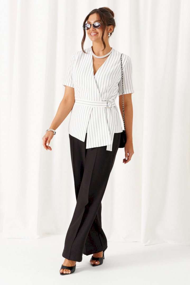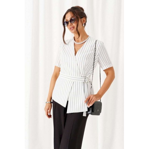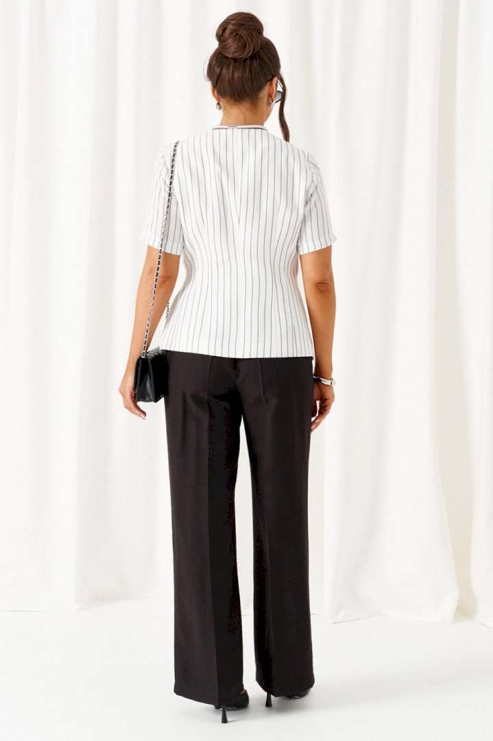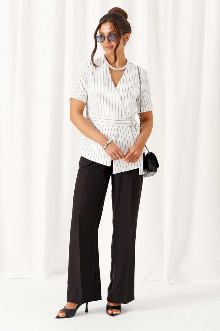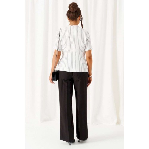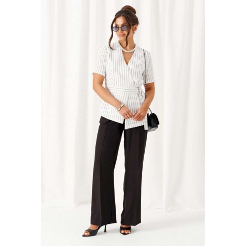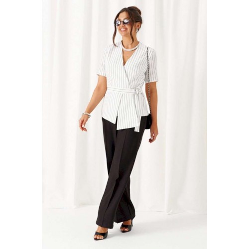 Комплект женский 2-ух предметный: жакет и брюки в деловом стиле. Выполнен из льняного полотна с содержанием вискозной нити. Жакет прилегающего силуэта на подкладке. Передняя часть с горизонтальным подрезом в виде декоративного пояса. Верхняя часть переда с двумя боковыми рельефами и дополнительными вытачками на уровне талии. Нижняя часть переда с декоративными подрезными вставками. Спинка разрезная по среднему шву и с дополнительными вытачками на линии талии и горловины. V- образный вырез горловины. Рукав короткий втачной одношовный. Застежка двубортная на декоративные пряжку в виде полуколец и пояс, и потайные петлю и пуговицу. Брюки классические, свободные с боковыми подрезами, имитирующими карманы. Посадка классическая. В задней части пояса для удобства использования вставлена резинка. Застежка центральная на молнию и петлю с пуговицей на поясе. Длина жакета (по среднему шву спинки) – 60 см. Длина рукава – 26,5 см. Длина брюк (по боковому шву с поясом) –108 см.