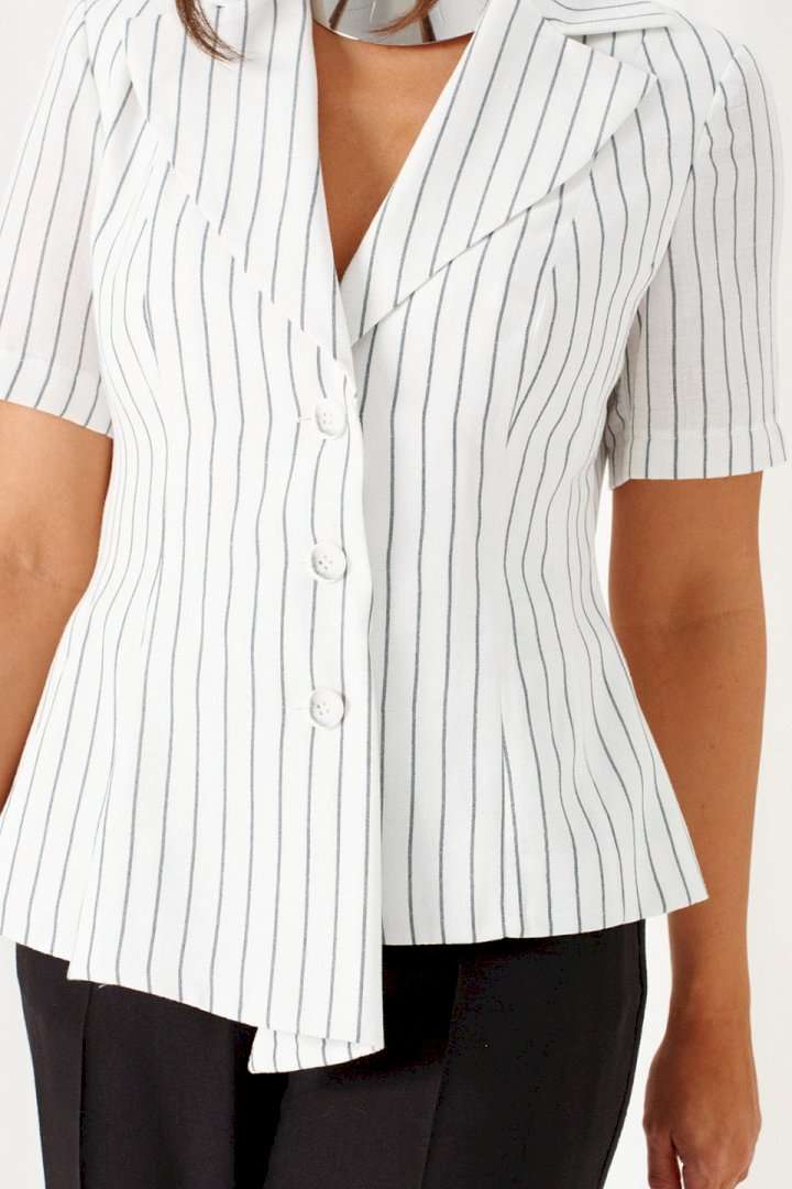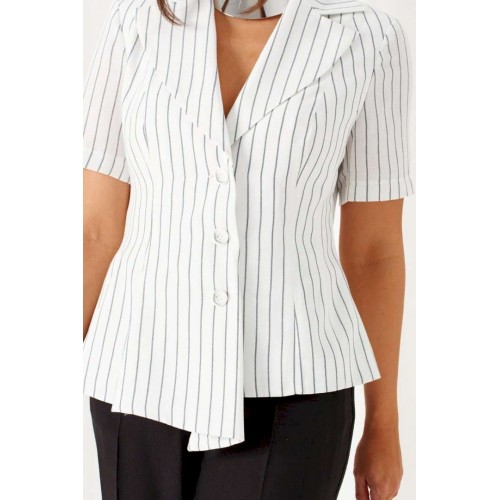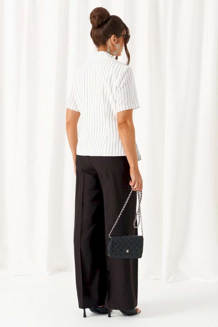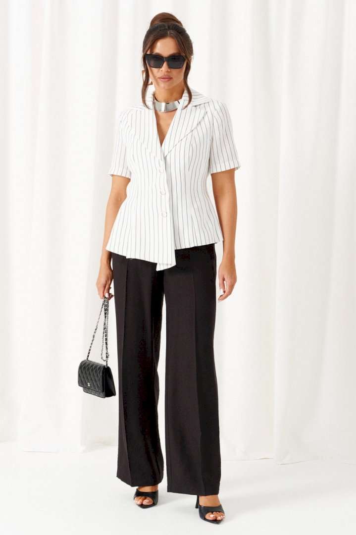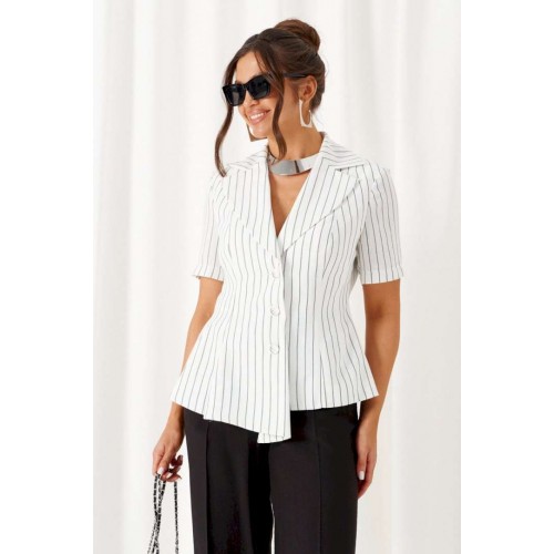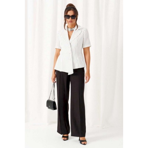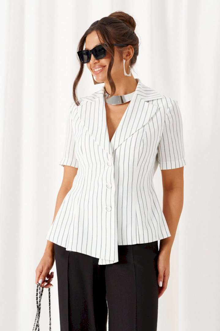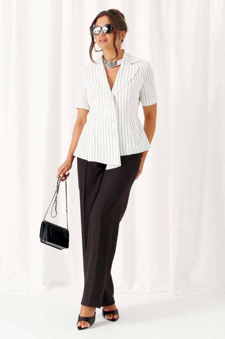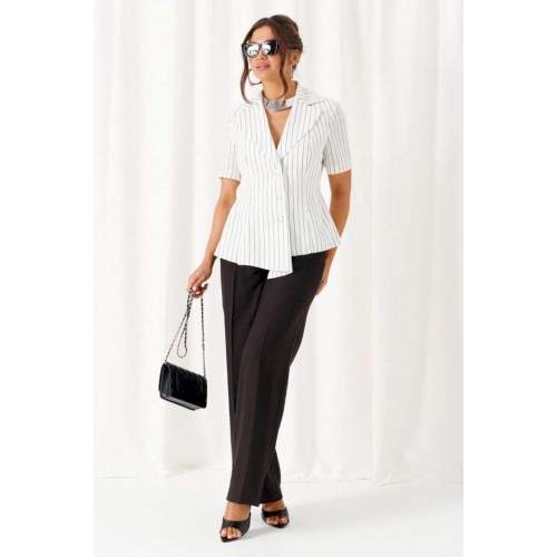 Деловой женский костюм 2-ка, состоящий из предметов: жакета и брюк. Жакет выполнен из льняного полотна с содержанием вискозной нити. Жакет однобортный прилегающего силуэта, на подкладке. Передняя часть жакета с двумя боковыми рельефными подрезами. Правая часть переда расширена к низу в виде складок по рельефным линиям и борту. Спинка разрезная по среднему шву и двумя дополнительными вертикальными рельефами. Воротник классический пиджачного типа с лацканами. Застежка центральная, на три петли и большие декоративные пуговицы. Рукав короткий, втачной, одношовный. Брюки классические, свободные с боковыми подрезами, имитирующими карманы. Посадка классическая. В задней части пояса для удобства использования вставлена резинка. Застежка центральная на молнию и петлю с пуговицей на поясе. Длина жакета (по среднему шву спинки) – 55 см. Длина рукава – 25 см. Длина брюк (по боковому шву с поясом) – 108 см.