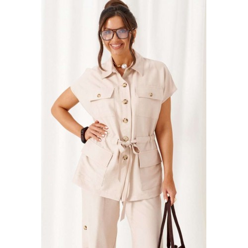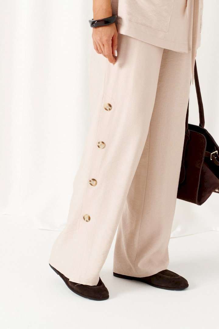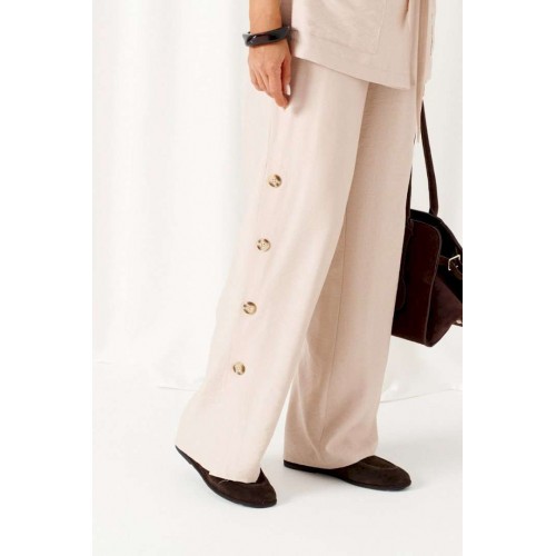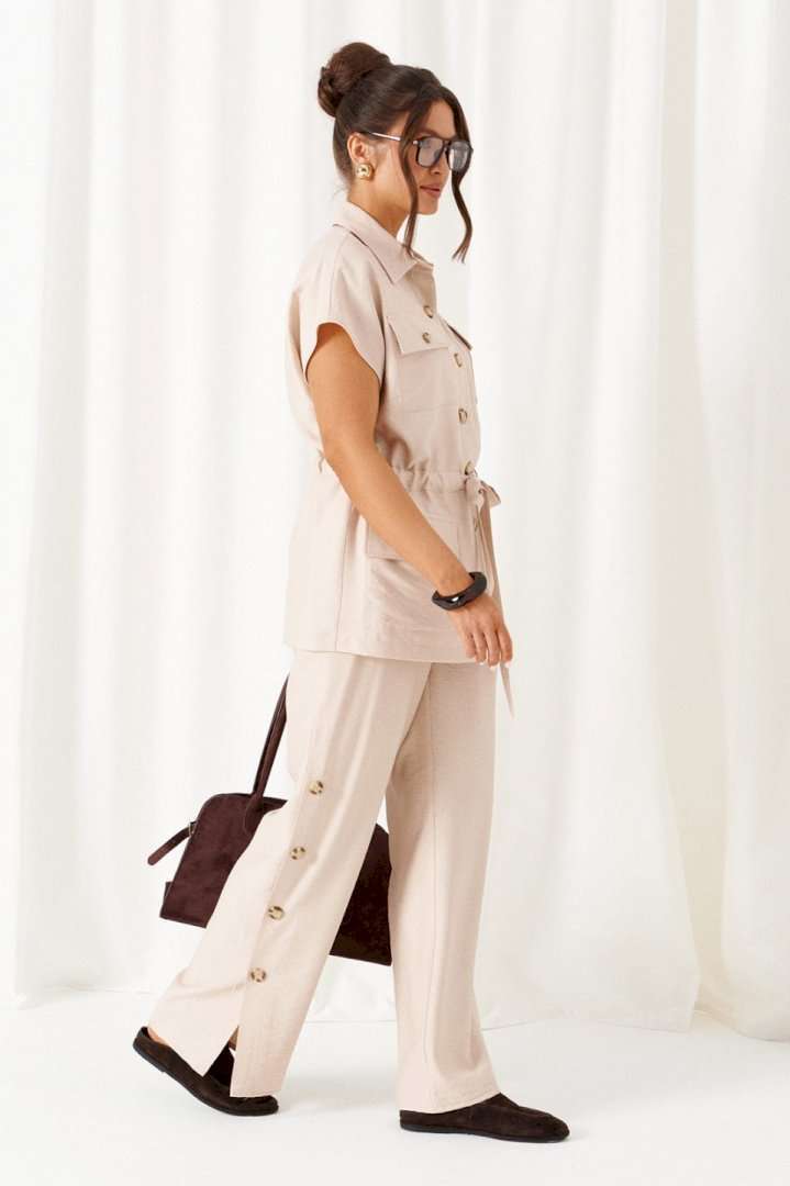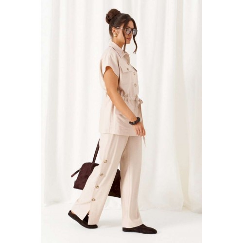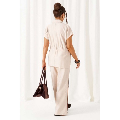Женский льняной костюм из смесовой ткани с натуральным составом, акцентные накладные карманы и безупречные любимые оттенки. Созданный в расслабленном крое с подчеркнутыми деталями, костюм позволит чувствовать себя комфортно и непринужденно. Стильный костюм состоит из жакета-рубашки и брюк, выполнен из мягкой ткани с волокнами льна и вискозы, практичен в носке. Жакет свободного силуэта, удлиненный с кулисой и пояском-завязкой. Передняя часть из двух половинок, с нагрудными вытачками от бокового шва и накладными верхними и нижними функциональными карманами с клапанами. Спинка разрезная со средним швом. Воротник классический стояче-отложной на отрезной стойке. Линия плеча удлиненная, спущенная, переходящая в цельнокроеный рукав. Застежка центральная на петли и пуговицы. Низ прямой. Брюки длинные, прямые свободные. Посадка стандартная. В боковом шве на одной брючине ниже уровня колена выполнена шлица с закреплением на декоративные пуговицы, вторая брючина классического кроя. Пояс притачной, шириной 4см с эластичной тесьмой по кругу. длина жакета (по среднему шву спинки) - 72 см. длина брюк (по боковому шву с поясом) – 108 см.