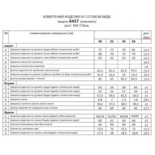 Комплект женский 3-х предметный: жакет, брюки, блузка. Предназначен для повседневного использования. Жакет свободного силуэта выполнен из смесового полотна с содержанием натуральных волокон. Передняя часть цельнокроеная. На нижней части переда предусмотрены функциональные, прорезные карманы. Спинка разрезная по среднему шву. Рукав «летучая мышь» длинный. Низ рукава обработан притачной манжетой шириной ~ 6,5 см. Воротник комбинированный: стойка в верхней части и лацканы в нижней. Без застежки. Низ изделия неровный: перед короче спинки на 2-3 см., с плавным переходом через боковой шов. Блузка полуприлегающего силуэта, выполнена из тонкого смесового вискозного полотна. Перед цельный двухслойный, с двумя нагрудными вытачками от бокового шва. Спинка цельная однослойная. Горловина округлой формы. Низ ровный прямой. Брюки длинные, слегка заужены к низу; в спортивном стиле; выполнены из смесового полотна с содержанием натуральных волокон. Посадка классическая, высокая. Без застежки. Спереди расположены боковые функциональные карманы со складками, придающие объём. Пояс на резинке, шириной 4см., с отделочной строчкой по середине. Длина жакета (по среднему шву спинки) ~ 61,5 см. Длина рукава жакета (от плечевой до низа) ~ 65 см. Длина блузки (по среднему шву спинки) ~ 60 см. Длина брюк (по боковому шву с поясом) ~ 103 см.