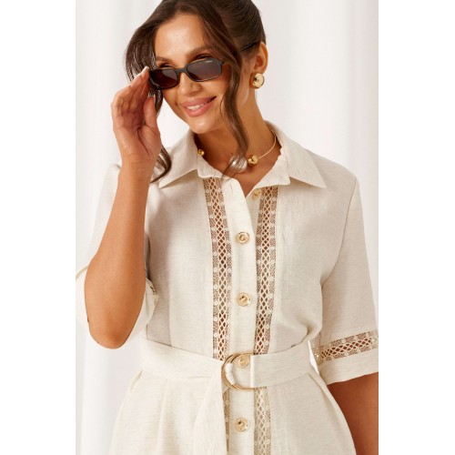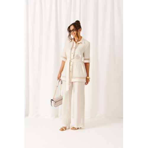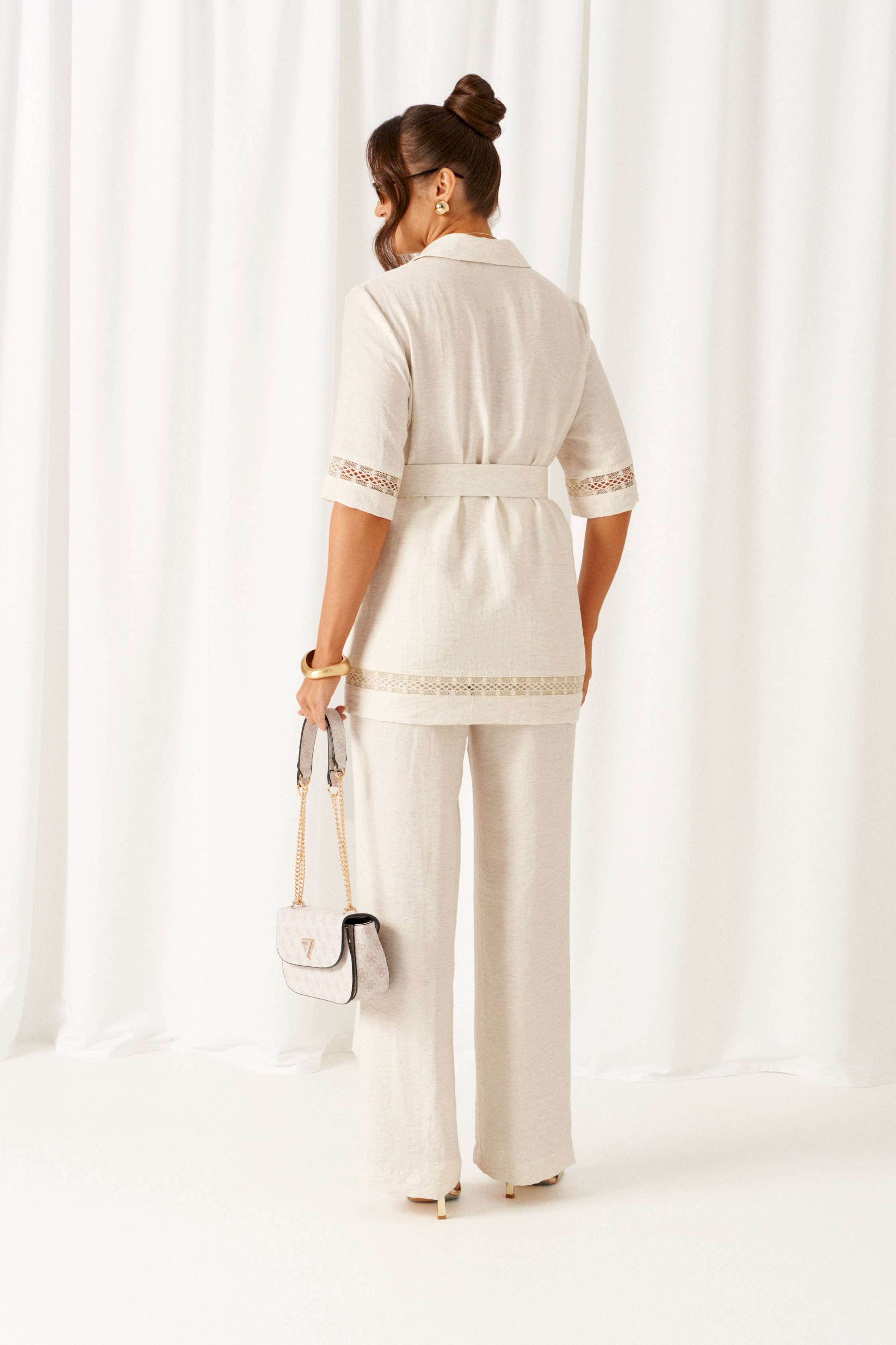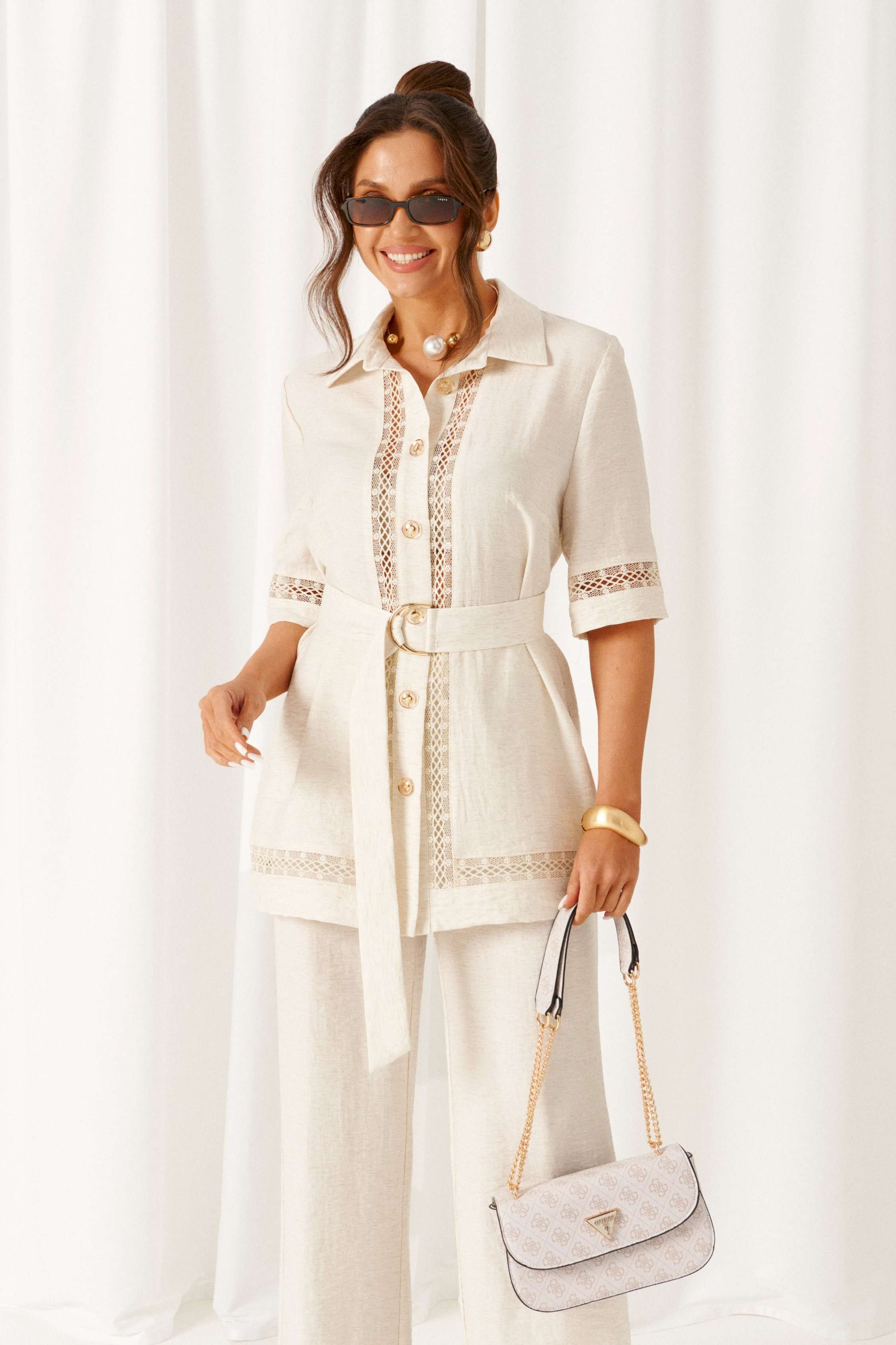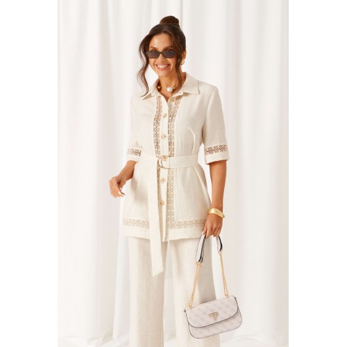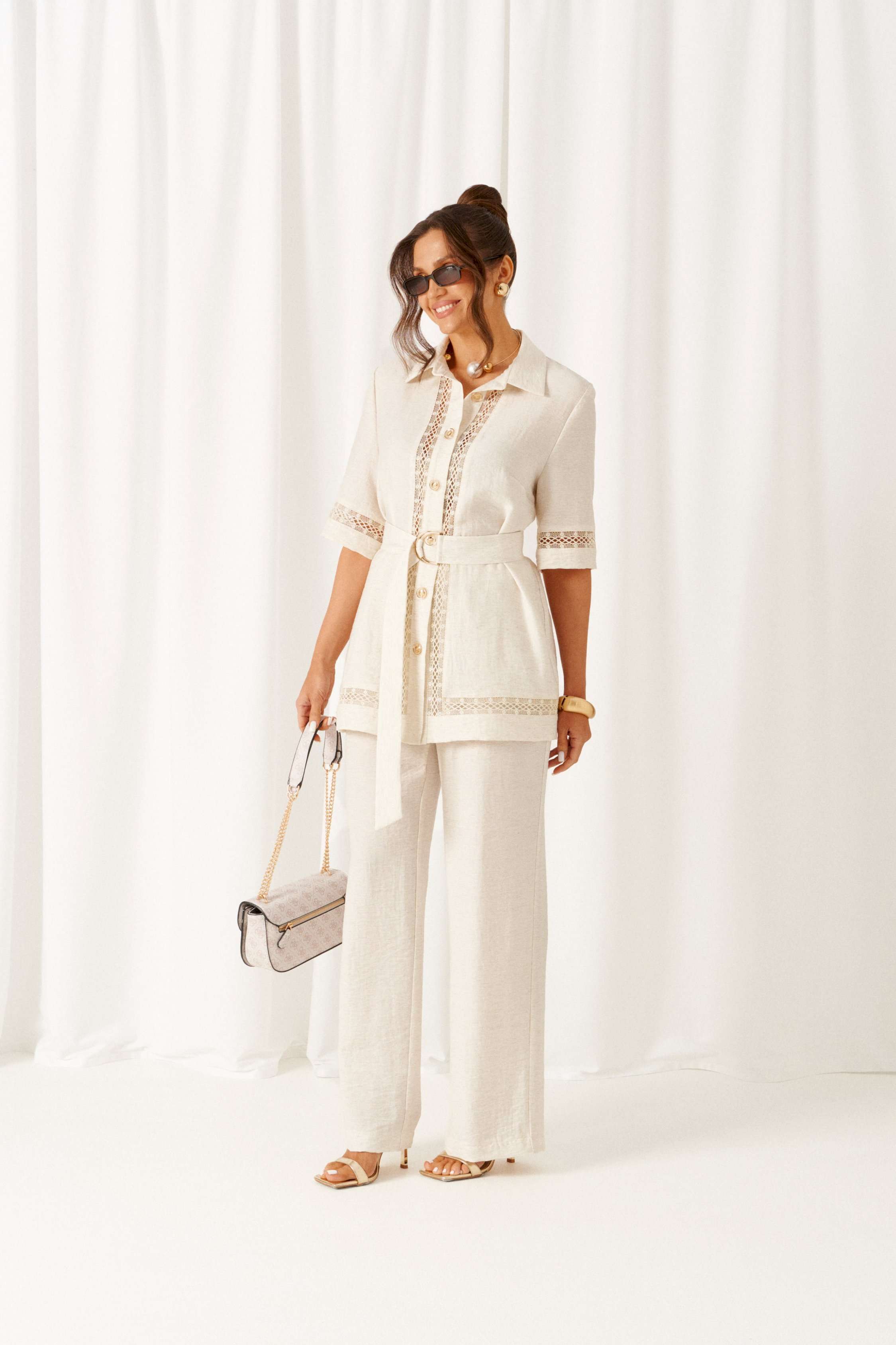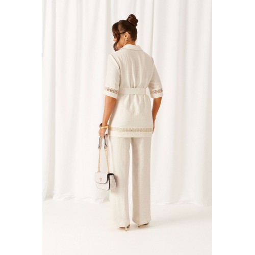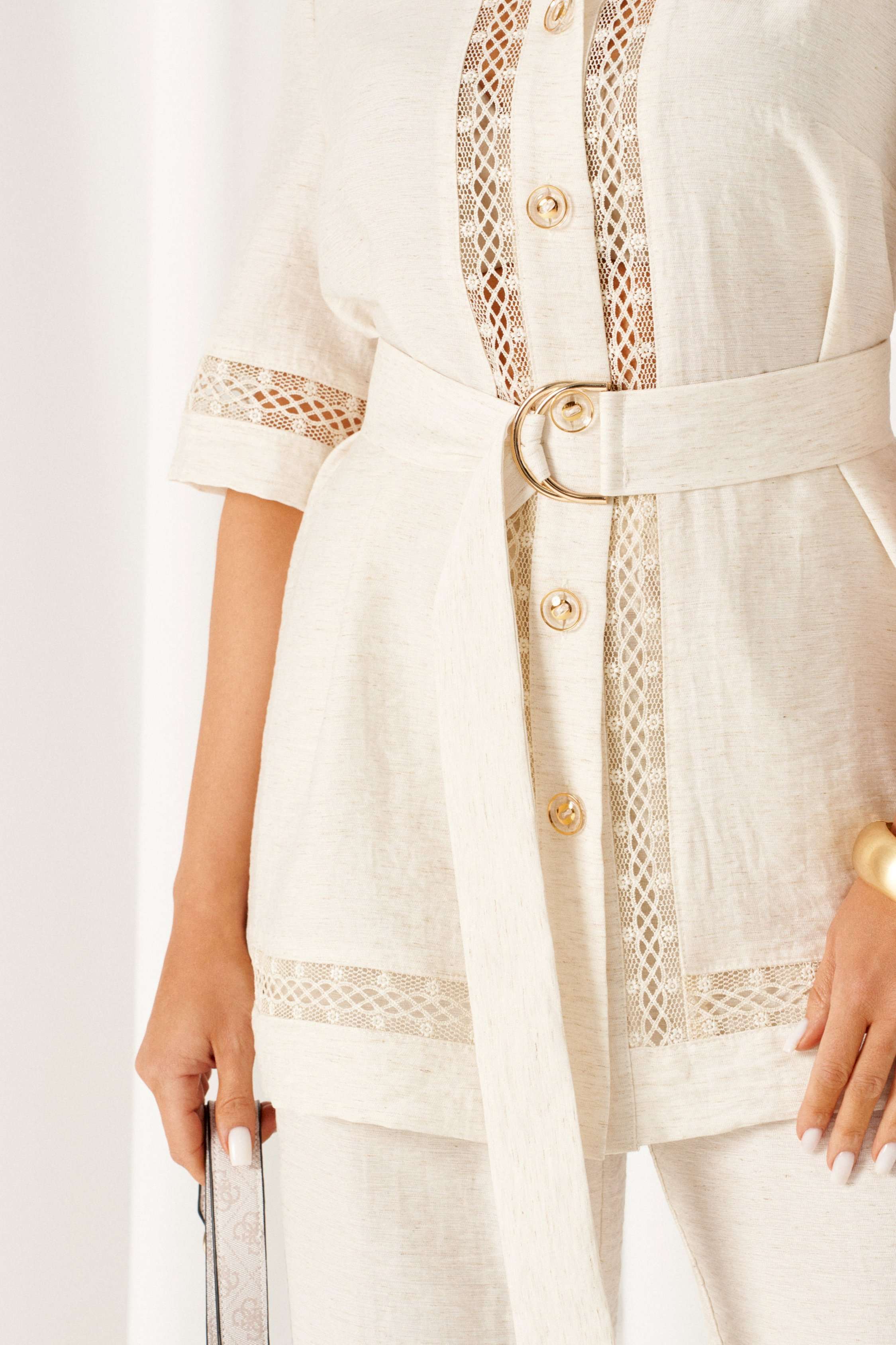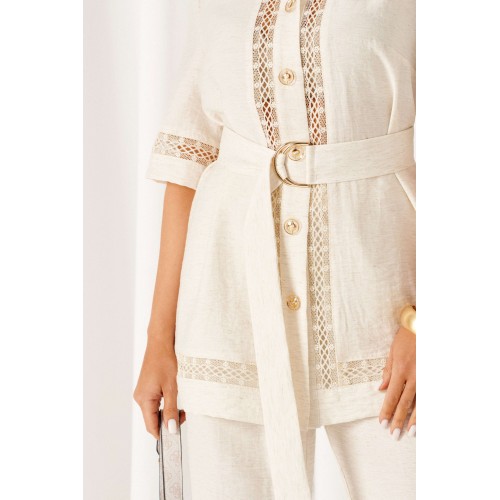 Женский льняной костюм из смесовой ткани с натуральным составом, акцентные кружевные детали и безупречные любимые оттенки. Созданный в расслабленном крое с подчеркнутыми деталями, костюм позволит чувствовать себя комфортно и непринужденно. Стильный костюм состоит из блузы и брюк, выполнен из мягкой ткани с волокнами льна и вискозы, практичен в носке. Блуза полуприлегающего силуэта, длиной до середины бедра с пояском-завязкой. Передняя часть из двух половинок, с нагрудными вытачками от бокового шва и вставками из кружева по борту и низу. Спинка цельная, низ отделан кружевной тесьмой аналогично переду. Воротник классический стояче-отложной на отрезной стойке. Рукав втачной, одношовный длиной до локтя, по низу вставлена отделочная кружевная тесьма. Застежка центральная на петли и пуговицы. Низ прямой. Брюки длинные, прямые свободные. Посадка стандартная, крой классический. Пояс притачной, шириной 4см с эластичной тесьмой по кругу. длина блузы (по среднему шву спинки) - 72 см. длина рукава блузы – 33 см. длина брюк (по боковому шву с поясом) – 108 см.