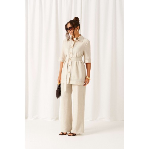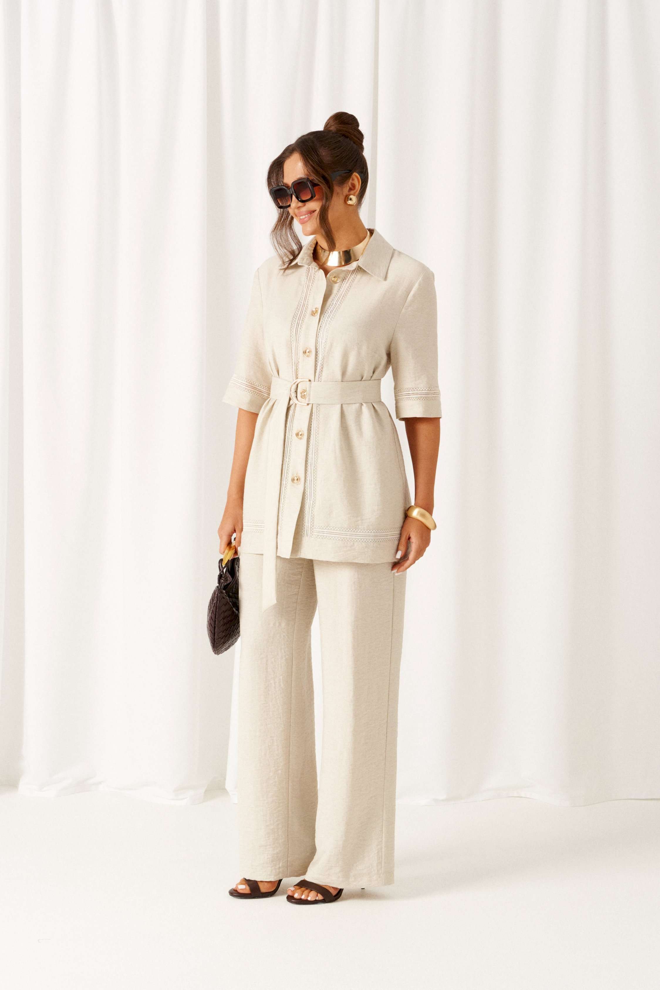 Женский льняной костюм из смесовой ткани с натуральным составом, акцентные кружевные детали и безупречные любимые оттенки. Созданный в расслабленном крое с подчеркнутыми деталями, костюм позволит чувствовать себя комфортно и непринужденно. Стильный костюм состоит из блузы и брюк, выполнен из мягкой ткани с волокнами льна и вискозы, практичен в носке. Блуза полуприлегающего силуэта, длиной до середины бедра с пояском-завязкой. Передняя часть из двух половинок, с нагрудными вытачками от бокового шва и вставками из кружева по борту и низу. Спинка цельная, низ отделан кружевной тесьмой аналогично переду. Воротник классический стояче-отложной на отрезной стойке. Рукав втачной, одношовный длиной до локтя, по низу вставлена отделочная кружевная тесьма. Застежка центральная на петли и пуговицы. Низ прямой. Брюки длинные, прямые свободные. Посадка стандартная, крой классический. Пояс притачной, шириной 4см с эластичной тесьмой по кругу. длина блузы (по среднему шву спинки) - 72 см. длина рукава блузы – 33 см. длина брюк (по боковому шву с поясом) – 108 см.