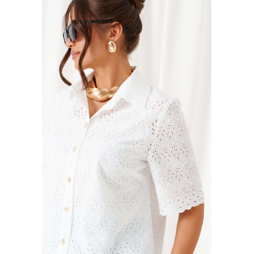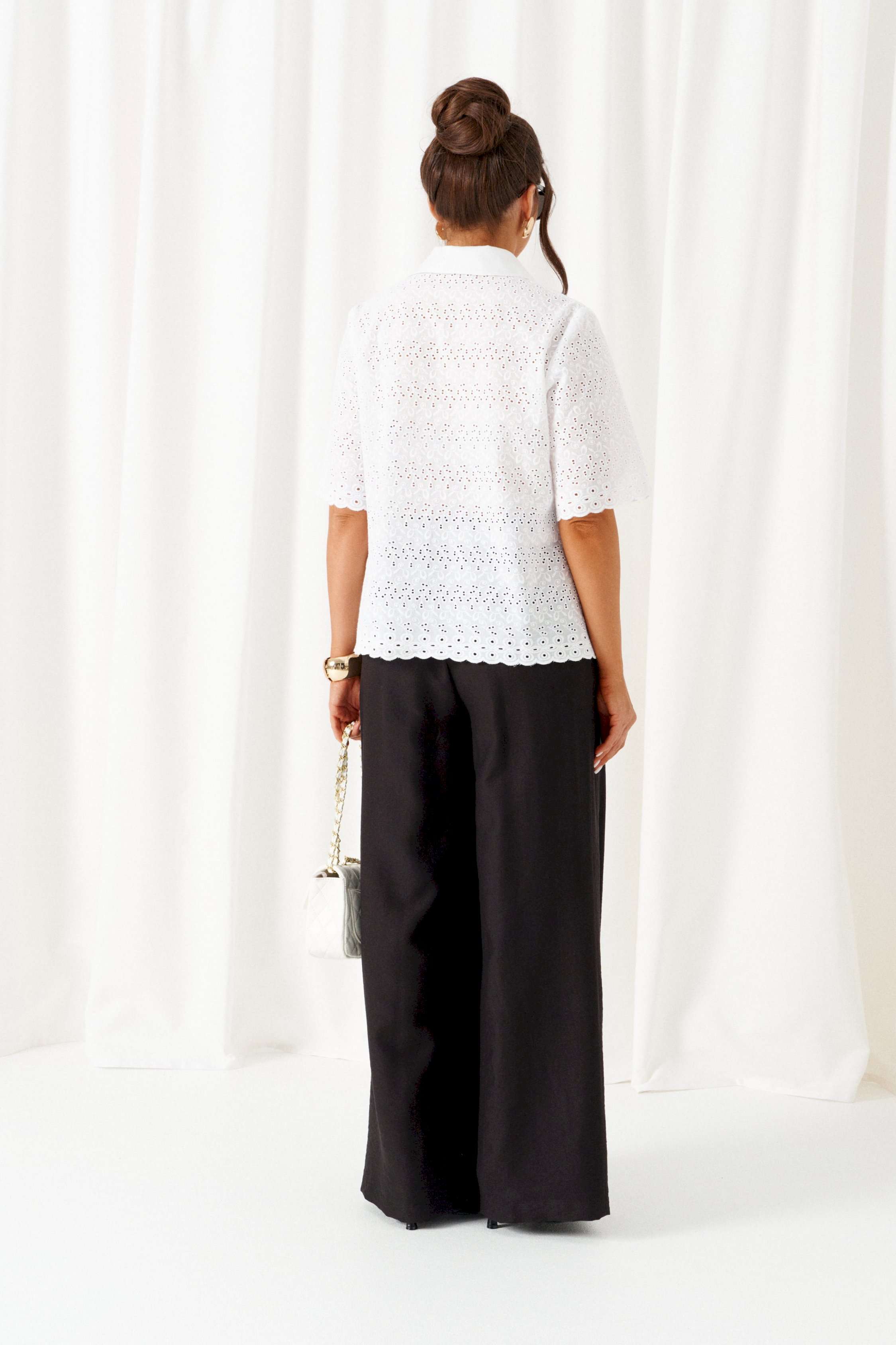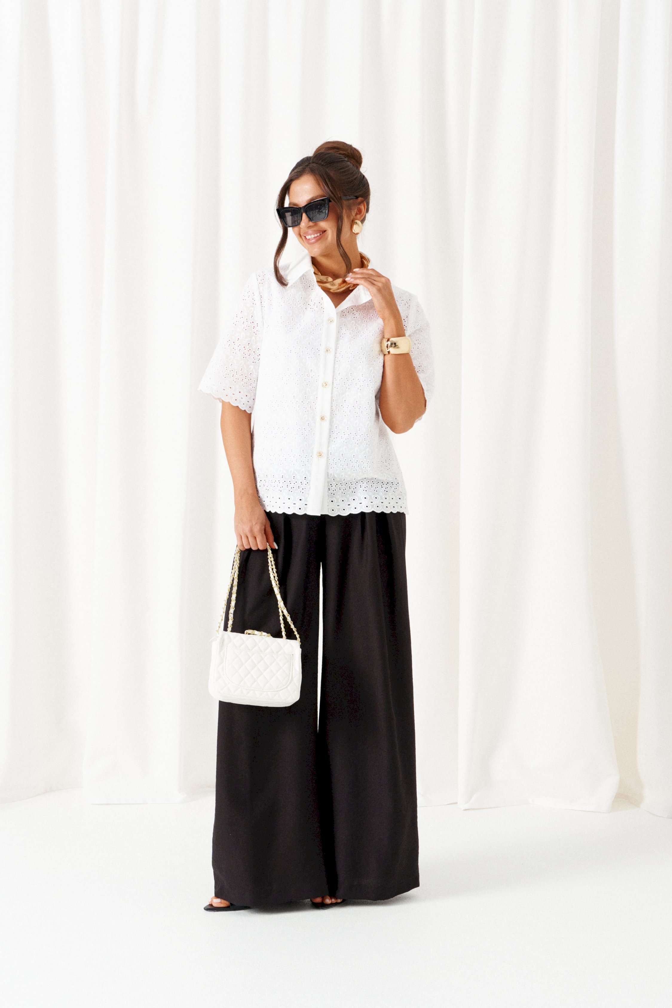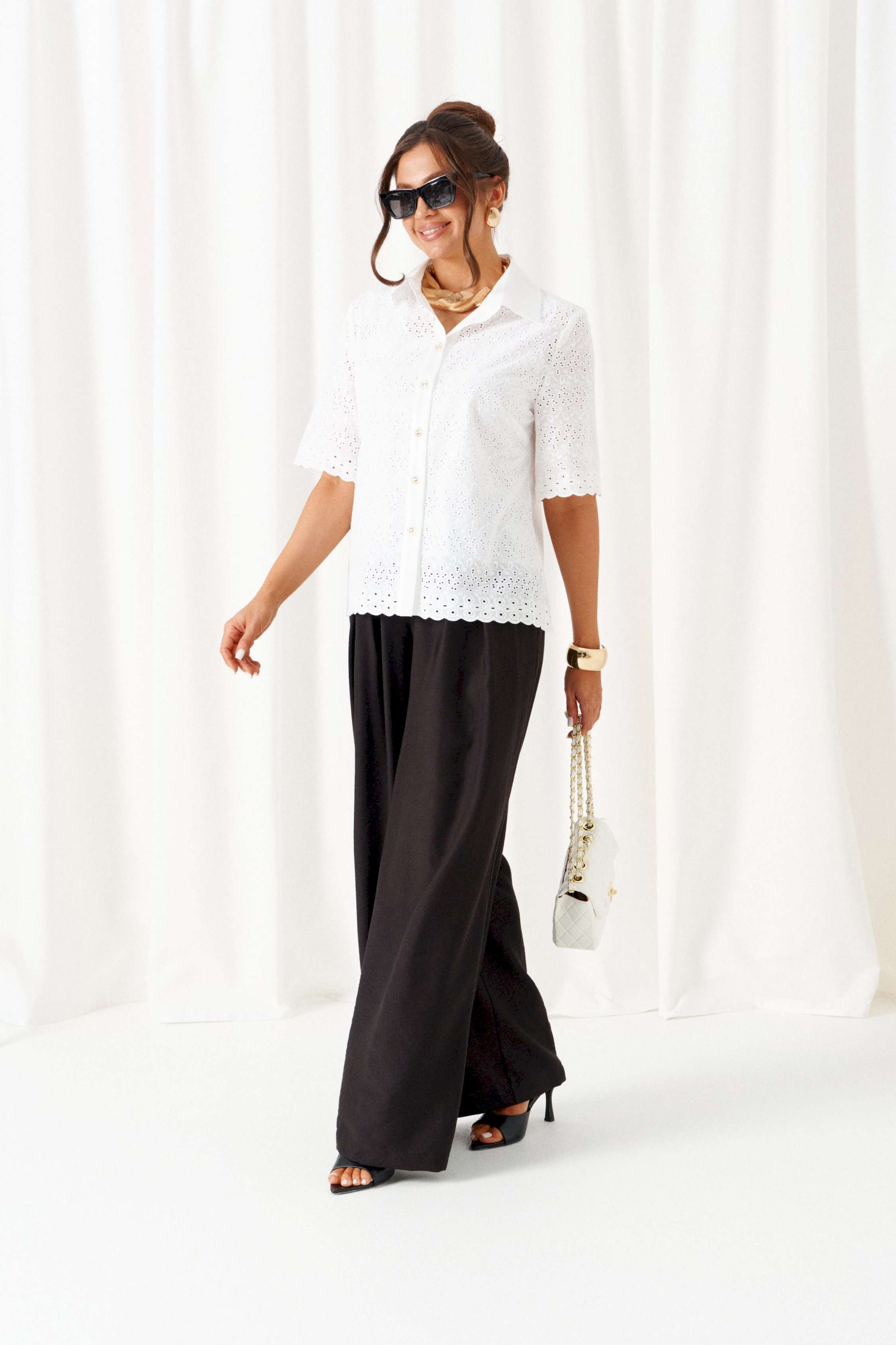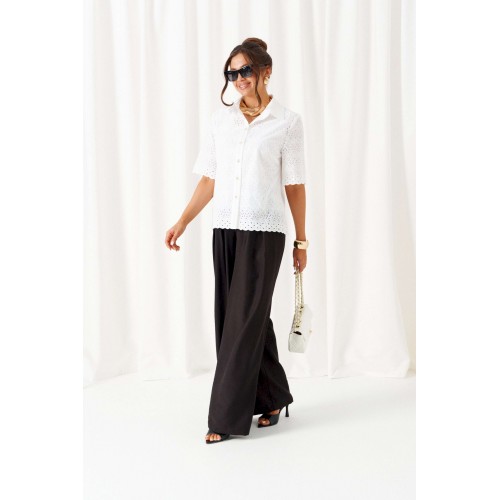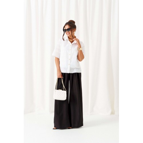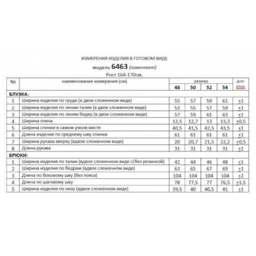 При выборе модели стоит обратить внимание на брючный комплект из нашей коллекции. Комплект с широкими брюками «палаццо» идеально подойдет для создания лаконичных офисных луков, а также для повседневного использования. Такие модели смотрятся необыкновенно женственно и эффектно. Предлагаемый комплект предназначен для повседневного использования, выполнен из смесовых тканей с добавлением натуральных волокон. Блузка свободного силуэта. Классический рубашечный стояче-отложной воротник. Передняя часть с нагрудными вытачками от бокового шва. Спинка цельная. Рукав короткий, одношовный, втачной. Застежка центральная на притачной планке на петли и пуговицы. Низа блузки и рукавов ровный. Планка блузки выполнена из однотонной ткани соответствующего цвета. Перед блузки на хлопковой подкладке. Брюки «палаццо» - акцент комплекта. Широкие с карманами в верхней части бокового шва и глубокими складками по переду. Застежка центральная, классическая, на молнию и петлю с пуговицей на поясе. Пояс брюк притачной, с резинкой сзади, что придает изделию дополнительный комфорт при носке. длина блузки (по среднему шву спинки) – 61 см. длина рукава блузки - 31 см. длина брюк (по боковому шву с поясом) – 108 см.