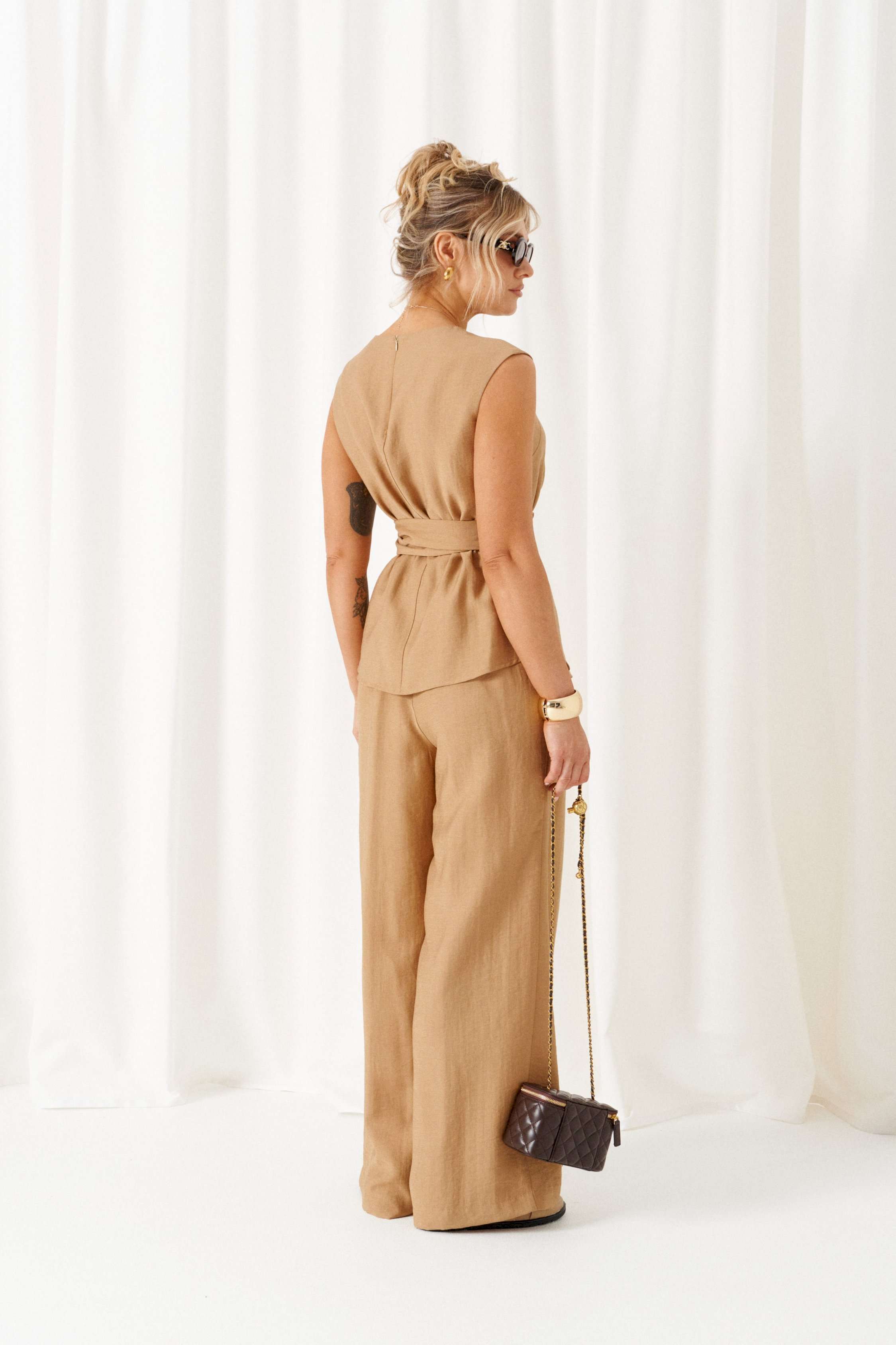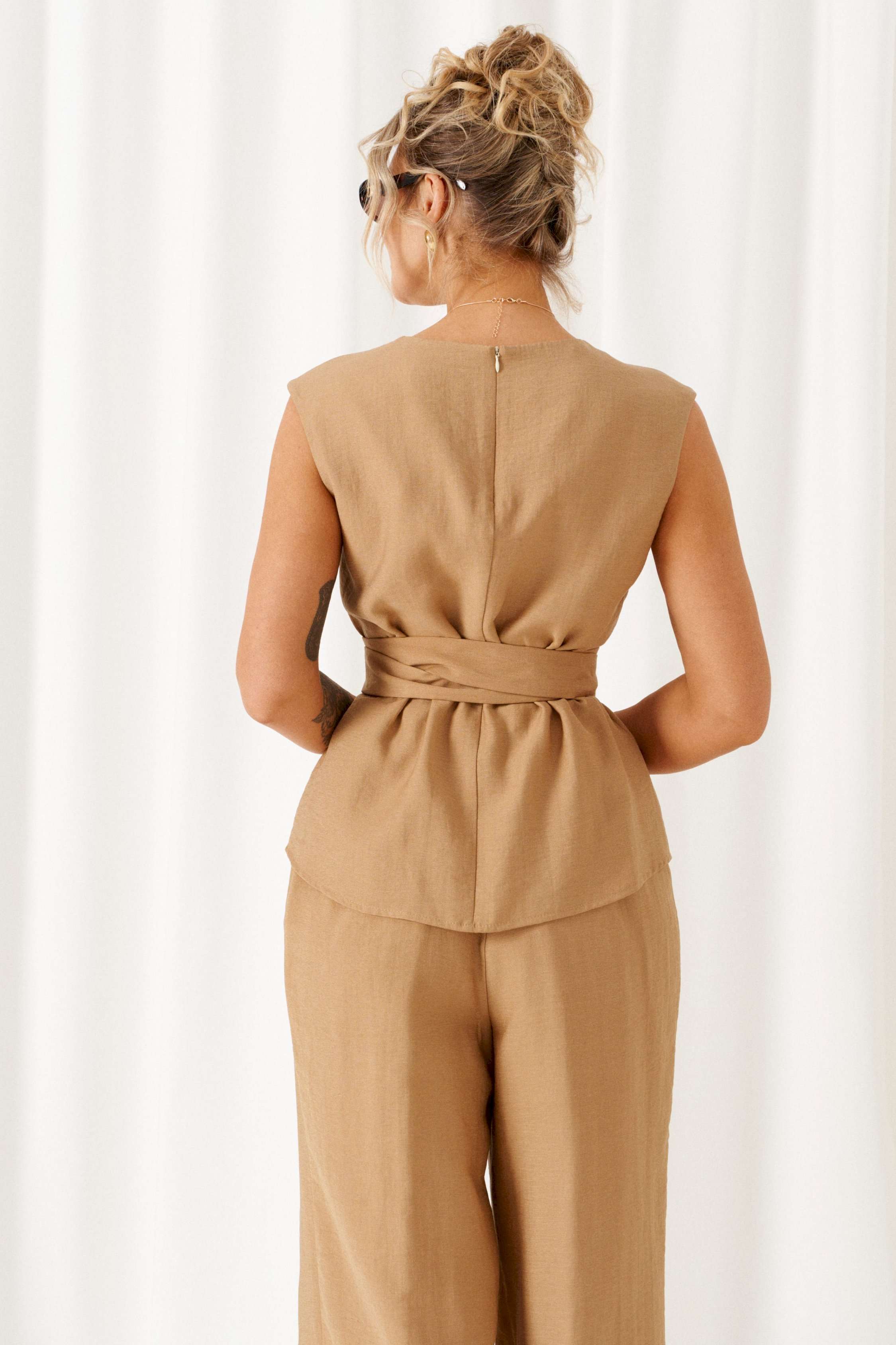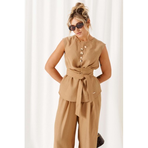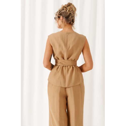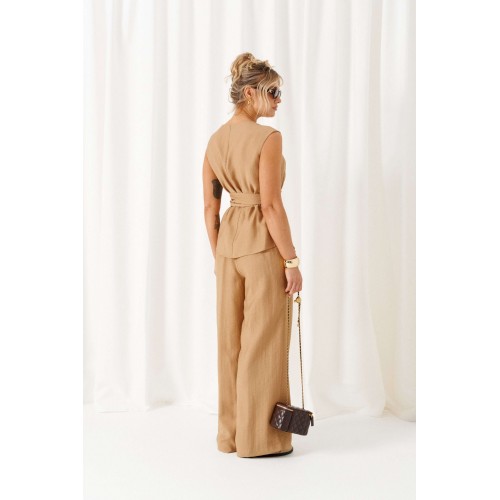 Стильный женский костюм в стиле фьюжн, дополненный акцентными деталями, весьма актуален в будущем сезоне. Предметы костюма можно смело комбинировать по отдельности с другими вещами гардероба. Костюм состоит из 2-х предметов одежды: блузки и брюк. Выполнен из ткани с содержанием натуральных волокон льна и вискозы. Блузка полуприлегающего силуэта свободного кроя, со слегка удлиненной линией плеча, без рукава. Индивидуальность изделию придает цельнокроеная деталь, выполняющая роль пояса-завязки, который перекручиваясь создает красивый узел спереди и фиксирует талию. Перед из двух симметричных деталей с вертикальным швом посередине. Спинка со средним швом, сверху вставлена потайная застежка-молния. О-образный вырез горловины. Низ блузки слегка закругленный к боковым участкам. Брюки прямого силуэта, длинные, свободные, со складками от пояса, с двумя верхними боковыми карманами спереди. Высота сидения классическая. Застежка центральная на молнию и на петлю с пуговицей на поясе. Брюки на притачном поясе, в который для удобного прилегания вставлена резинка по заднему участку. Длина блузки (по середине спинки) ~ 65 см. Длина брюк (с поясом) ~ 110 см.
