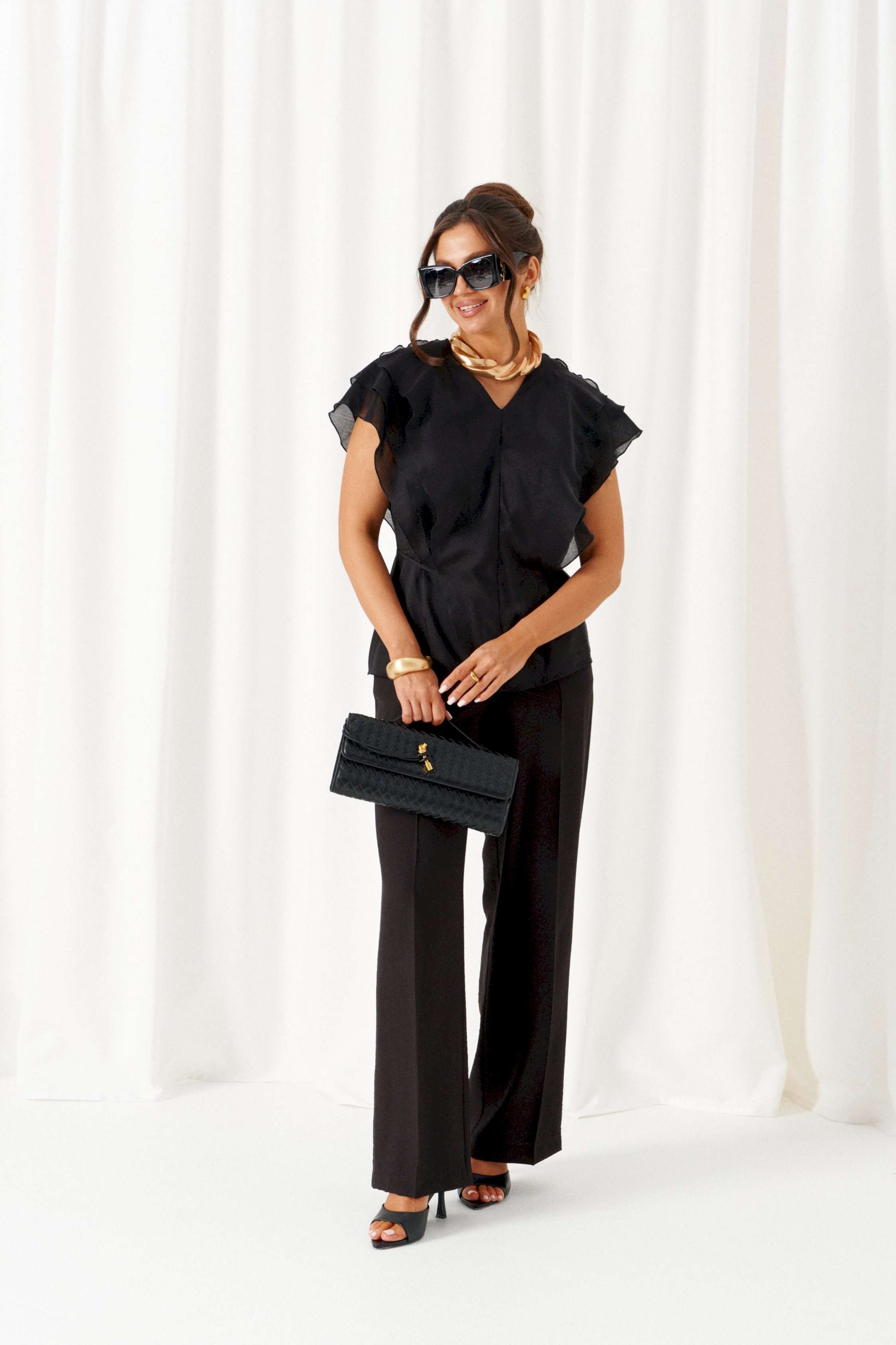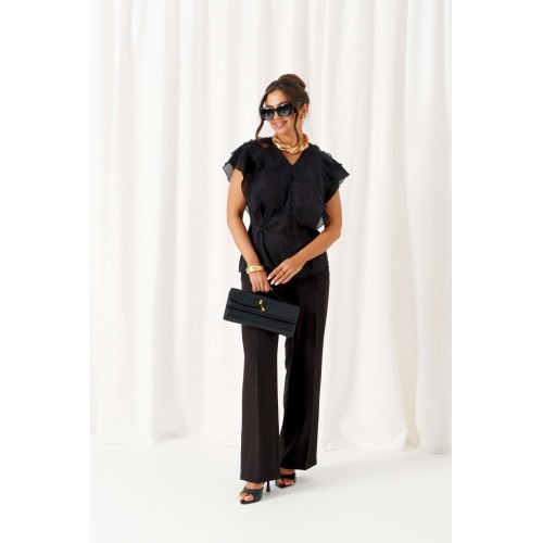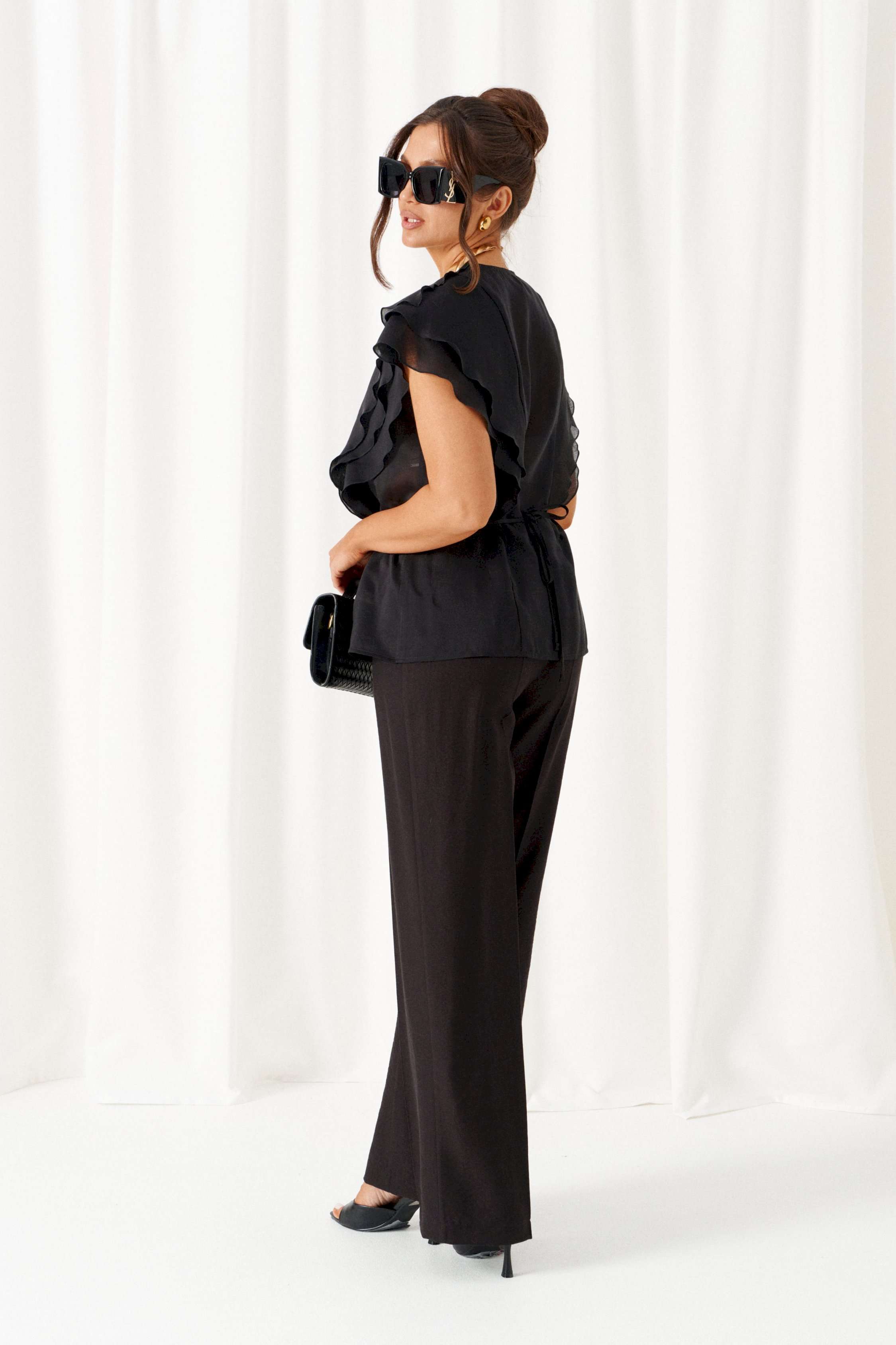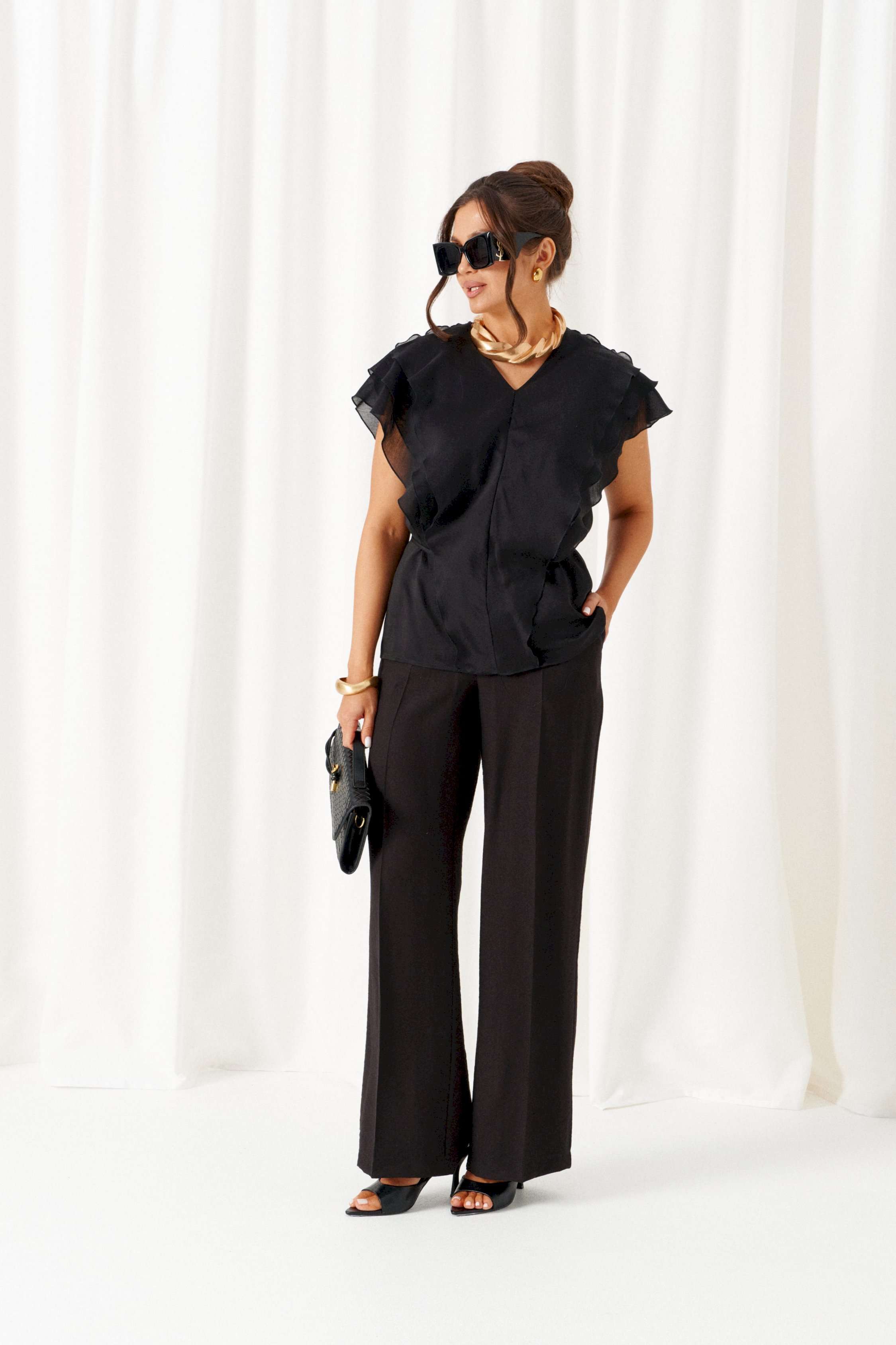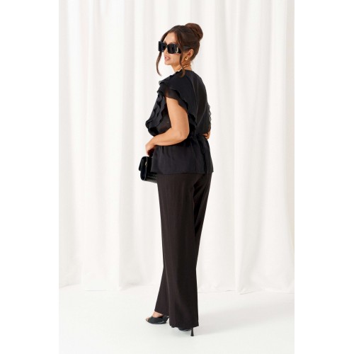 Есть вещи, которые незаметно становятся любимыми и остаются в гардеробе надолго. Комплект в романтическом стиле, состоящий из блузки и брюк, будет идеально сопровождать на любой выход. Блузка полуприлегающего силуэта выполнена из смесовой ткани с содержанием вискозной нити, дополнена несъемным пояском-завязками, которые регулируют прилегание по талии. Передняя часть симметричная, разрезная по центру и с вертикальными рельефами от плеча, спрятанными под тремя воланами разной ширины. Спинка цельная по середине и с двумя дополнительными вертикальными рельефами от плеча, в которые переходят воланы с переда. Вырез горловины V-образной формы. Брюки классические, свободные с боковыми подрезами, имитирующими карманы. Посадка стандартная. В задней части пояса для удобства использования вставлена резинка. Застежка центральная на молнию и петлю с пуговицей на поясе. Длина блузки (по середине спинки) – 63 см. Длина брюк (по боковому шву с поясом) – 108 см.