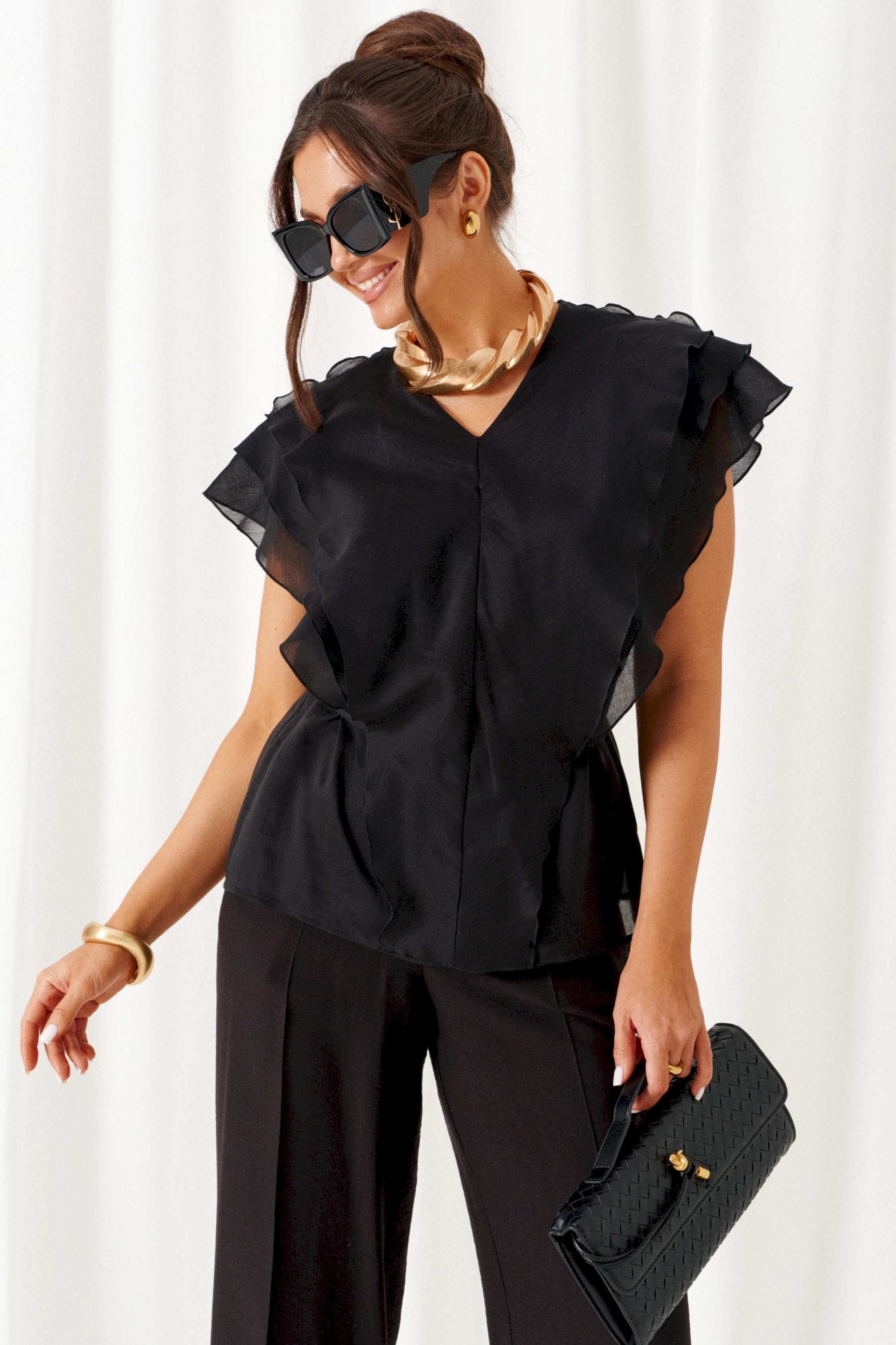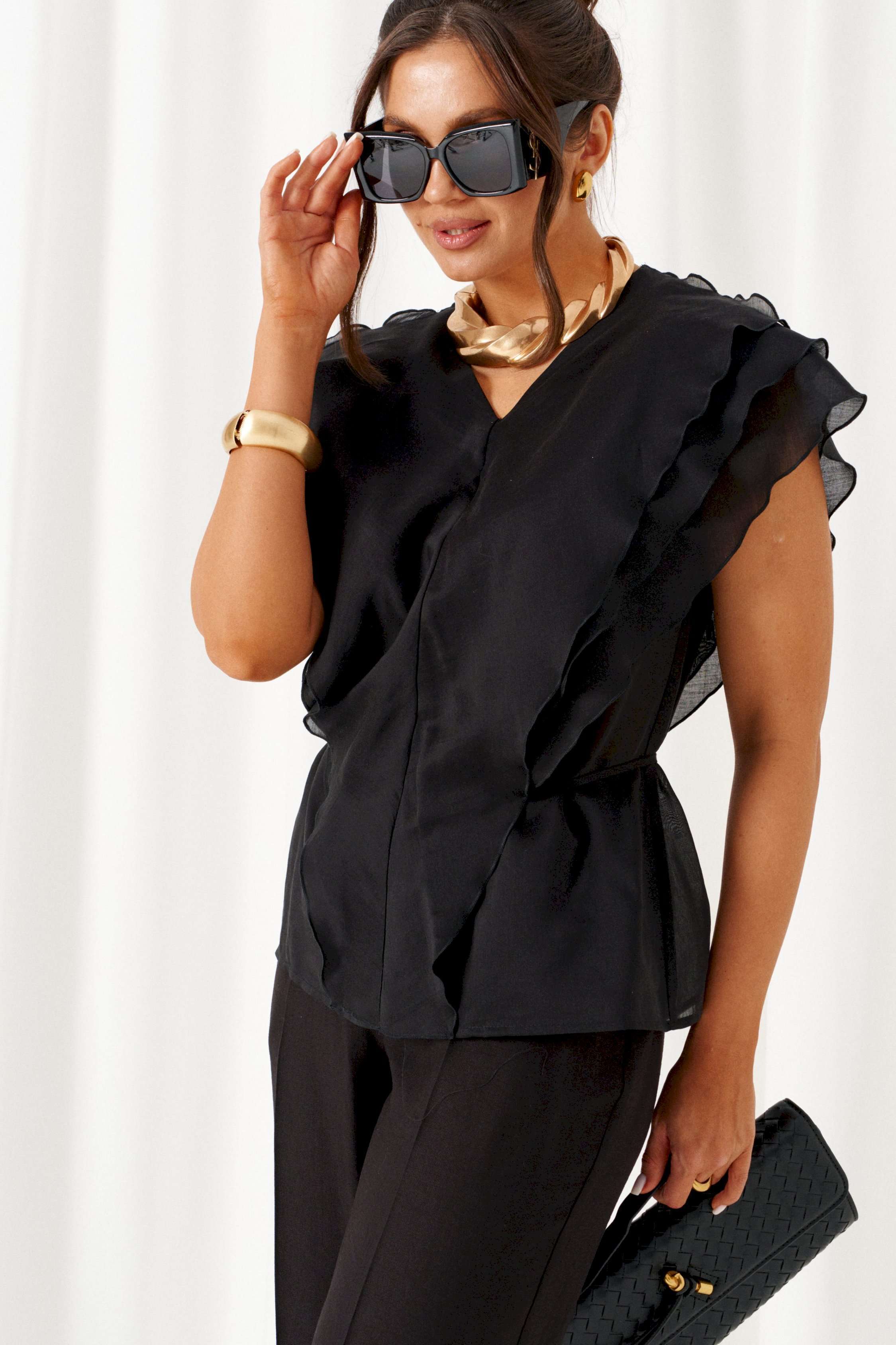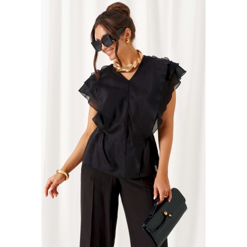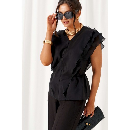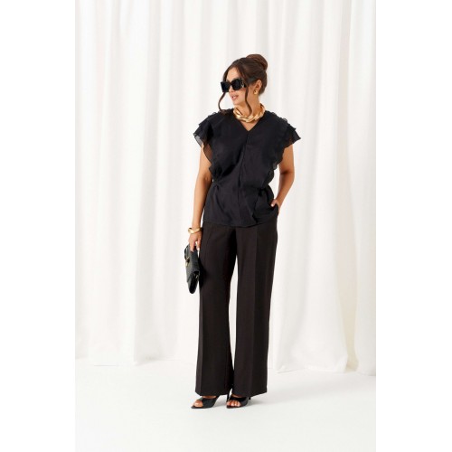 Есть вещи, которые незаметно становятся любимыми и остаются в гардеробе надолго. Комплект в романтическом стиле, состоящий из блузки и брюк, будет идеально сопровождать на любой выход. Блузка полуприлегающего силуэта выполнена из смесовой ткани с содержанием вискозной нити, дополнена несъемным пояском-завязками, которые регулируют прилегание по талии. Передняя часть симметричная, разрезная по центру и с вертикальными рельефами от плеча, спрятанными под тремя воланами разной ширины. Спинка цельная по середине и с двумя дополнительными вертикальными рельефами от плеча, в которые переходят воланы с переда. Вырез горловины V-образной формы. Брюки классические, свободные с боковыми подрезами, имитирующими карманы. Посадка стандартная. В задней части пояса для удобства использования вставлена резинка. Застежка центральная на молнию и петлю с пуговицей на поясе. Длина блузки (по середине спинки) – 63 см. Длина брюк (по боковому шву с поясом) – 108 см.