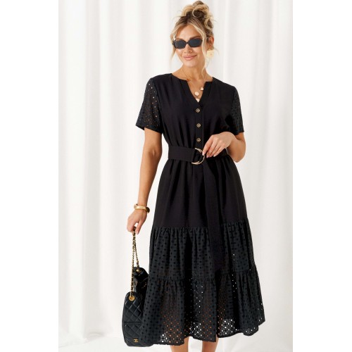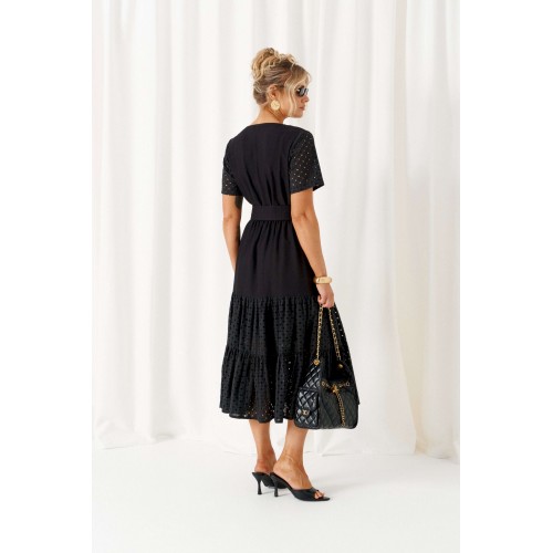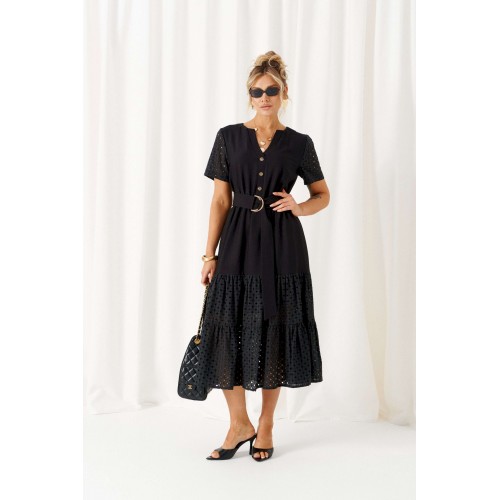 Легкое, струящееся платье – идеальный выбор для лета! Универсального фасона, подходящее для любого мероприятия, длинное хлопковое платье свободного прилегания станет любимым в гардеробе! Даже в самый жаркий день вы будете чувствовать уверенно и комфортно. Платье полуприлегающего силуэта, длинное, на хлопковой подкладке, отрезное по линии талии, дополнено поясом с декоративной пряжкой. Верхняя часть переда из двух частей с центральной притачной планкой, имитирующей застежку, и мягкой сборкой по талии. Спинка цельнокроеная со сборкой по талии. Низ платья объемный, широкий состоит из трех частей: юбки и двух воланов со сборкой. Рукав короткий, одношовный, втачной. Горловина V-образной формы, обработана по переду планкой с тремя декоративными пуговицами. Рукав платья и воланы выполнены из отделочной ткани с вышивкой, что придает платью отличительный и эффектный вид. Длина изделия по спинке ~ 125 см. Длина рукава ~ 24,5 см.