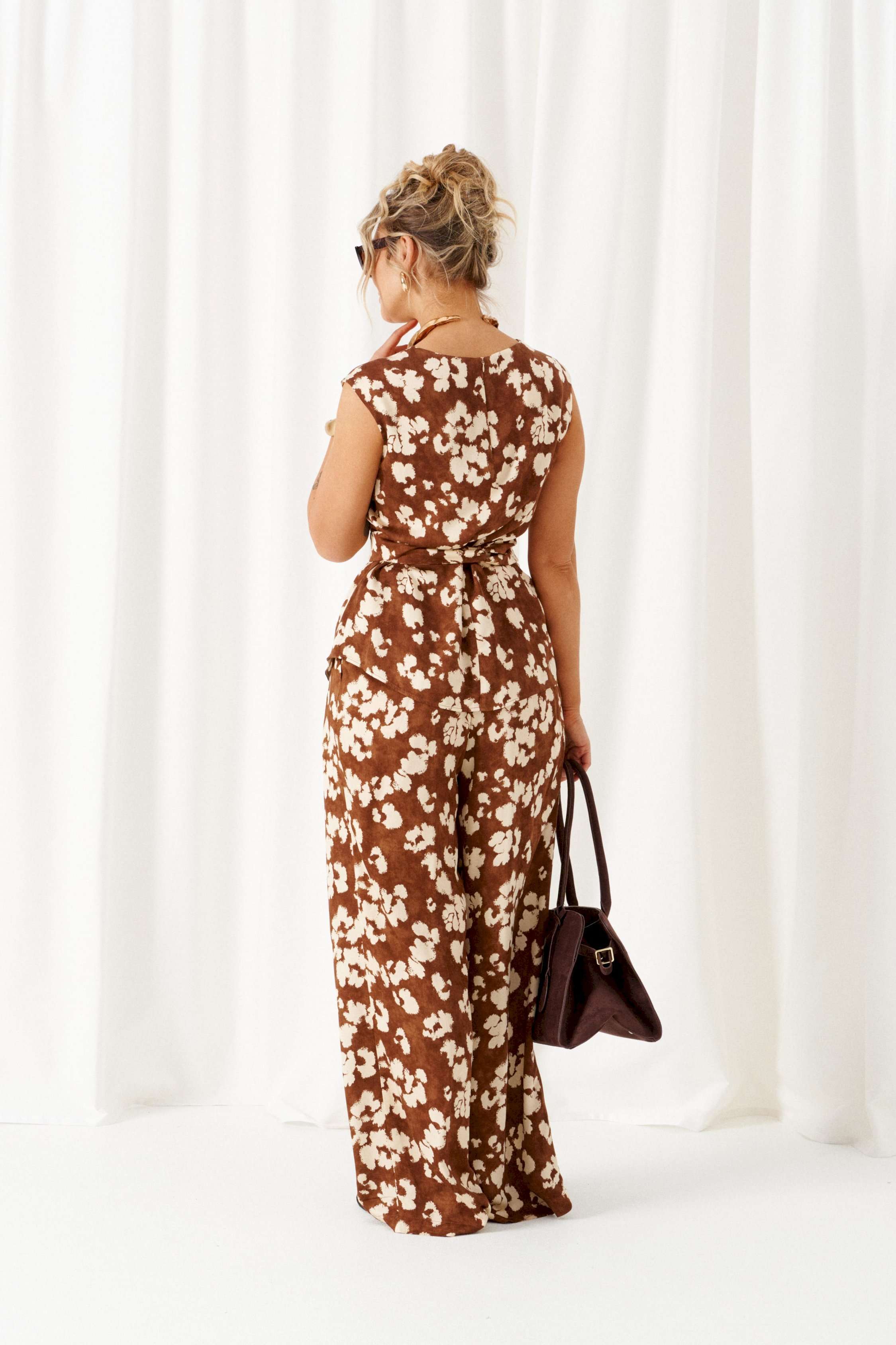 Стильный женский костюм в стиле фьюжн, дополненный акцентными деталями, весьма актуален в будущем сезоне. Предметы костюма можно смело комбинировать по отдельности с другими вещами гардероба. Костюм состоит из 2-х предметов одежды: блузки и брюк. Выполнен из ткани с содержанием натуральных волокон льна и вискозы. Блузка полуприлегающего силуэта свободного кроя, со слегка удлиненной линией плеча, без рукава. Индивидуальность изделию придает цельнокроеная деталь, выполняющая роль пояса-завязки, который перекручиваясь создает красивый узел спереди и фиксирует талию. Перед из двух симметричных деталей с вертикальным швом посередине. Спинка со средним швом, сверху вставлена потайная застежка-молния. О-образный вырез горловины. Низ блузки слегка закругленный к боковым участкам. Брюки прямого силуэта, длинные, свободные, со складками от пояса, с двумя верхними боковыми карманами спереди. Высота сидения классическая. Застежка центральная на молнию и на петлю с пуговицей на поясе. Брюки на притачном поясе, в который для удобного прилегания вставлена резинка по заднему участку. Длина блузки (по середине спинки) ~ 65 см. Длина брюк (с поясом) ~ 110 см.
