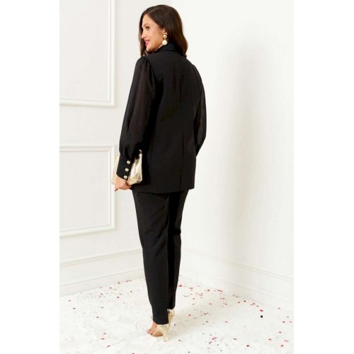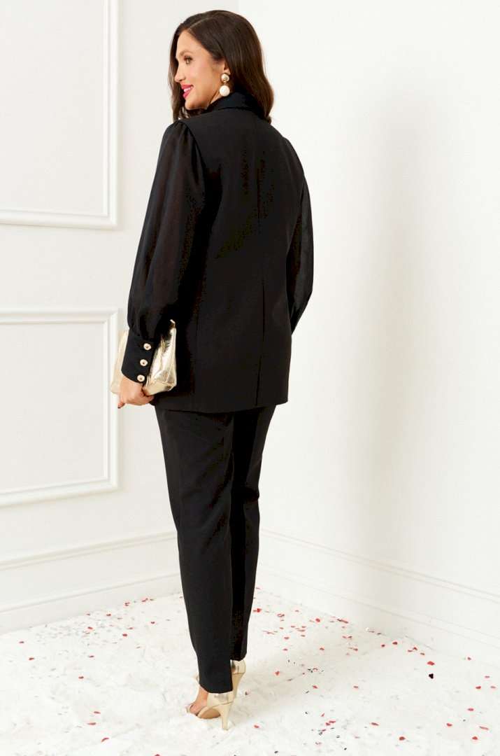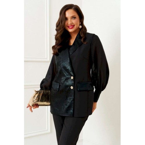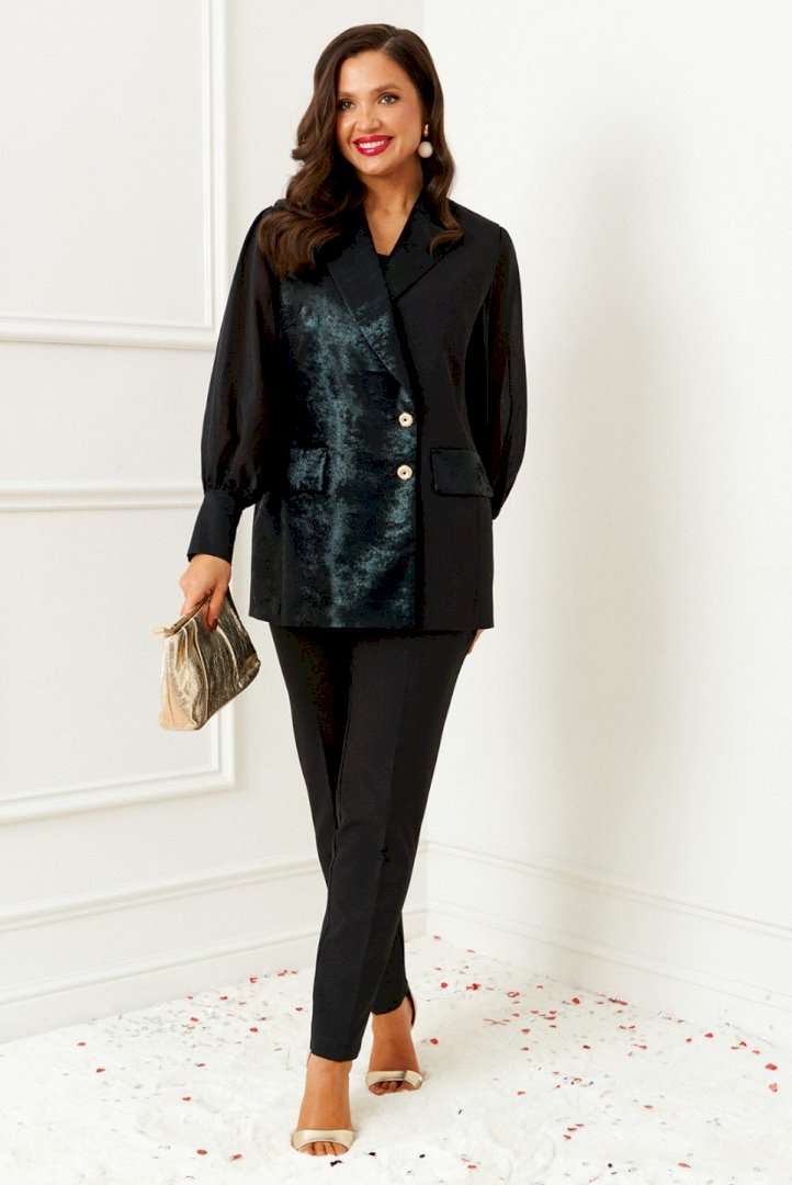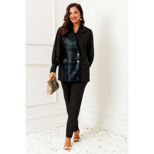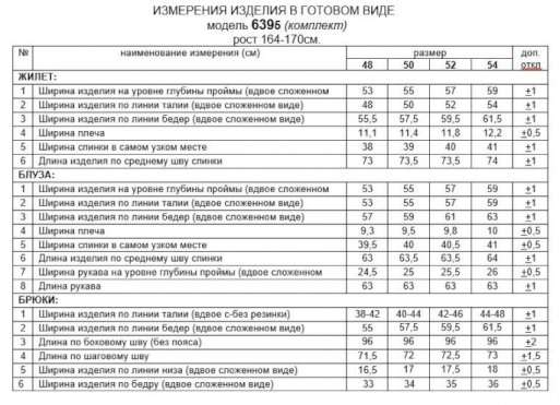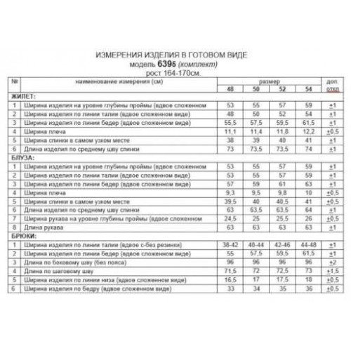 Комплект женский 3-ёх предметный: жилет, брюки, блузка. Выполнен из костюмно-смесового полотна с нежной фактурой, приятной на ощупь и матовой поверхностью в сочетании с отделочной тканью с бархатистой основой. Блузка представлена из респектабельной ткани «вуаль». Жилет полуприлегающего силуэта двубортный на подкладке. Передняя часть с боковыми декоративными клапанами, с вертикальными рельефами от проймы и нагрудными вытачками от них, также с дополнительной формообразующей вытачкой под лацканом. Правая часть переда и клапаны выполнены из отделочной ткани. Спинка разрезная по среднему шву и с рельефами от проймы. Воротник классический пиджачного типа с широкими лацканами. Застежка смещенная на две петли и декоративные пуговицы. Низ борта ровный. Брюки классической посадки, со складками от пояса. Пояс широкий, сзади вставлена резинка. В верхней части брюк расположены функциональные карманы. Застежка центральная на молнию и на две петли и пуговицы на поясе. Блузка прямого, свободного силуэта, выполнена из легкого полупрозрачного полотна. Передняя часть блузы цельнокроеная, с вытачками от бокового шва. Спинка цельнокроеная. Рукав втачной, длинный, одношовный с мягкой сборкой по окату и по низу. Нижняя часть рукава обработана манжетой с застежкой на три петли и пуговицы. Горловина мягкой округлой формы обработана окантовкой. Длина жилета (по среднему шву спинки) – 73,5см. Длина брюк (по боковому шву с поясом) –100 см. Длина блузы (по среднему шву спинки) – 63,5 см. Длина рукава (блуза) – 63 см.