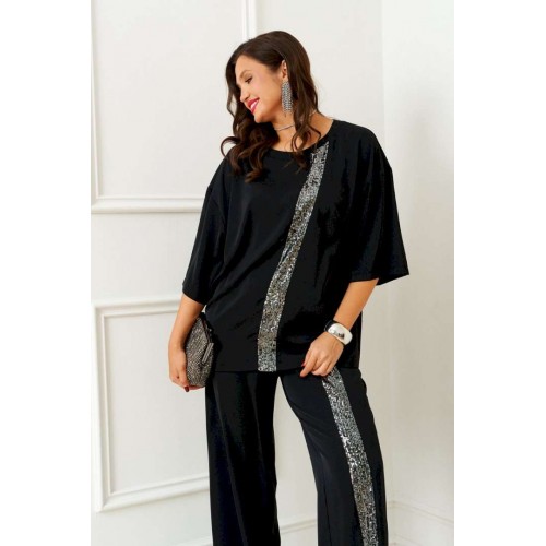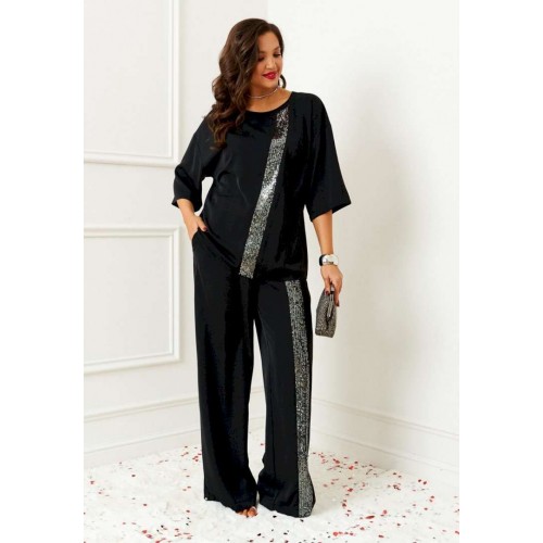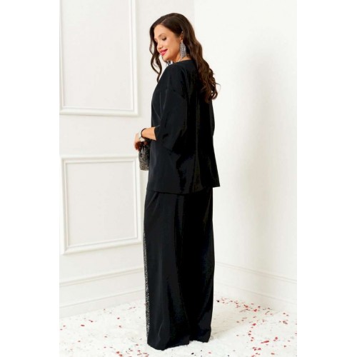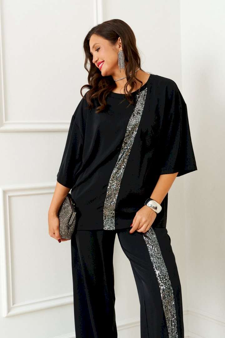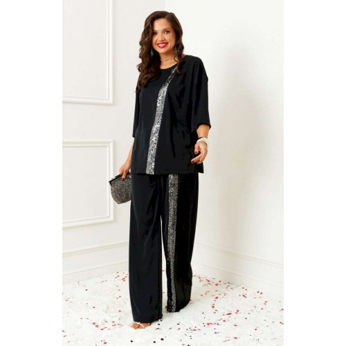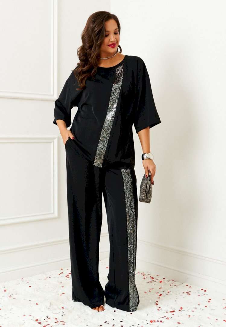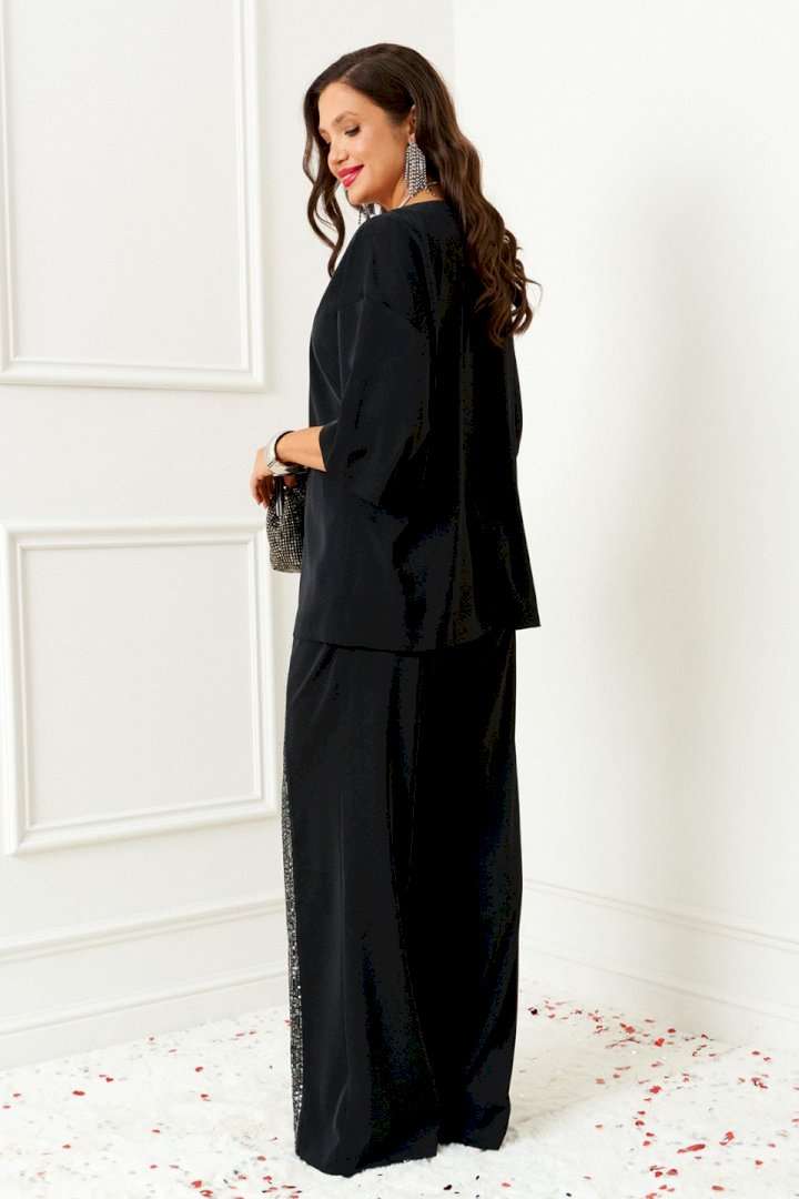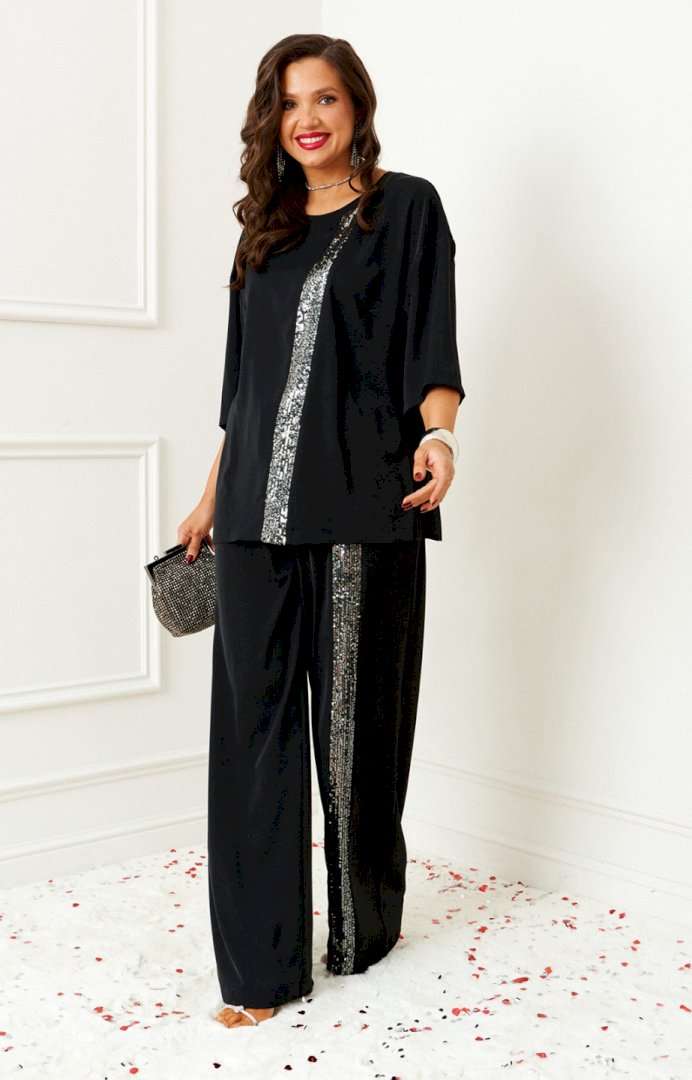 Готовимся к главной ночи года! Брючный костюм из мягкого крепа идеально подходит для торжественных выходов и не только! Оба предмета костюма можно смело комбинировать по отдельности с другими вещами Вашего гардероба. Изысканный костюм состоит из 2-ух предметов: блузки и брюк. Выполнен из костюмно-смесового полотна. У этой ткани нежная, гладко-бархатистая фактура, приятная на ощупь и матовая поверхность. Она легко драпируется и очень выгодно и дорого подчёркивает образ. Блузка свободного силуэта, с удлиненной линией плеча, длиной до середины бедра. Передняя часть с двумя нагрудными вытачками и с фигурной отделочной вставкой из ткани с пайетками по центру. Спинка цельная. Рукав одношовный, средней ширины, длиной ниже локтя. Горловина овальной формы на подрезной обтачке. Брюки свободного, прямого силуэта. Высота сиденья классическая. На левой брючине спереди выполнена прямолинейная вставка из отделочной ткани. Брюки на поясе, в который вставлена эластичная тесьма по всей окружности. Длина блузки (по среднему шву спинки) ~ 68,5 см Длина рукава (с плечом) ~ 48,5 см. Длина брюк (с поясом) ~ 110 см
