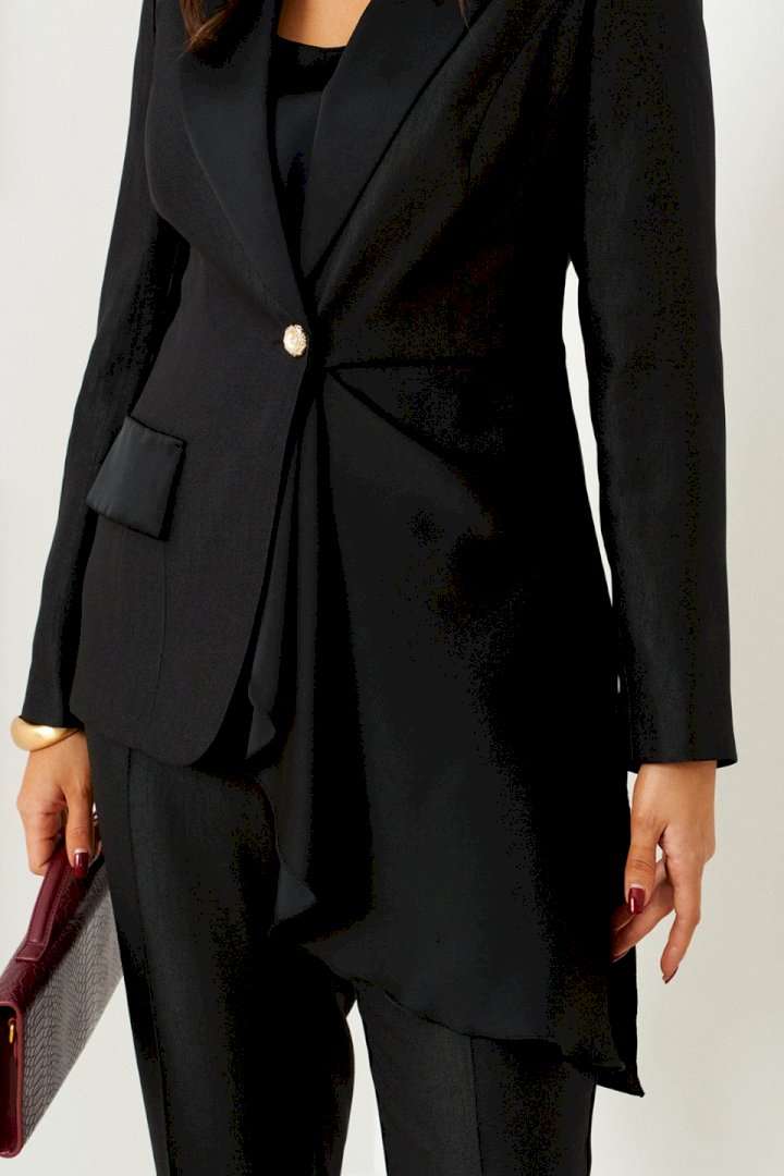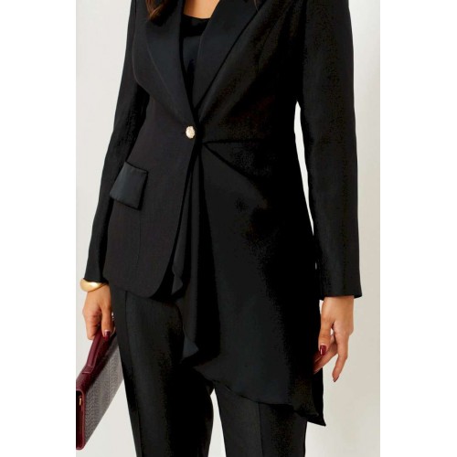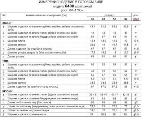 Комплект женский 3-ёх предметный: жакет, брюки, топ. Жакет и брюки выполнены из ткани актуального стильного дизайна. Топ выполнен из атласной ткани с элегантным блеском. Жакет асимметричного кроя с акцентными фантазийными деталями, на подкладке. Перед с вертикальными рельефами от проймы. Правая часть переда с боковым накладным клапаном, левая часть с баской-драпировкой из ткани компаньона. Спинка со средним швом и вертикальными рельефами от плеча. Рукав втачной, двухшовный длинный. Воротник пиджачного типа с лацканами из ткани компаньона. Застежка центральная на петлю и декоративную пуговицу. Брюки длинной до щиколотки, слегка заужены к низу. Посадка классическая. Спереди расположены боковые функциональные карманы. Застежка центральная на молнию и петлю с пуговицей на поясе. Пояс притачной, сзади для удобного прилегания вставлена резинка. Топ полуприлегающего силуэта. Горловина округлой формы. Перед цельный, с двумя нагрудными вытачками от бокового шва. Спинка цельная. Длина жакета (по среднему шву спинки) ~ 67 см. Длина рукава жакета ~ 61 см Длина брюк (по боковому шву с поясом) ~ 102 см. Длина топа (по середине спинки) ~ 57,5 см.