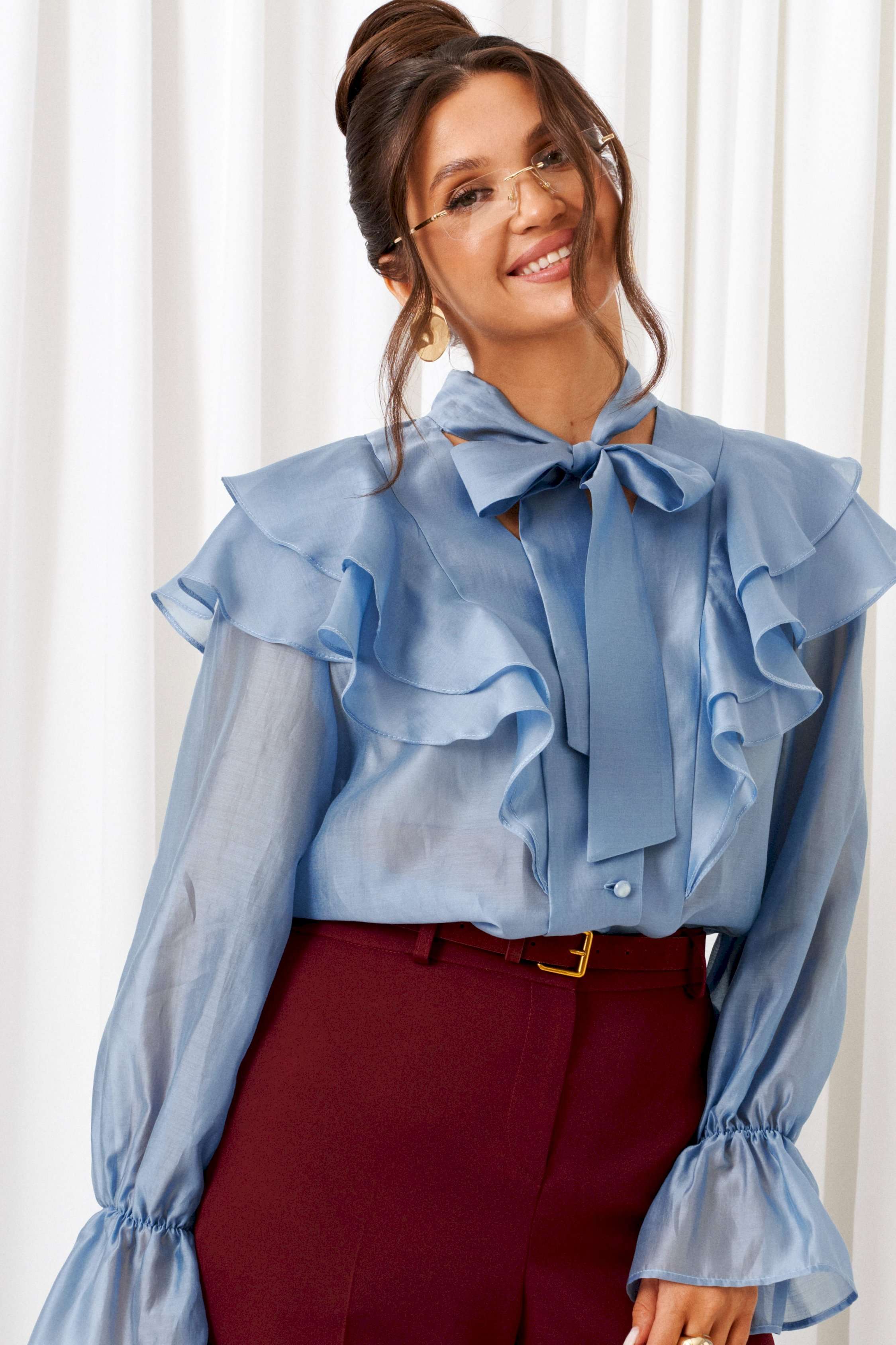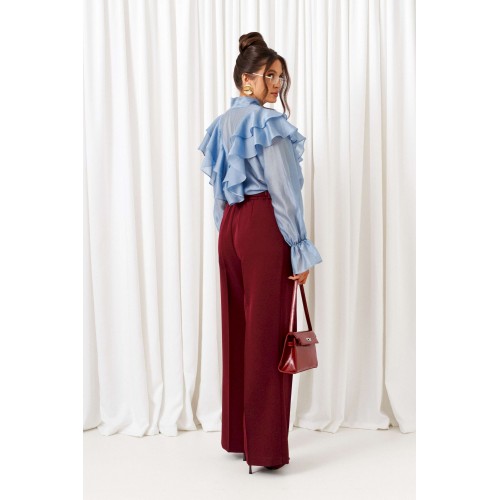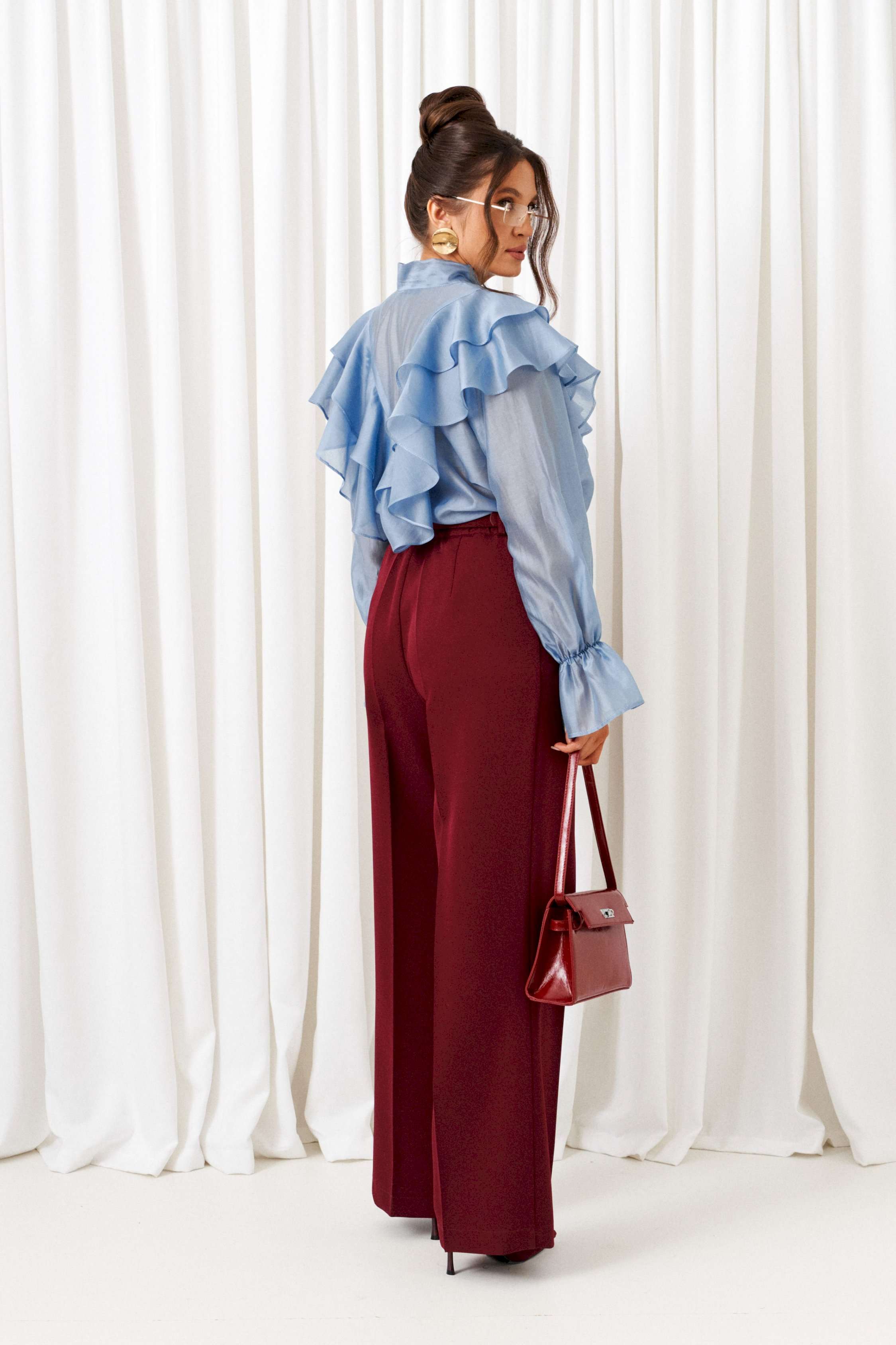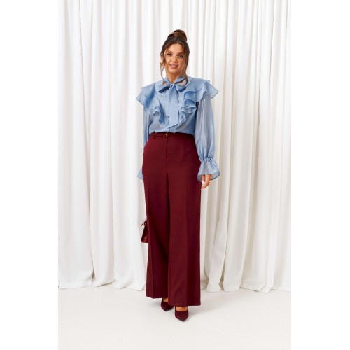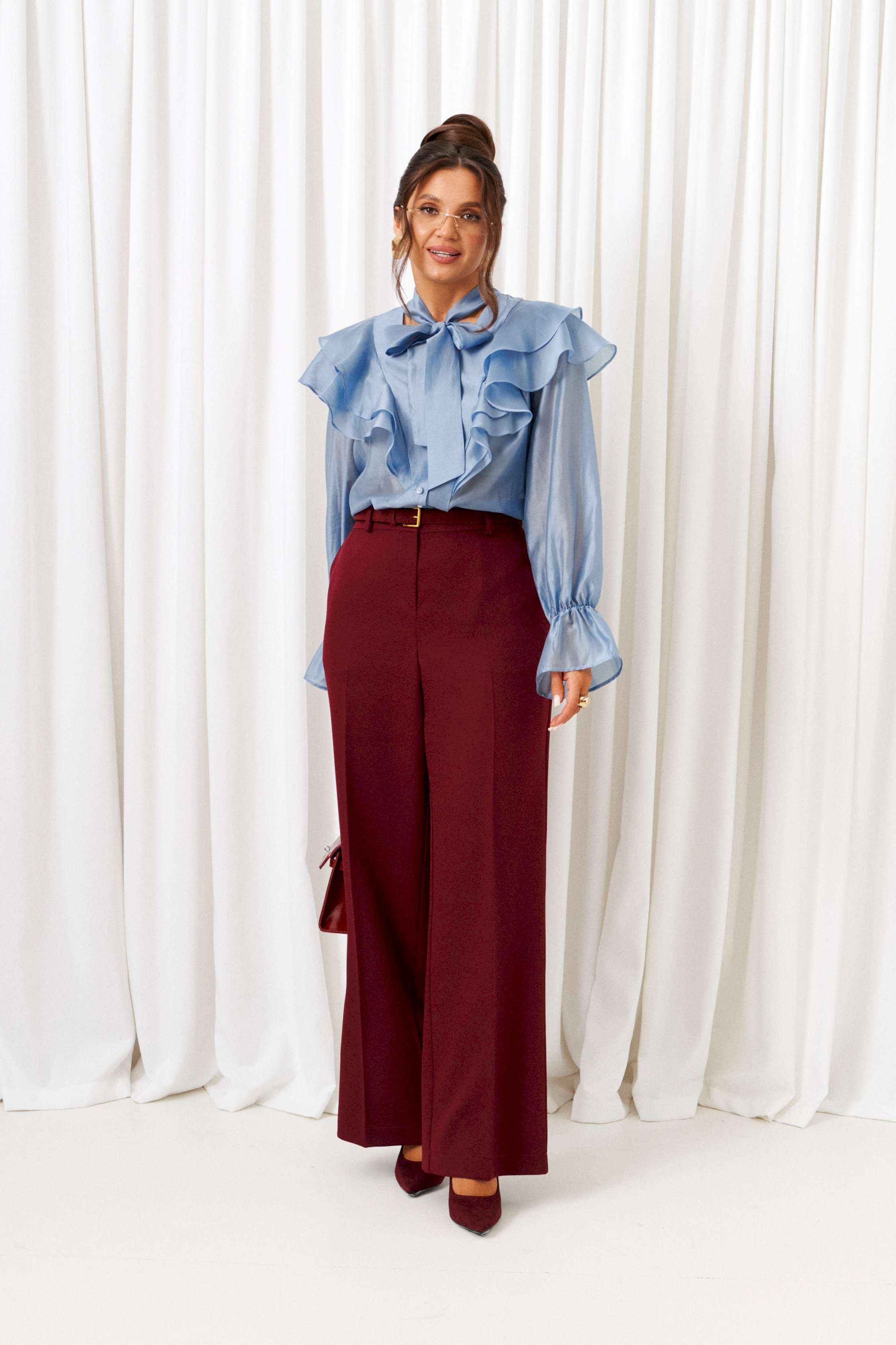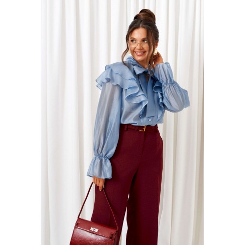 Симфония роскоши и фактур! Сочетание экстравагантной блузы и широких брюк создает гармоничный силуэт, подчеркивая неповторимость образа. Комплект женский 2-ух предметный: блузка в романтическом стиле и классические брюки. Выполнен в комбинации изысканных костюмного и вуального полотен актуальных контрастных оттенков. Блузка свободного силуэта, симметричная, средней длины. Передняя часть с вертикальными рельефами от плеча, в который вставлены разноуровневые воланы. Спинка с фигурной двойной кокеткой, заканчивающейся воланами; цельная по середине. Рукав втачной, одношовный, длинный. Расширенный и собранный внизу на эластичную тесьму. Вырез горловины V-образной формы с притачным бантом-завязкой. Застежка центральная на петли и декоративные пуговицы. Низ ровный. Брюки прямого силуэта классической посадки, длинные, с двумя верхними боковыми карманами. Высота сиденья стандартная. Застежка центральная на молнию и на петлю с пуговицей на поясе. В задней части пояса для удобного прилегания по талии вставлена резинка. В верху брюк расположены шлевки для использования поясного ремня. В комплект входит пояс-ремень из экозамши с декоративной металлической пряжкой. Длина блузки (по среднему шву спинки) – 67 см. Длина рукава блузки – 65 см. Длина брюк (по боковому шву с поясом) –108 см.