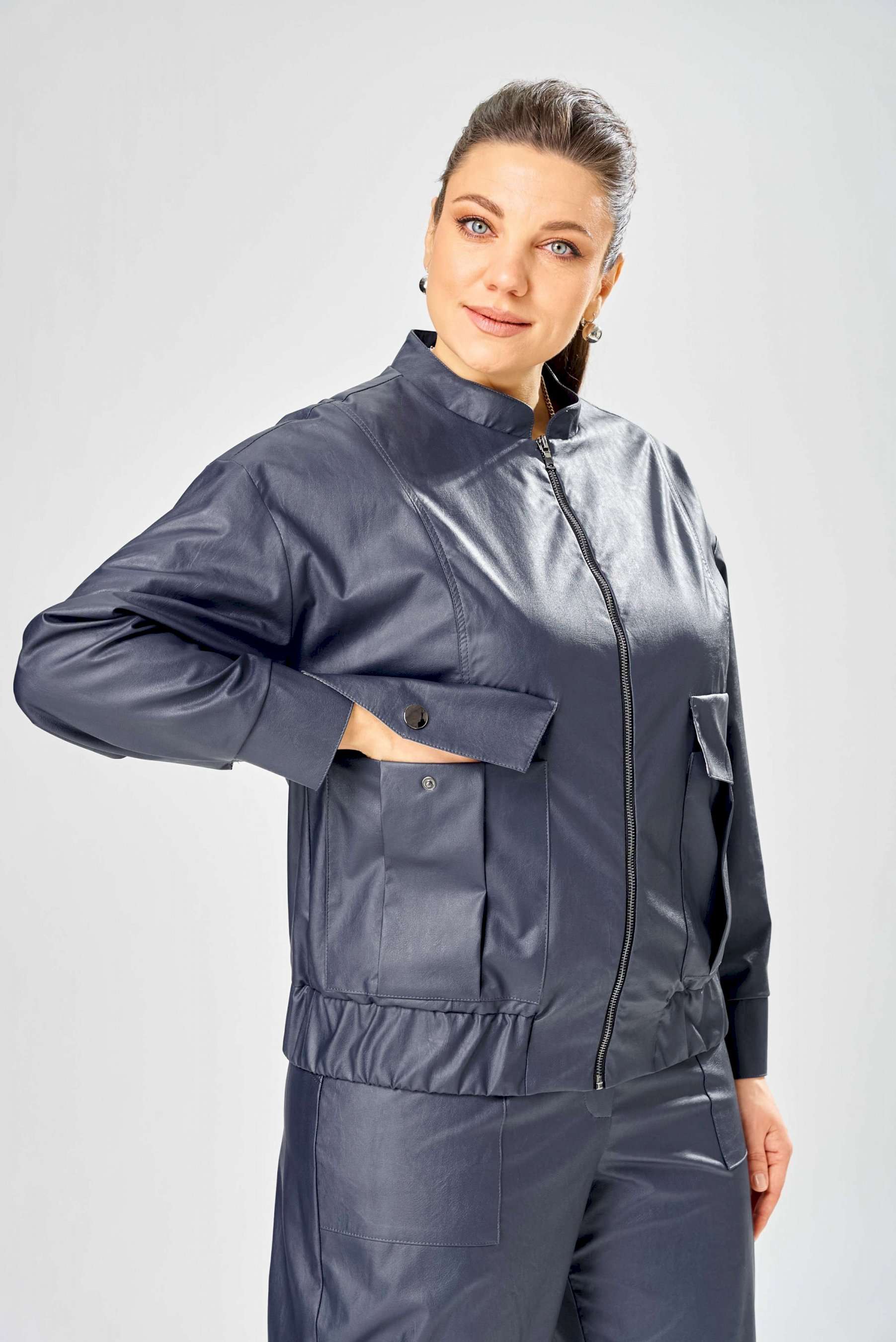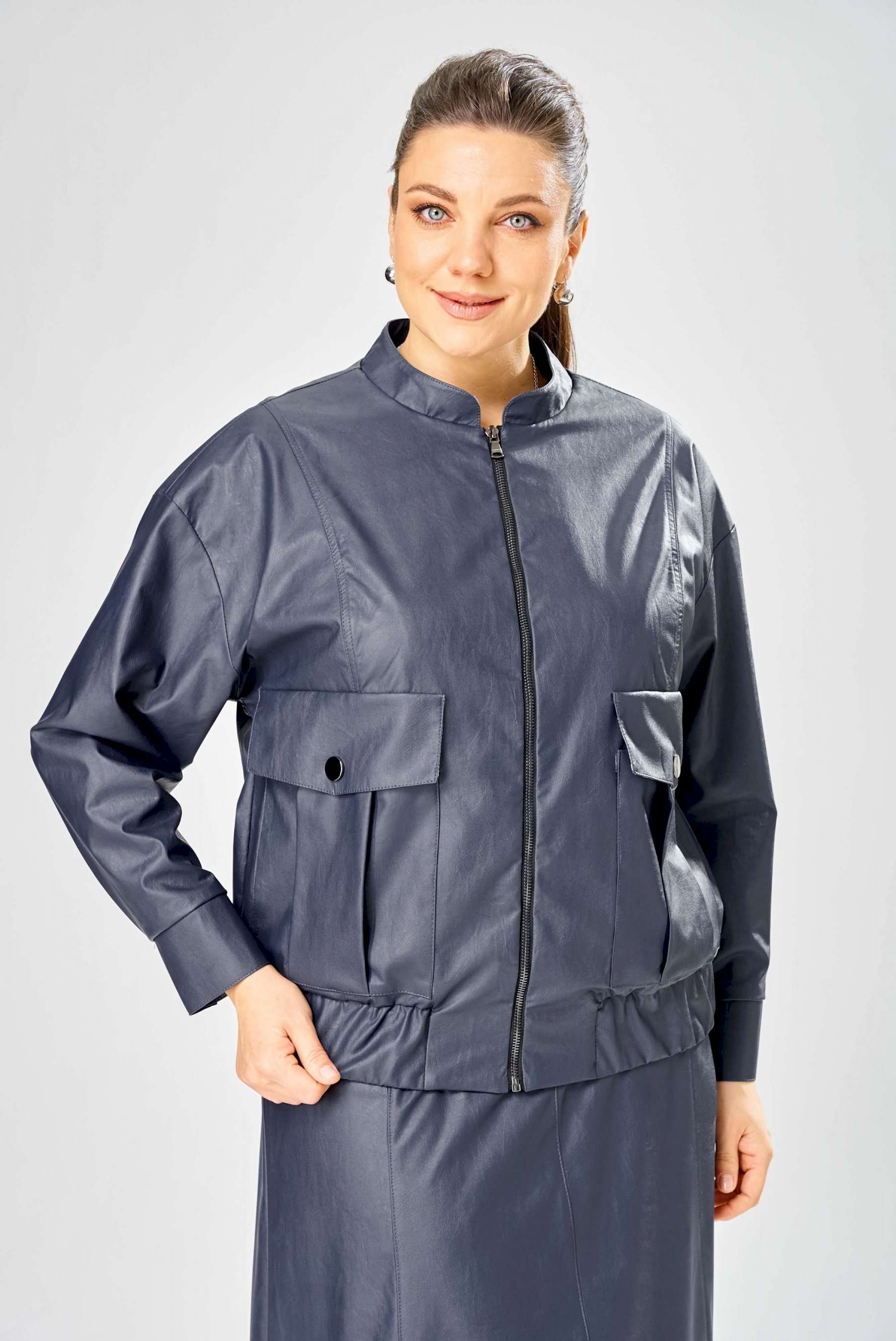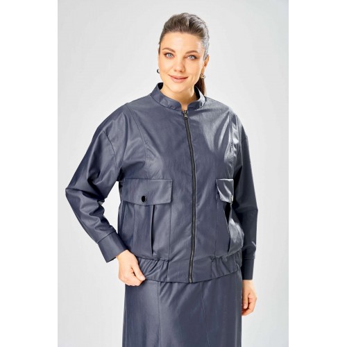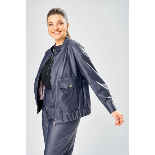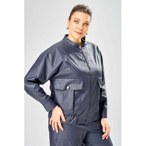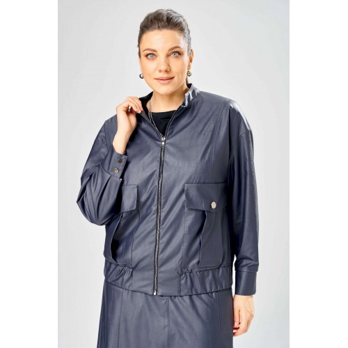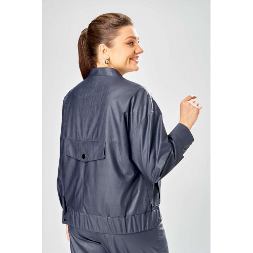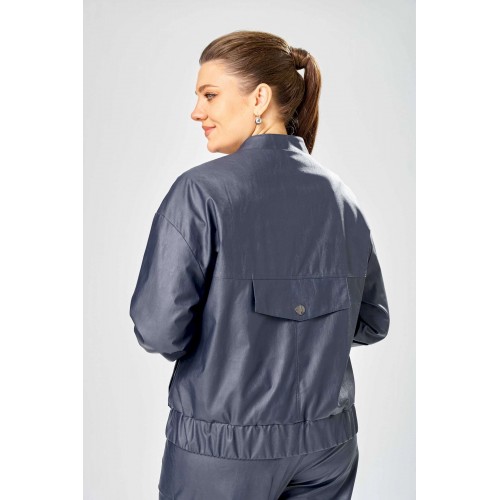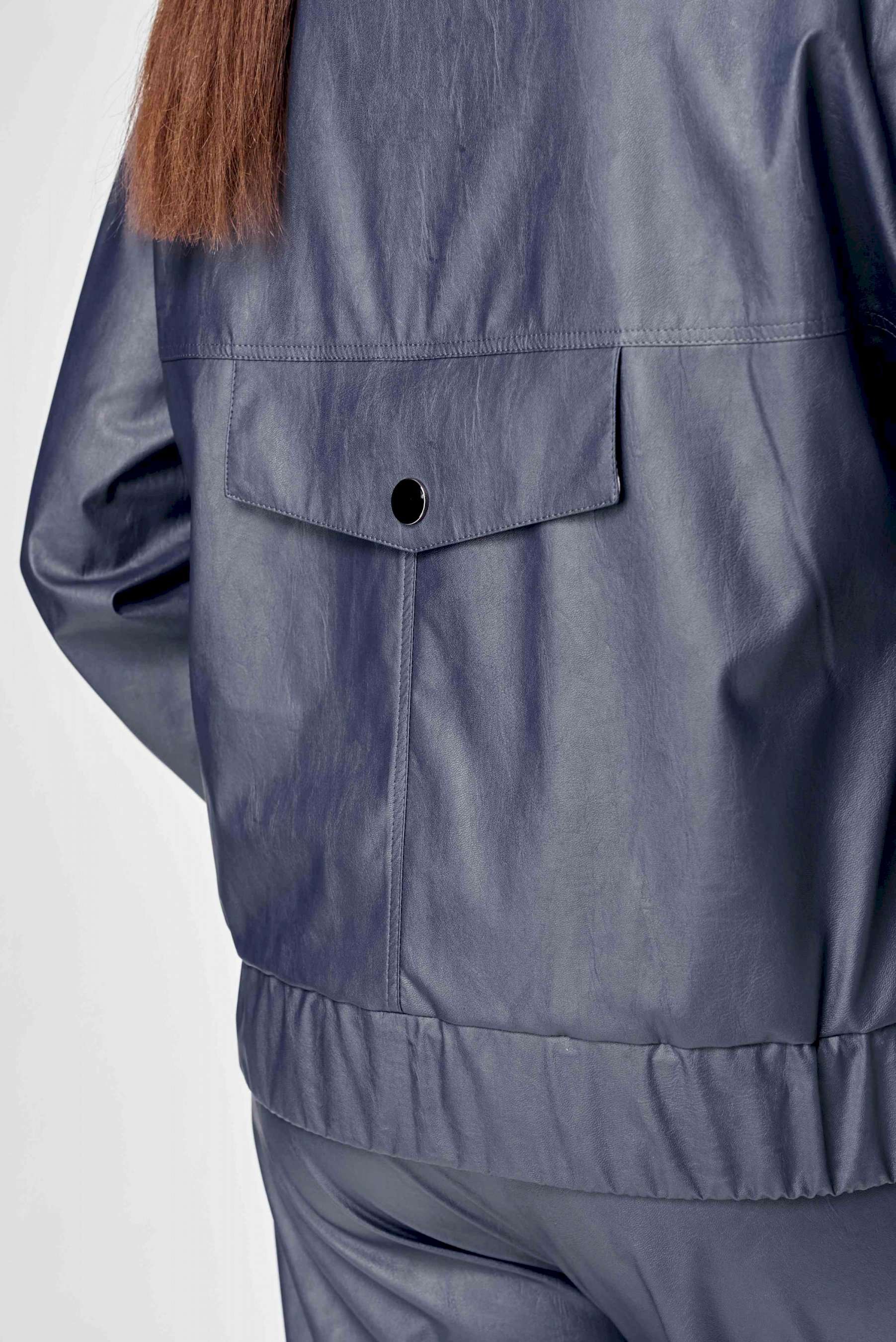 Стильный женская куртка свободного силуэта, из эко-кожи. Застегивается на молнию, по переду накладные карманы с клапаном и декоративной кнопкой. Головина оформлена воротником стойка. По спинке отрезная кокетка с клапаном. Рукава со спущенной поймой, по низу притачной манжет с застежкой на кнопки. По низу куртки, притачная планка с резинкой. Куртка на подкладке. Длина куртки – 62 см Длина рукава – 50 см