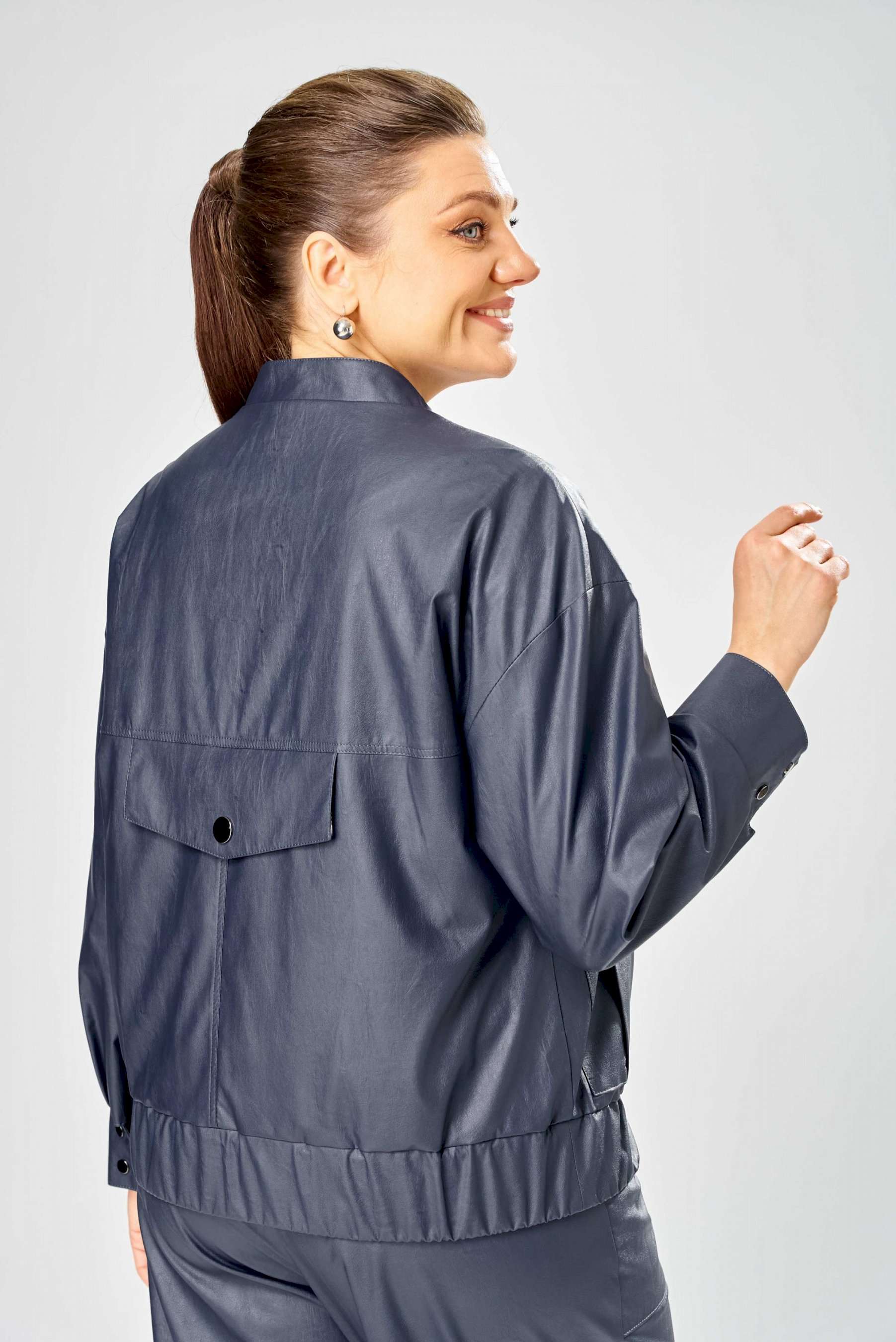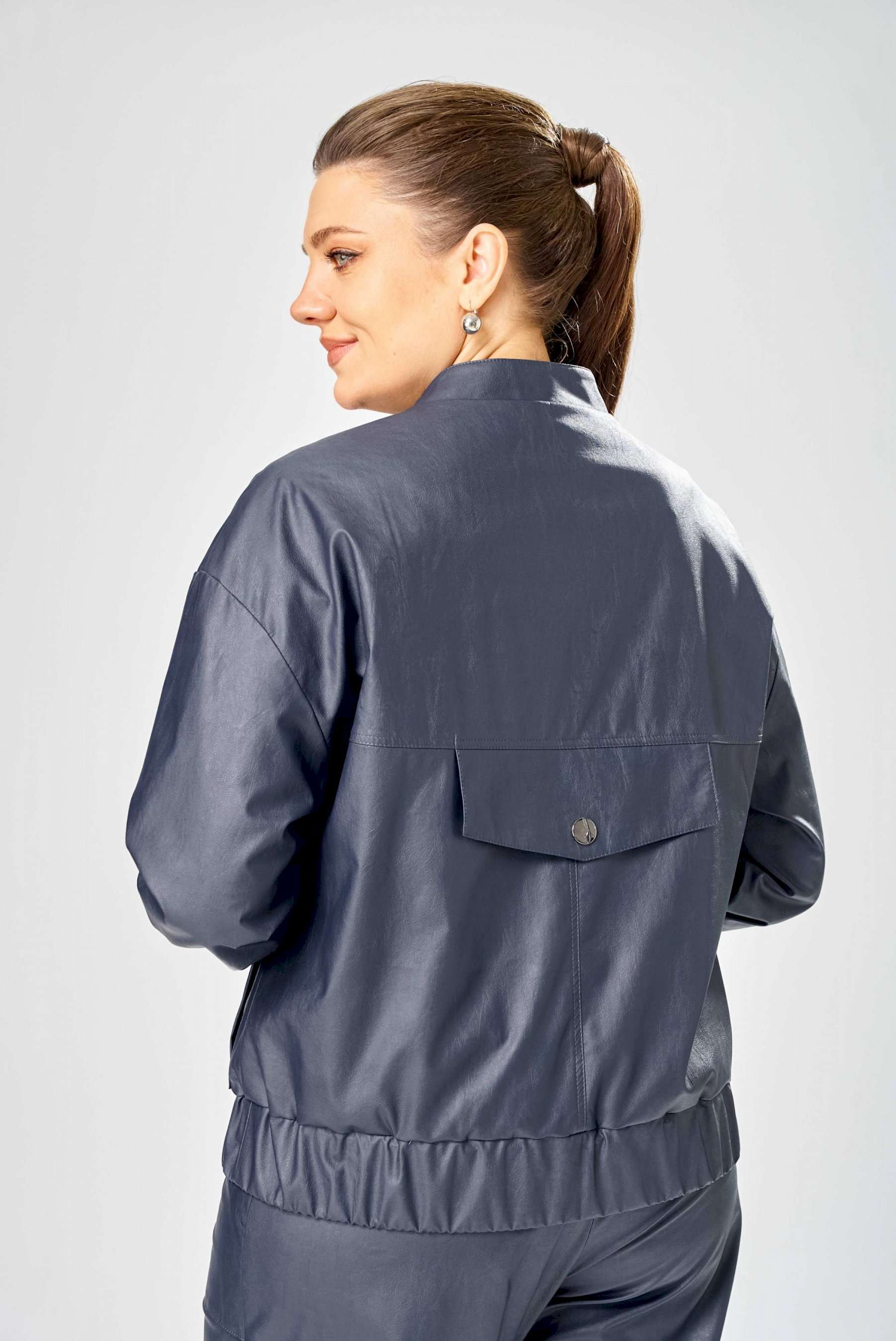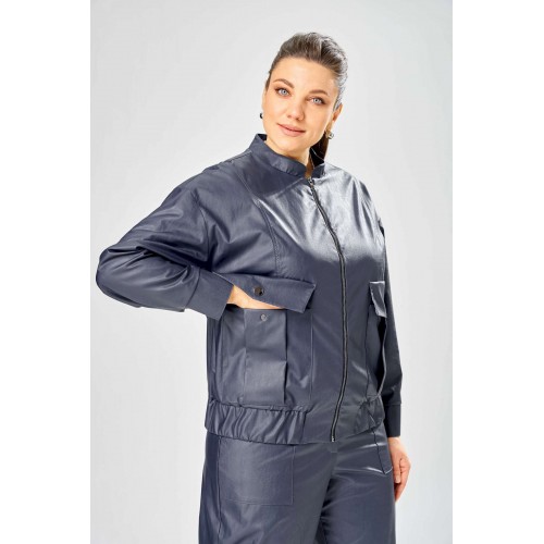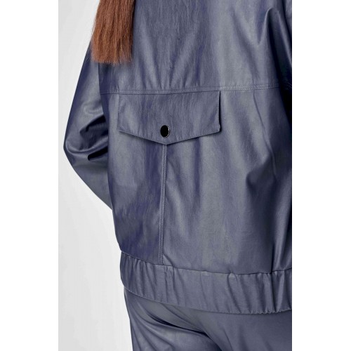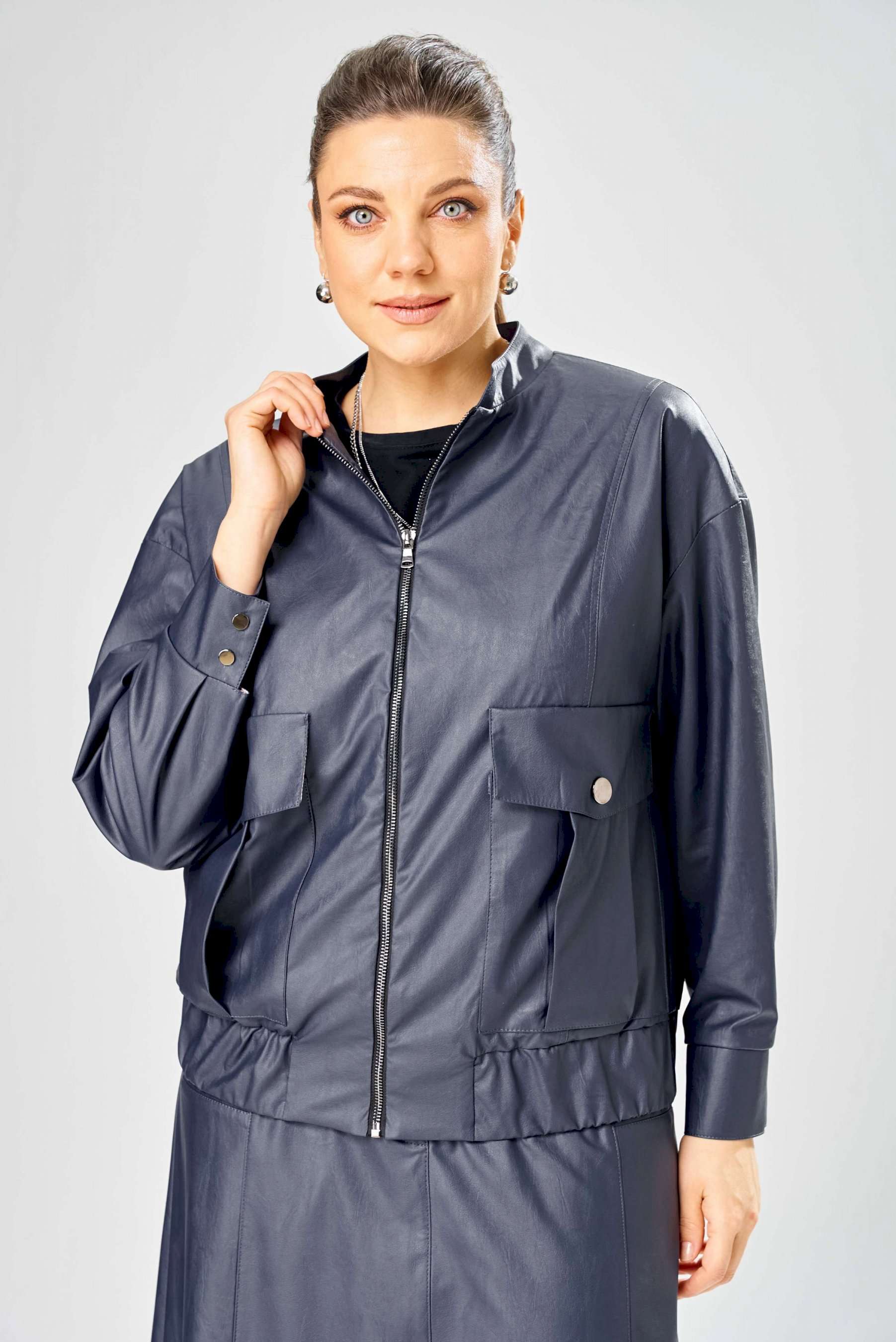 Стильный женская куртка свободного силуэта, из эко-кожи. Застегивается на молнию, по переду накладные карманы с клапаном и декоративной кнопкой. Головина оформлена воротником стойка. По спинке отрезная кокетка с клапаном. Рукава со спущенной поймой, по низу притачной манжет с застежкой на кнопки. По низу куртки, притачная планка с резинкой. Куртка на подкладке. Длина куртки – 62 см Длина рукава – 50 см