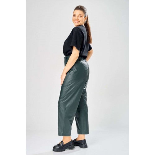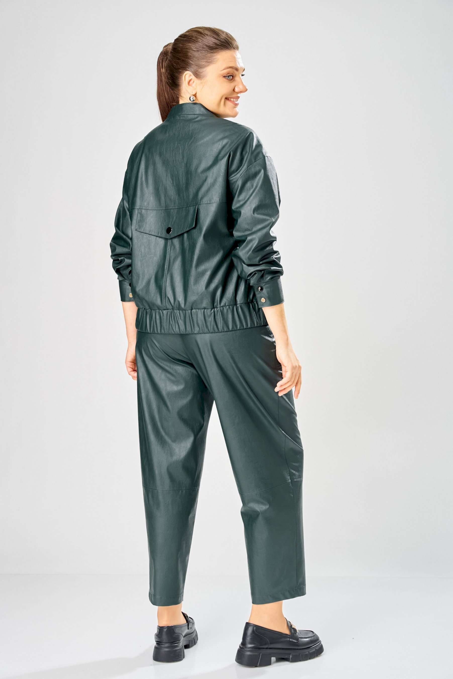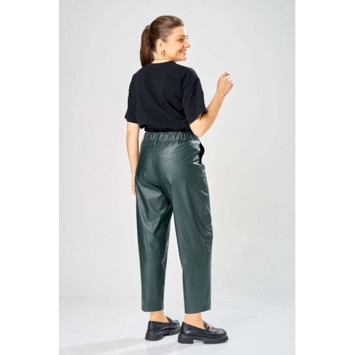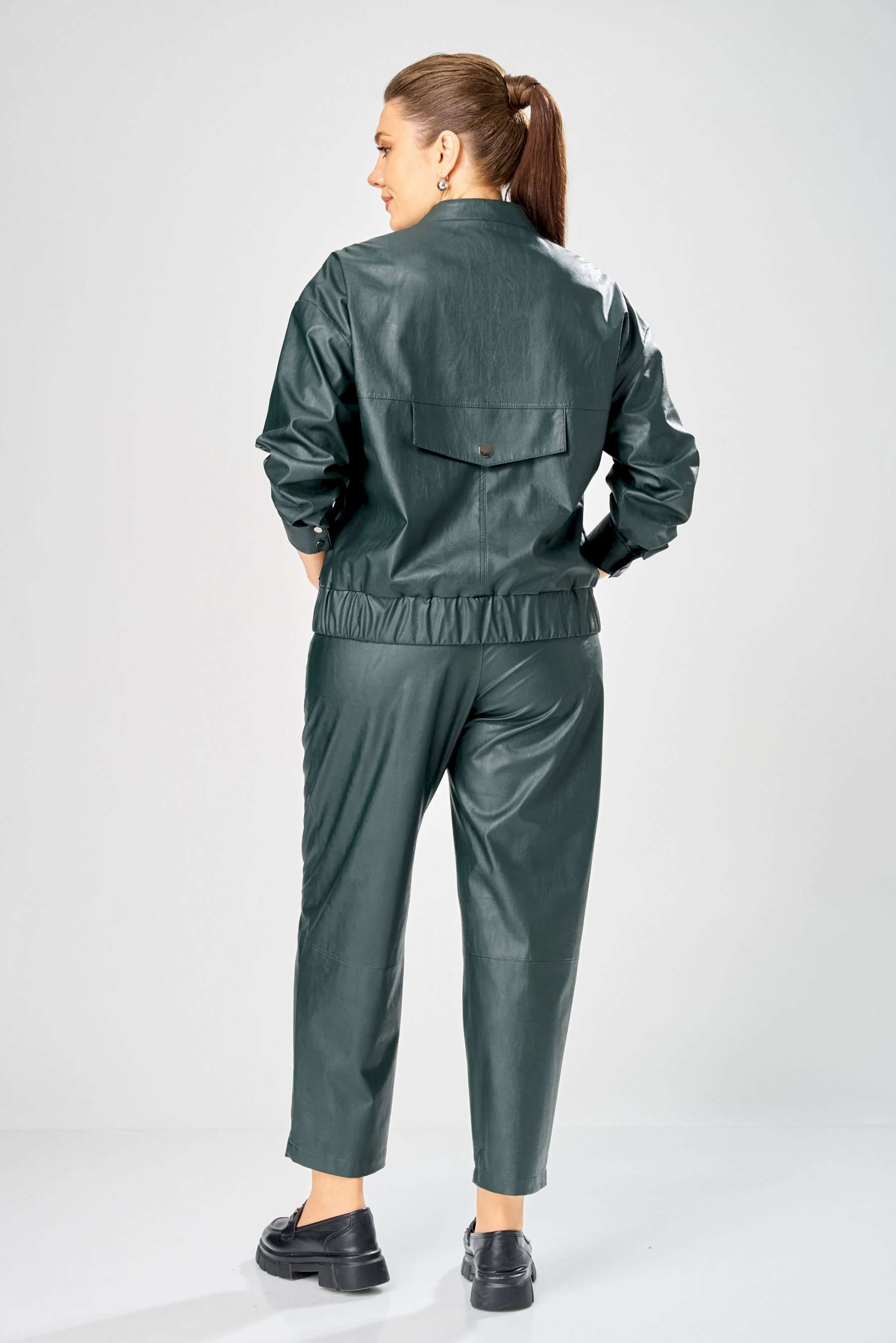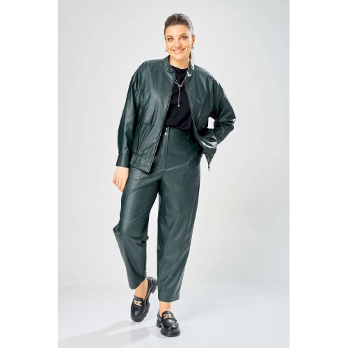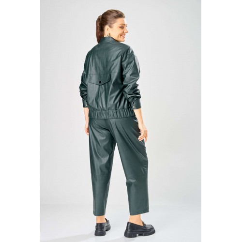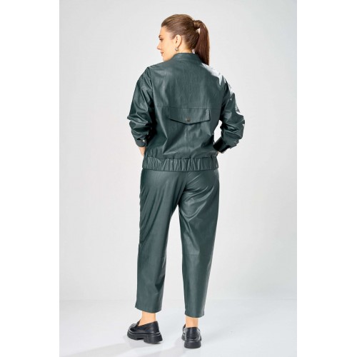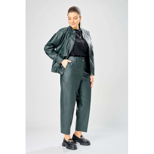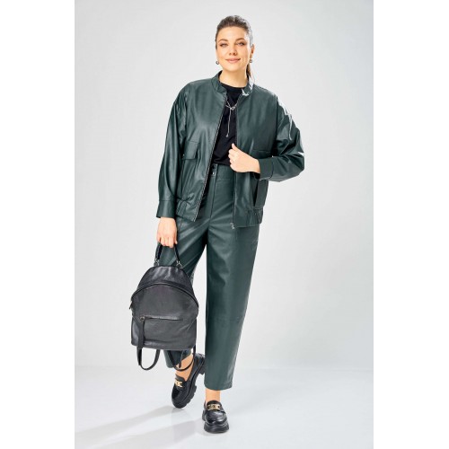 Стильный женский комплект, выполнен из эко-кожи. Куртка свободного силуэта, застегивается на молнию, по переду накладные карманы с клапаном и декоративной кнопкой. Головина оформлена воротником стойка. По спинке отрезная кокетка с клапаном. Рукава со спущенной поймой, по низу притачной манжет с застежкой на кнопки. По низу куртки, притачная планка с резинкой. Куртка на подкладке. Брюки зауженные к низу, по передним половинкам накладные карманы, застежка по линии банта на молнию, на задних половинках отрезная кокетка и накладные карманы. Верх брюк на пояса с застежкой на кнопки. Длина куртки – 62 см Длина рукава – 50 см Длина брюк по боковому шву – 100 см