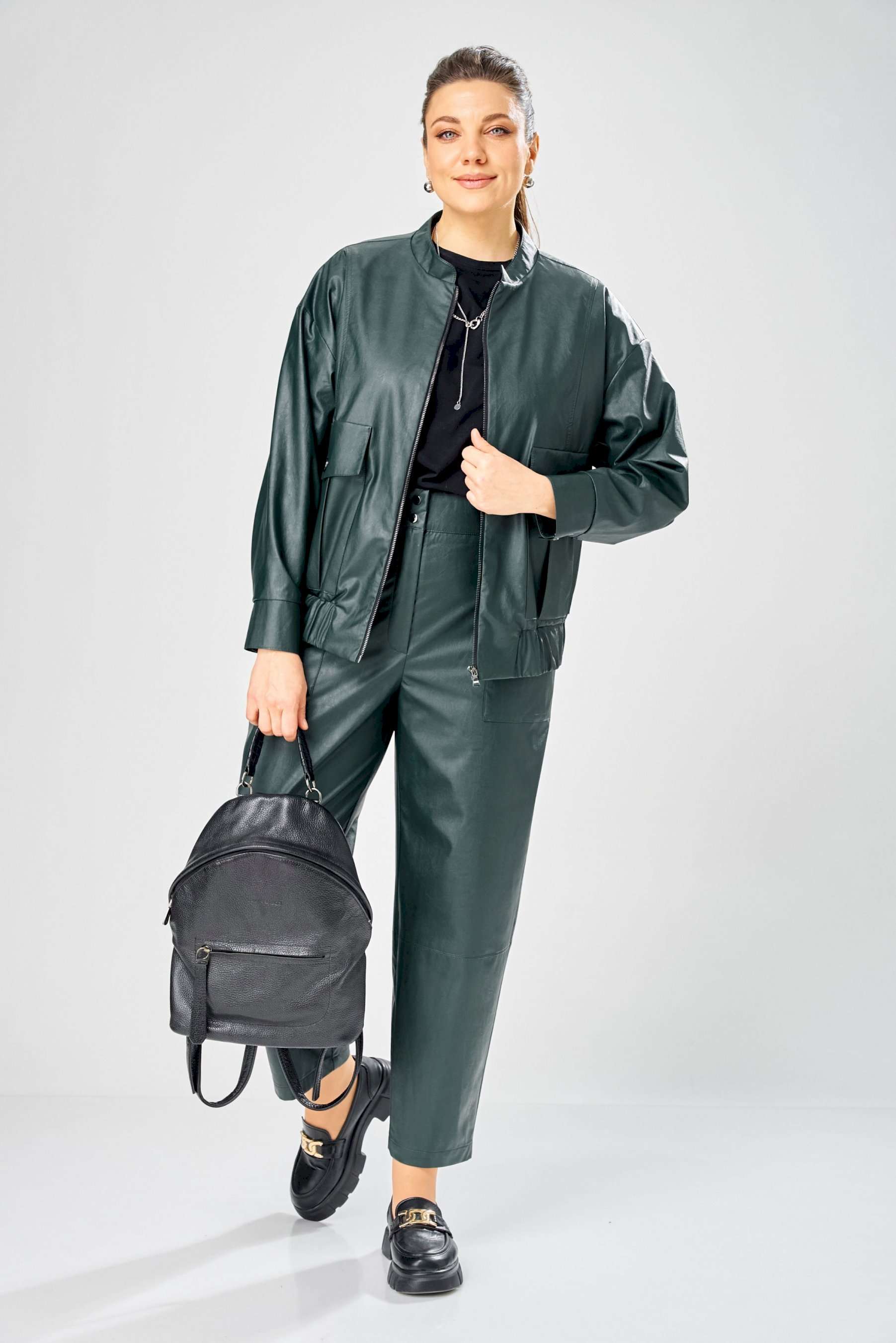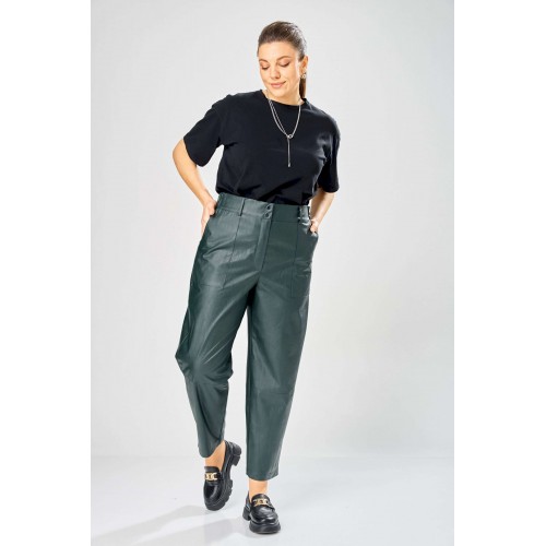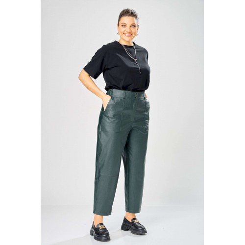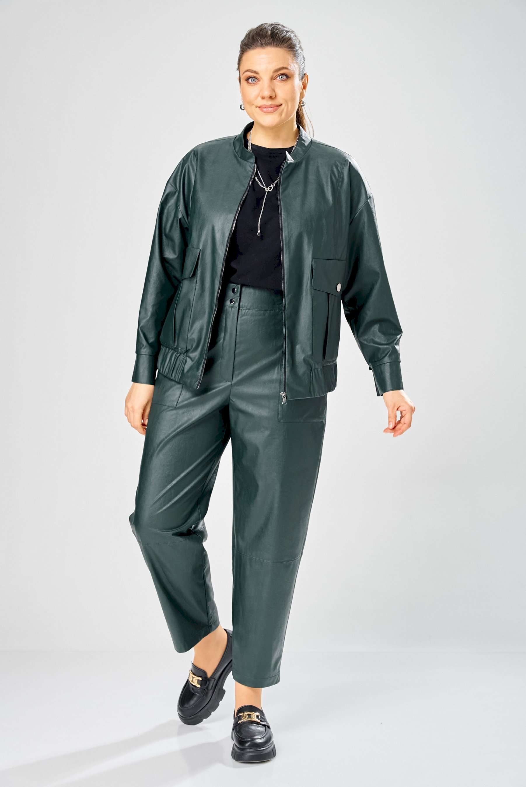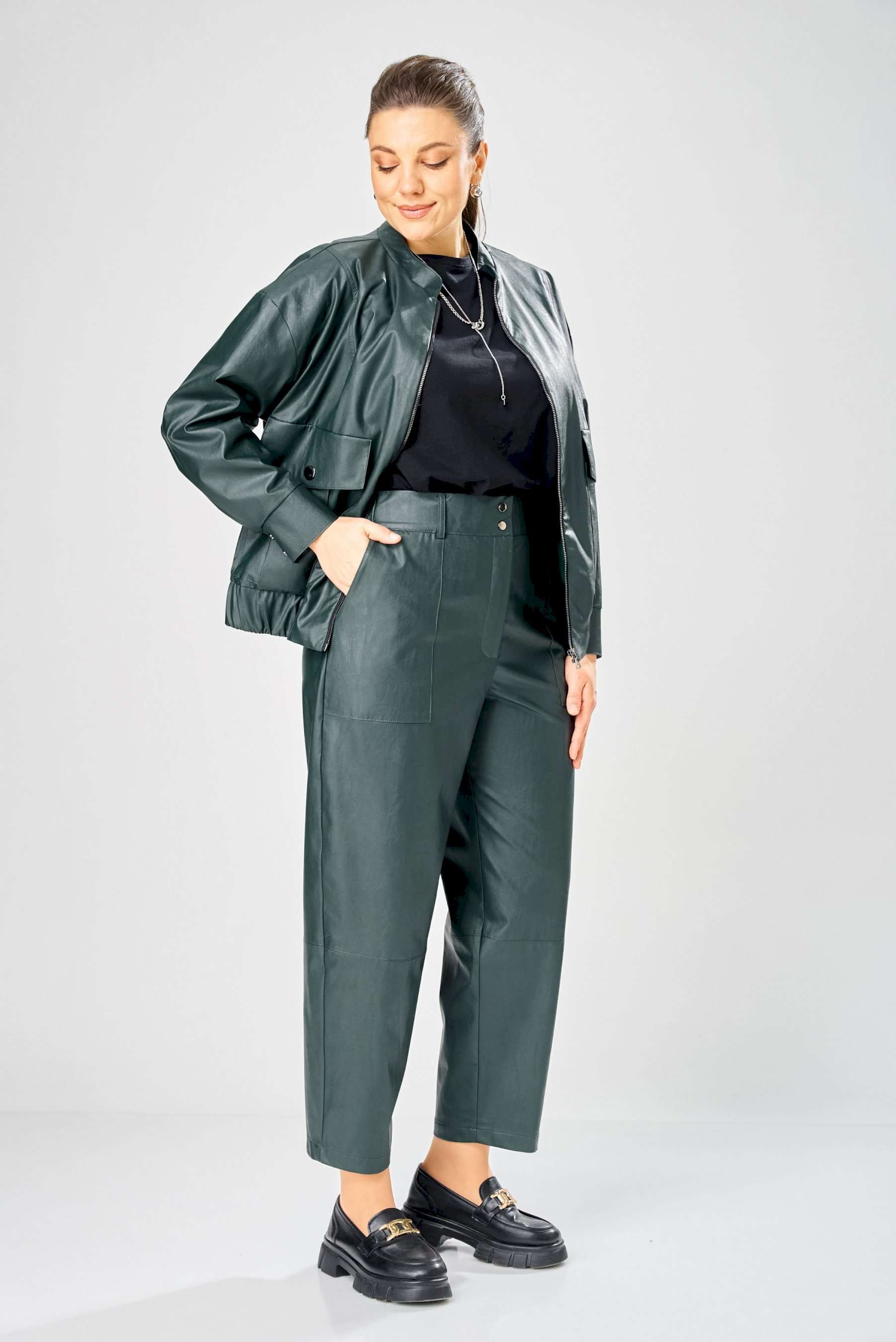 Стильный женский комплект, выполнен из эко-кожи. Куртка свободного силуэта, застегивается на молнию, по переду накладные карманы с клапаном и декоративной кнопкой. Головина оформлена воротником стойка. По спинке отрезная кокетка с клапаном. Рукава со спущенной поймой, по низу притачной манжет с застежкой на кнопки. По низу куртки, притачная планка с резинкой. Куртка на подкладке. Брюки зауженные к низу, по передним половинкам накладные карманы, застежка по линии банта на молнию, на задних половинках отрезная кокетка и накладные карманы. Верх брюк на пояса с застежкой на кнопки. Длина куртки – 62 см Длина рукава – 50 см Длина брюк по боковому шву – 100 см