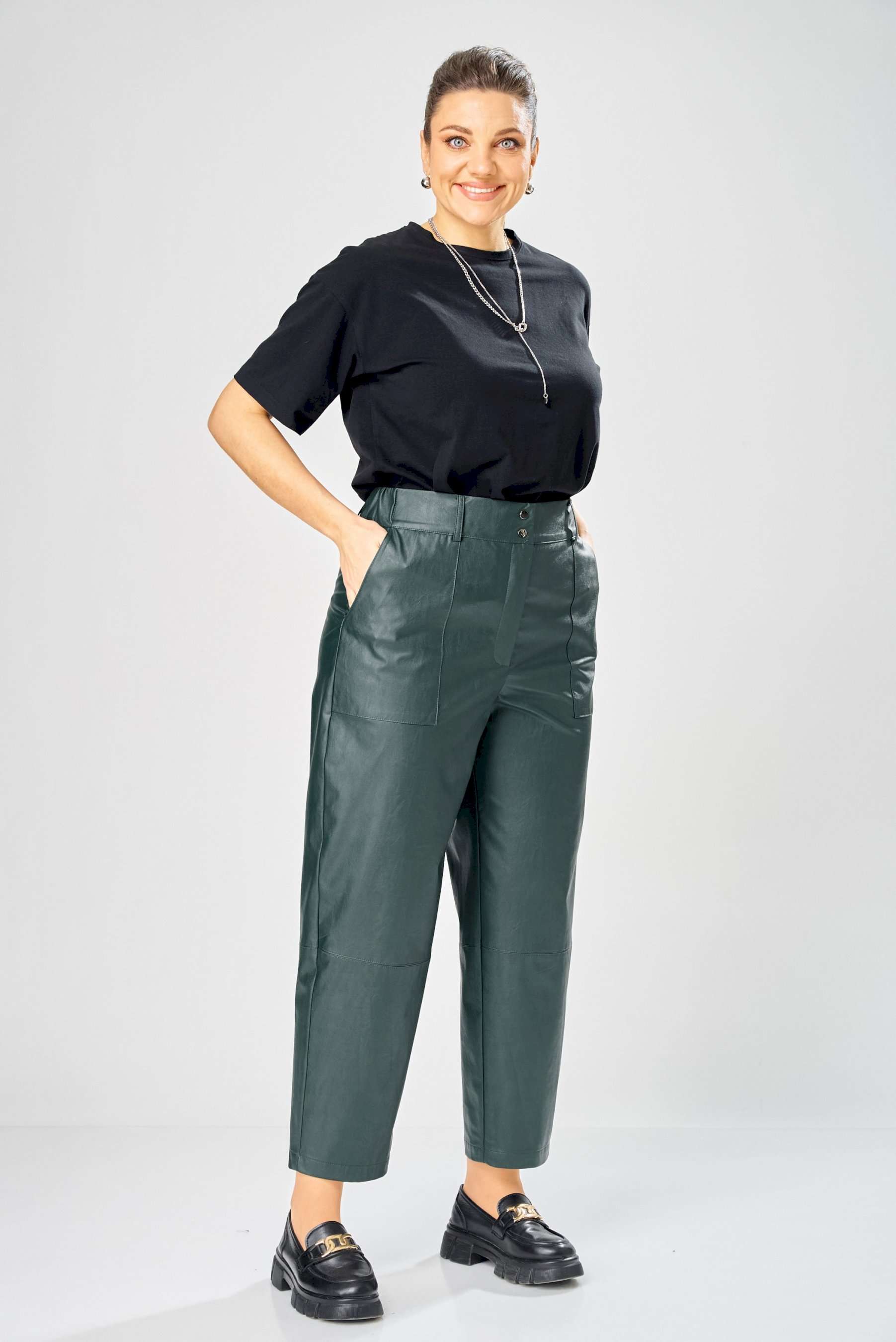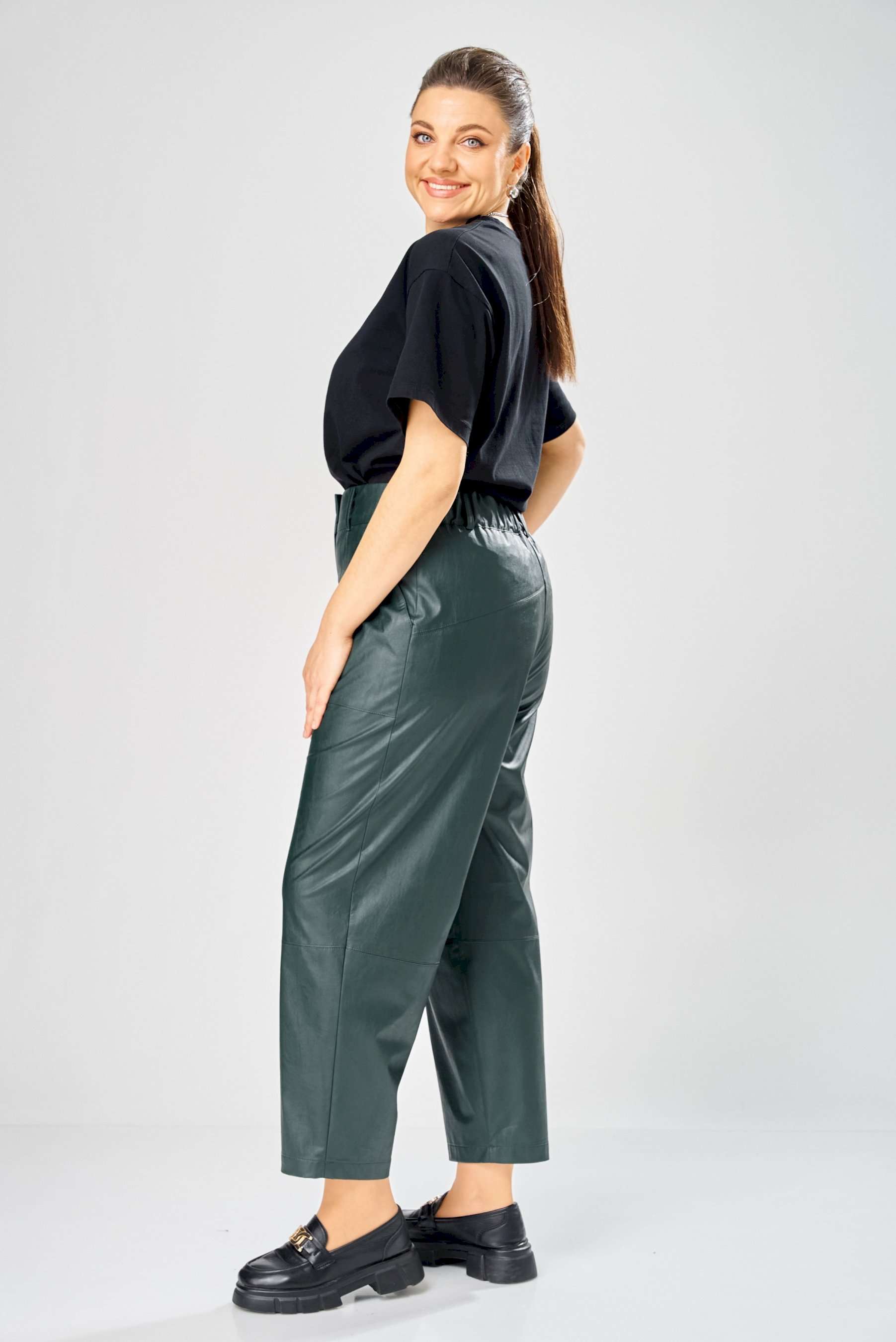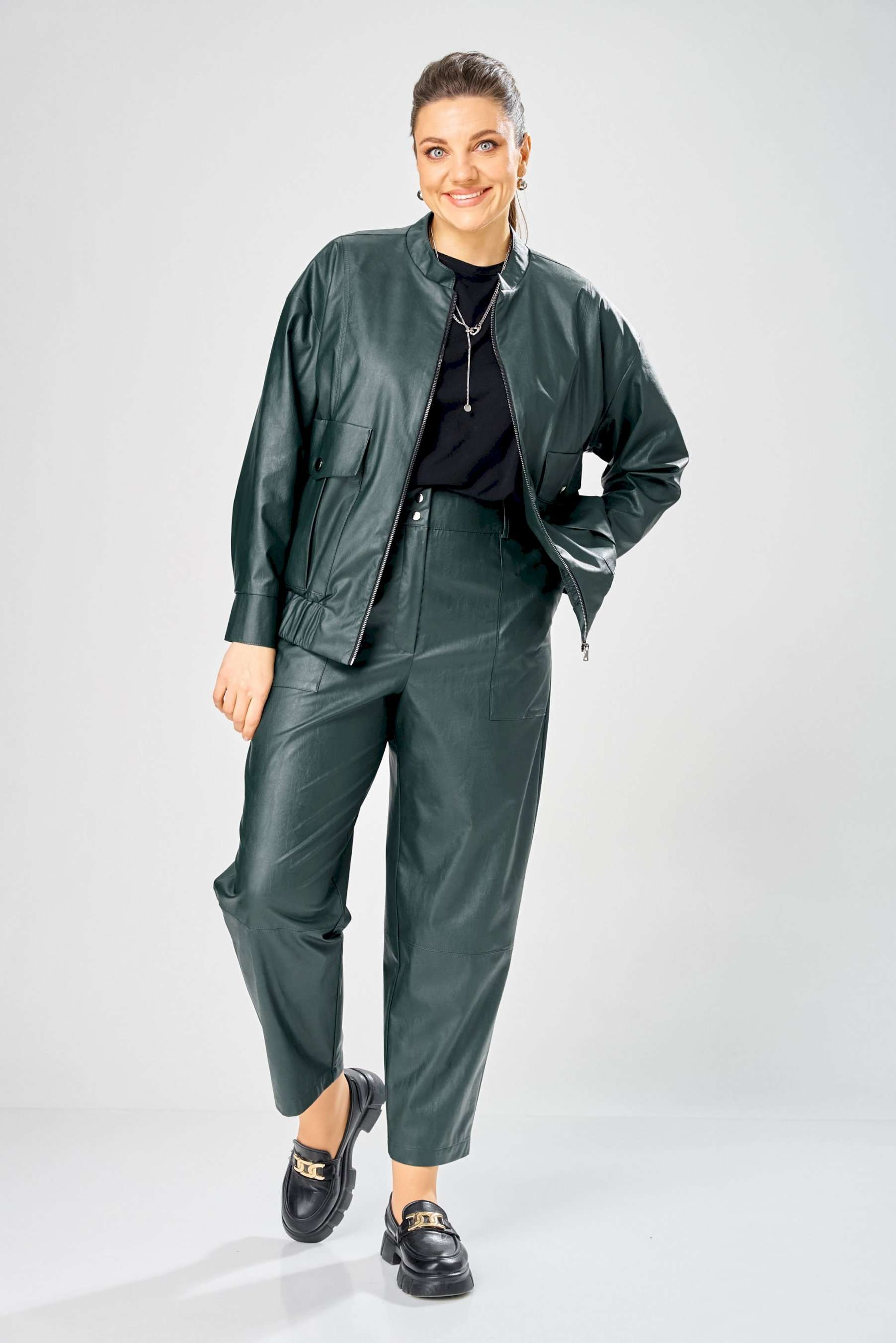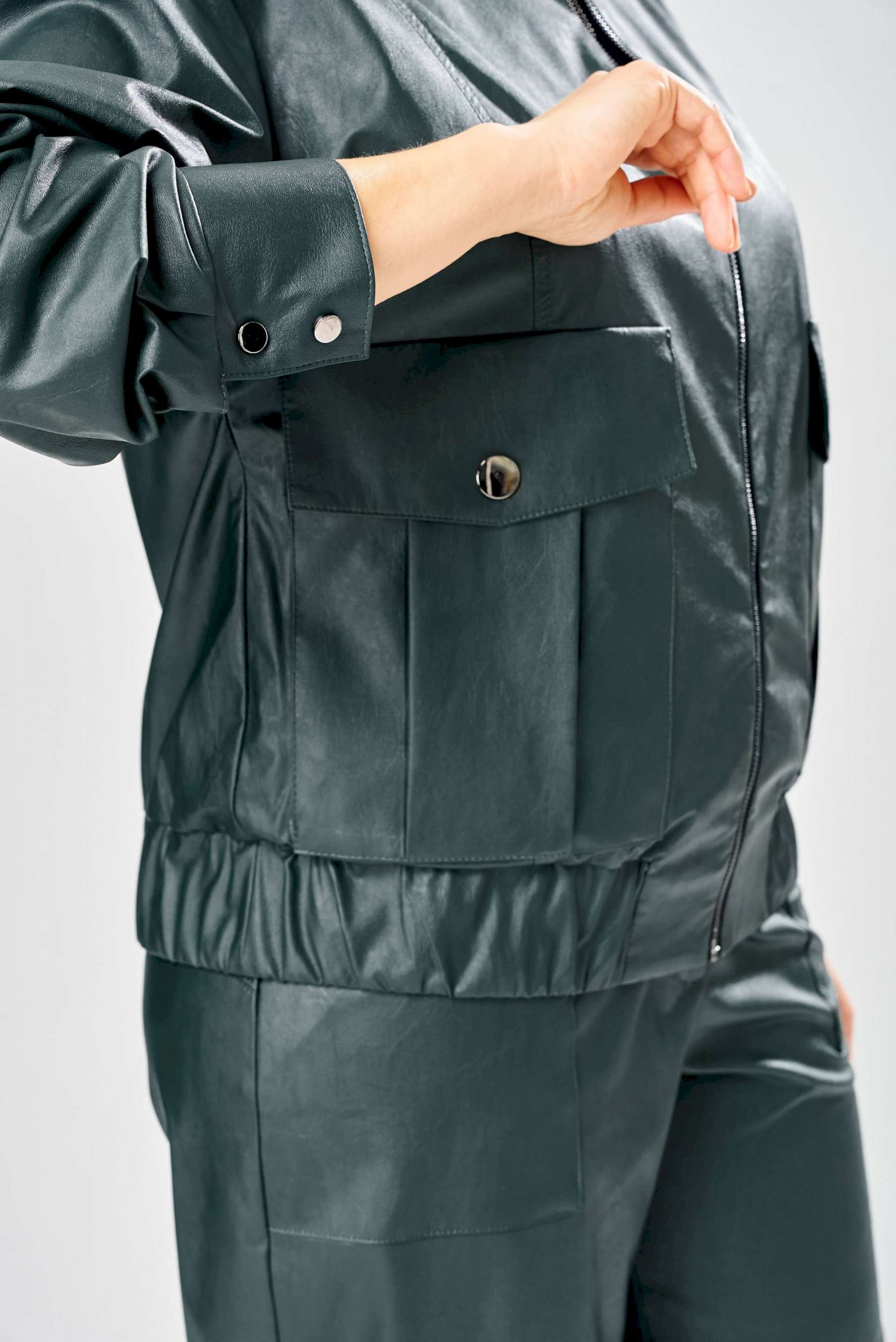 Стильный женский комплект, выполнен из эко-кожи. Куртка свободного силуэта, застегивается на молнию, по переду накладные карманы с клапаном и декоративной кнопкой. Головина оформлена воротником стойка. По спинке отрезная кокетка с клапаном. Рукава со спущенной поймой, по низу притачной манжет с застежкой на кнопки. По низу куртки, притачная планка с резинкой. Куртка на подкладке. Брюки зауженные к низу, по передним половинкам накладные карманы, застежка по линии банта на молнию, на задних половинках отрезная кокетка и накладные карманы. Верх брюк на пояса с застежкой на кнопки. Длина куртки – 62 см Длина рукава – 50 см Длина брюк по боковому шву – 100 см