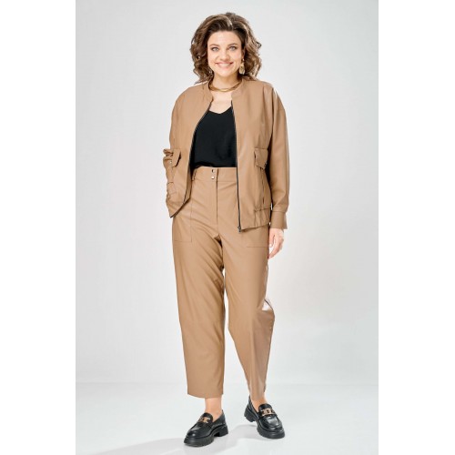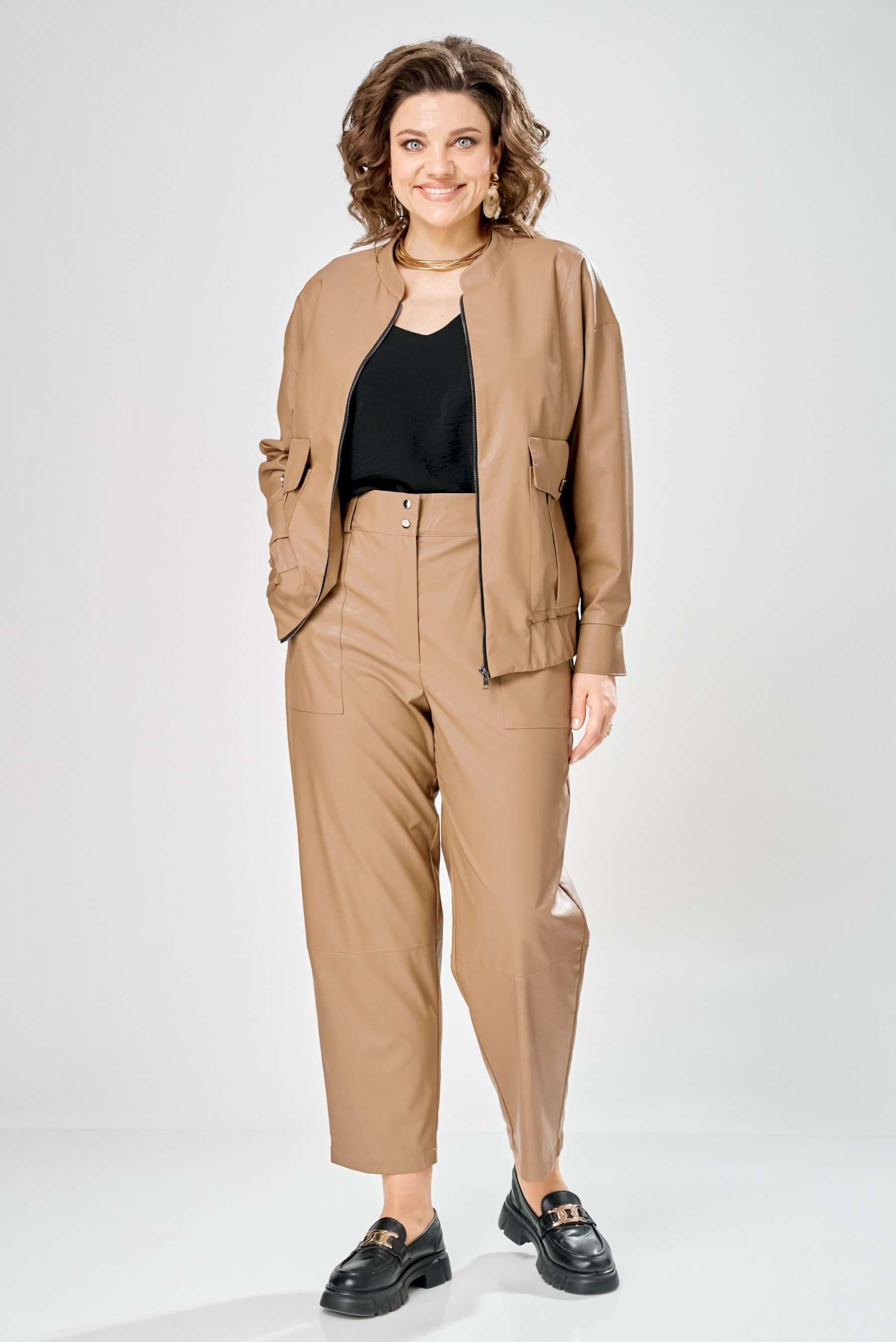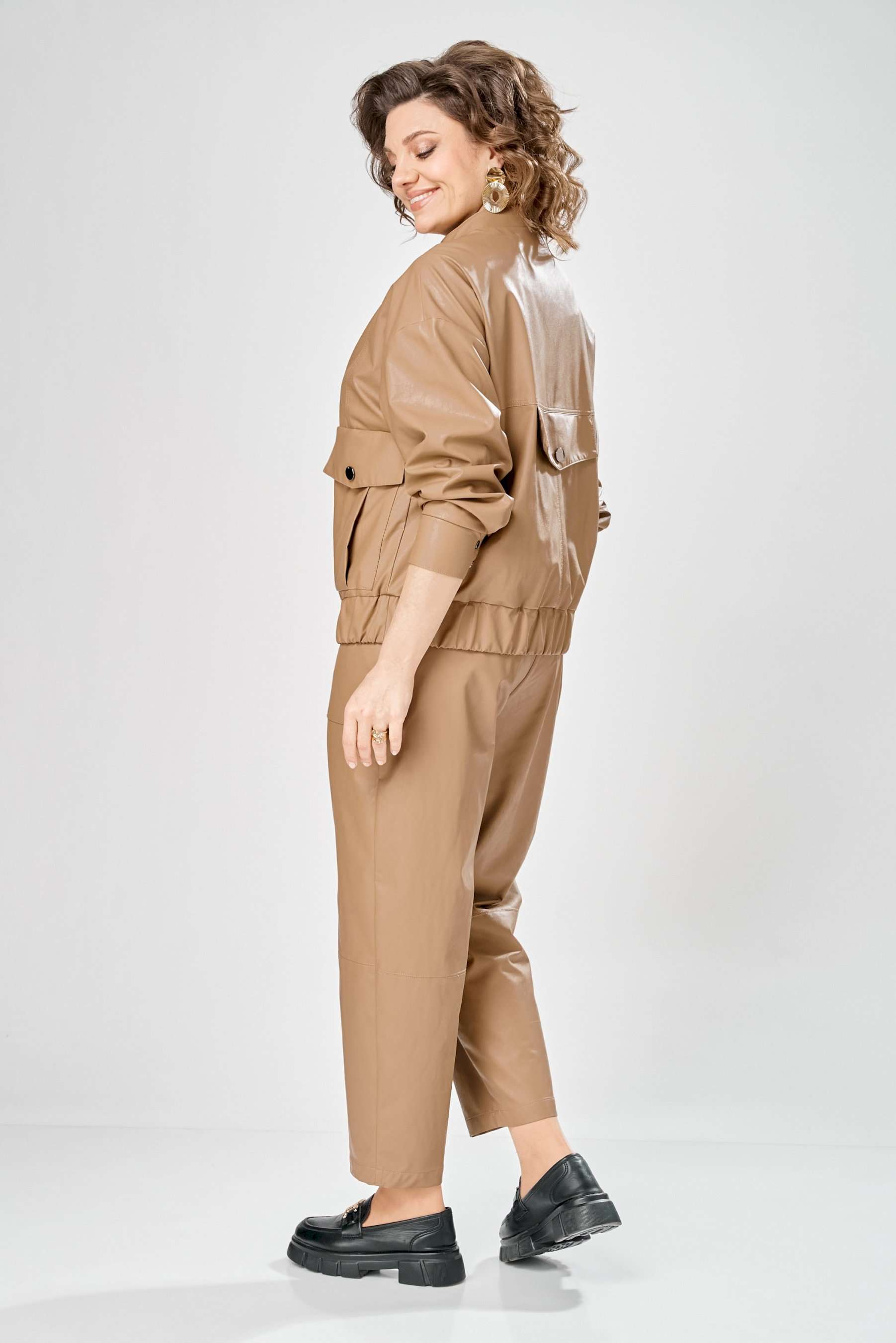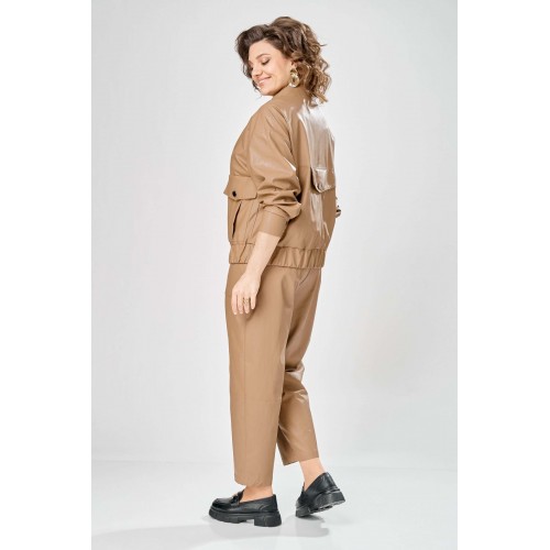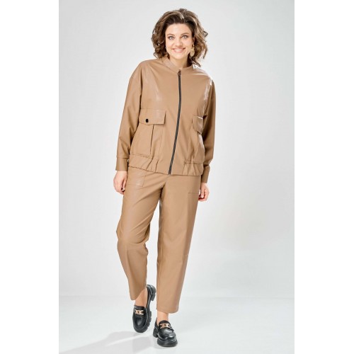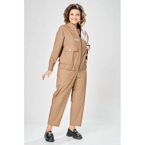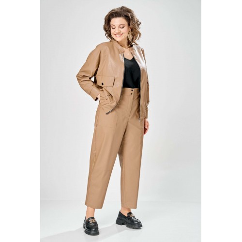 Стильный женский комплект, выполнен из эко-кожи. Куртка свободного силуэта, застегивается на молнию, по переду накладные карманы с клапаном и декоративной кнопкой. Головина оформлена воротником стойка. По спинке отрезная кокетка с клапаном. Рукава со спущенной поймой, по низу притачной манжет с застежкой на кнопки. По низу куртки, притачная планка с резинкой. Куртка на подкладке. Брюки зауженные к низу, по передним половинкам накладные карманы, застежка по линии банта на молнию, на задних половинках отрезная кокетка и накладные карманы. Верх брюк на пояса с застежкой на кнопки. Длина куртки – 62 см Длина рукава – 50 см Длина брюк по боковому шву – 100 см