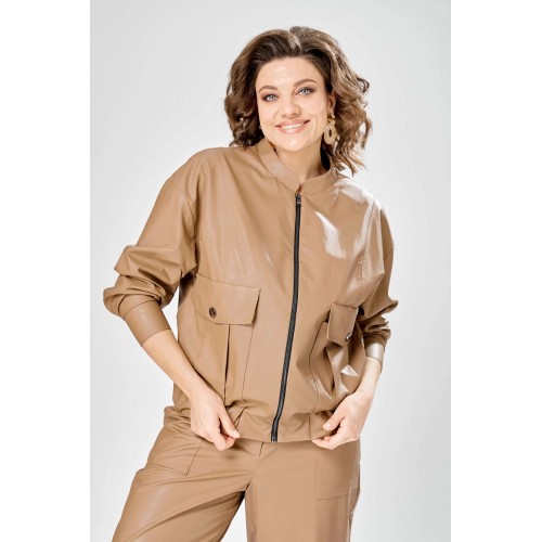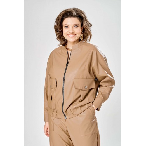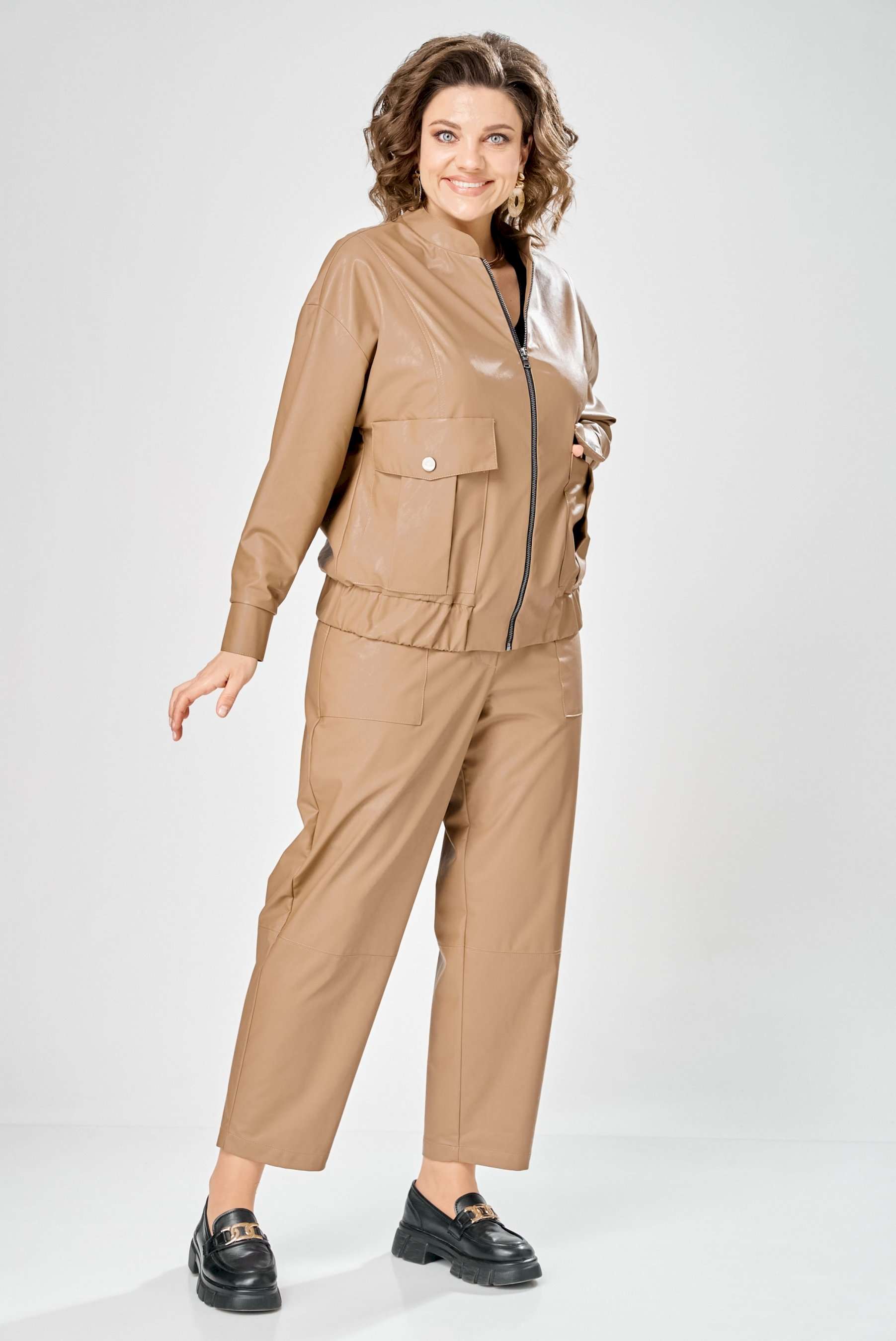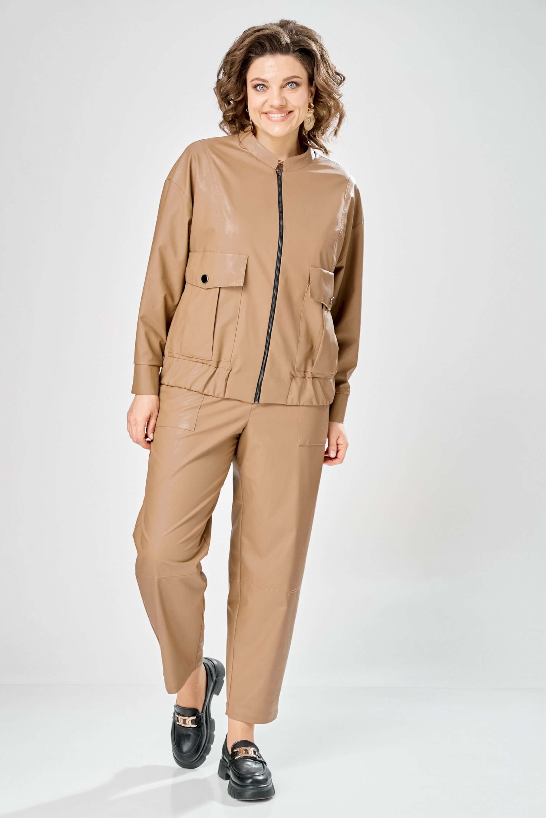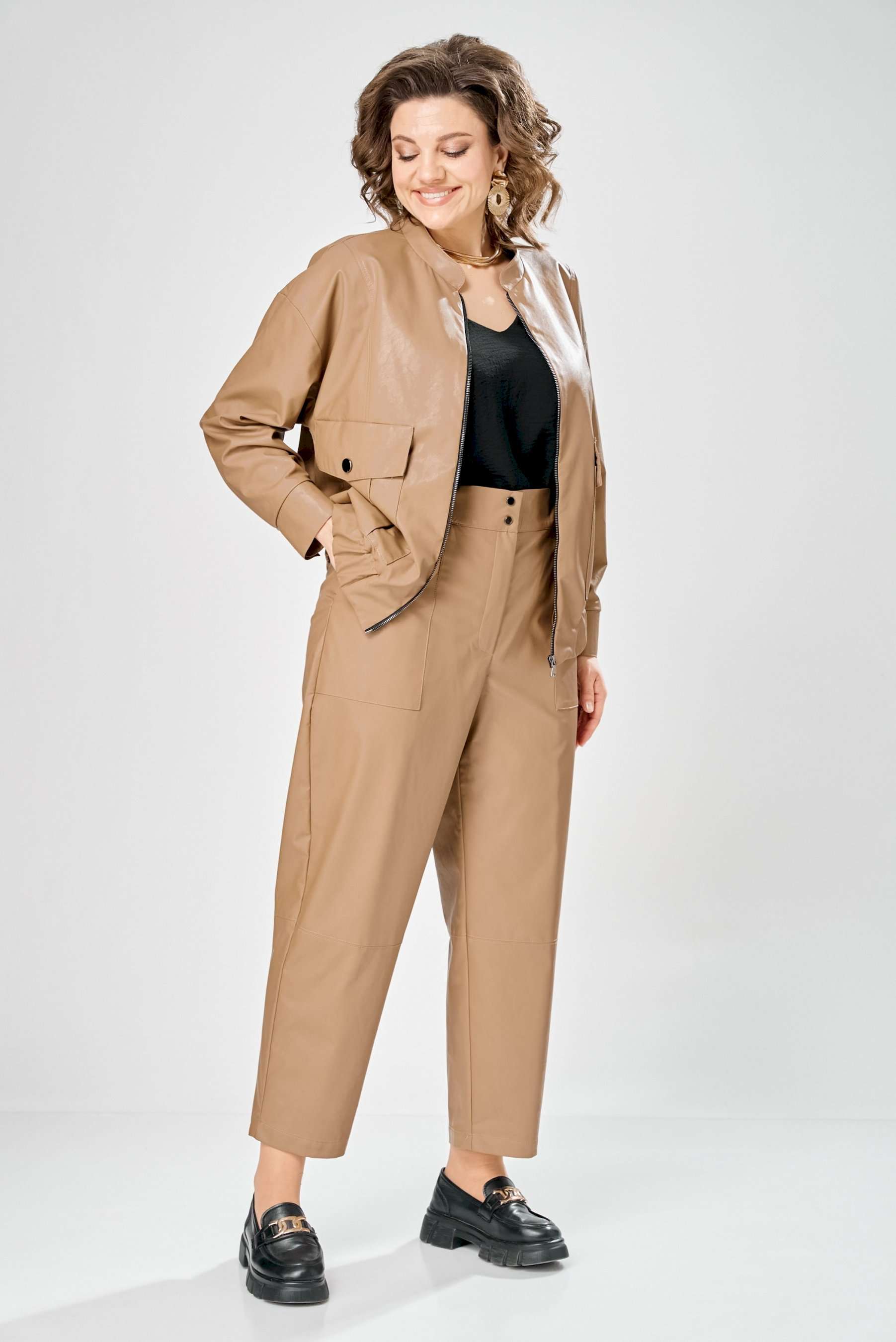 Стильный женский комплект, выполнен из эко-кожи. Куртка свободного силуэта, застегивается на молнию, по переду накладные карманы с клапаном и декоративной кнопкой. Головина оформлена воротником стойка. По спинке отрезная кокетка с клапаном. Рукава со спущенной поймой, по низу притачной манжет с застежкой на кнопки. По низу куртки, притачная планка с резинкой. Куртка на подкладке. Брюки зауженные к низу, по передним половинкам накладные карманы, застежка по линии банта на молнию, на задних половинках отрезная кокетка и накладные карманы. Верх брюк на пояса с застежкой на кнопки. Длина куртки – 62 см Длина рукава – 50 см Длина брюк по боковому шву – 100 см
