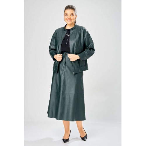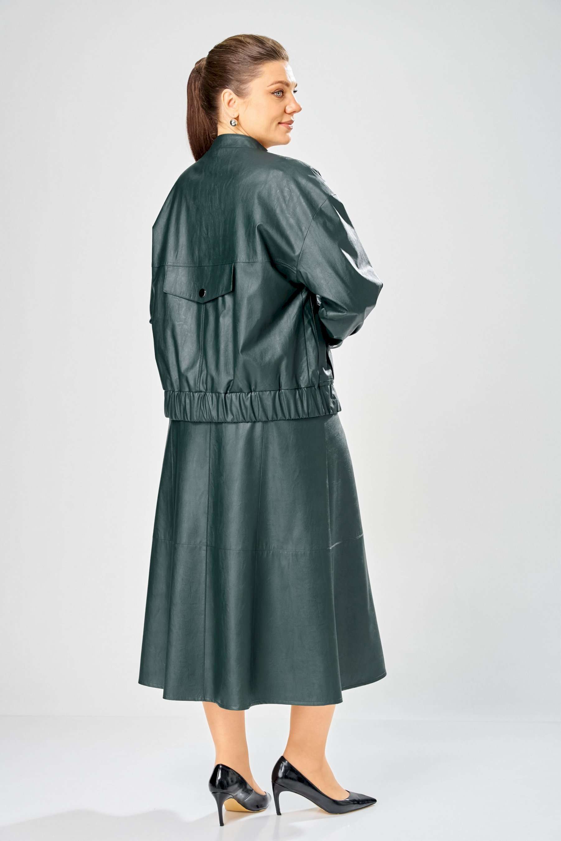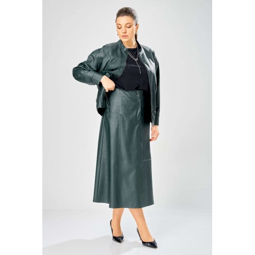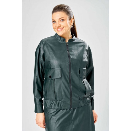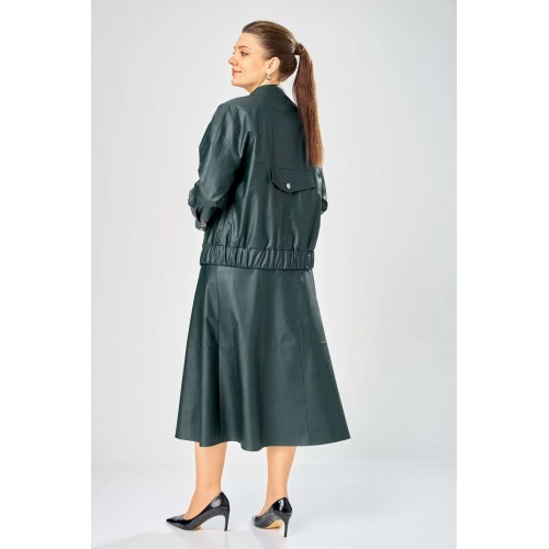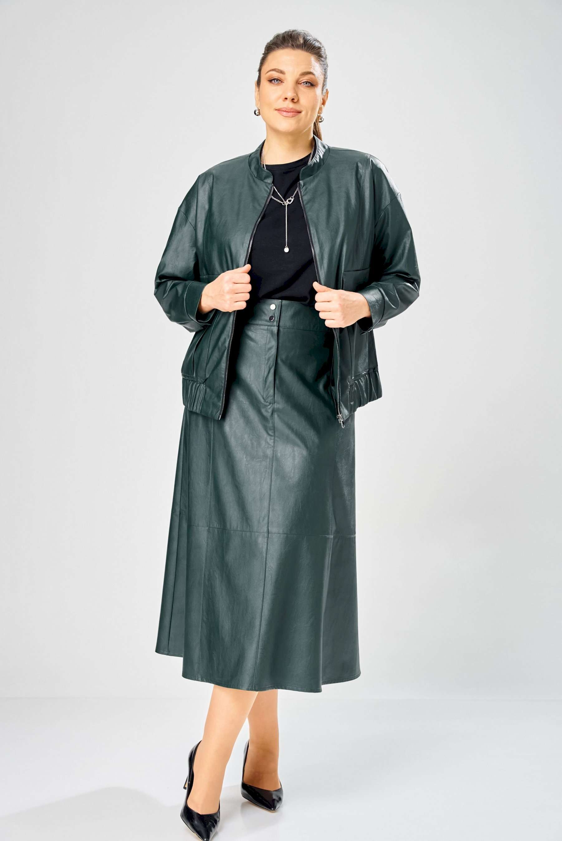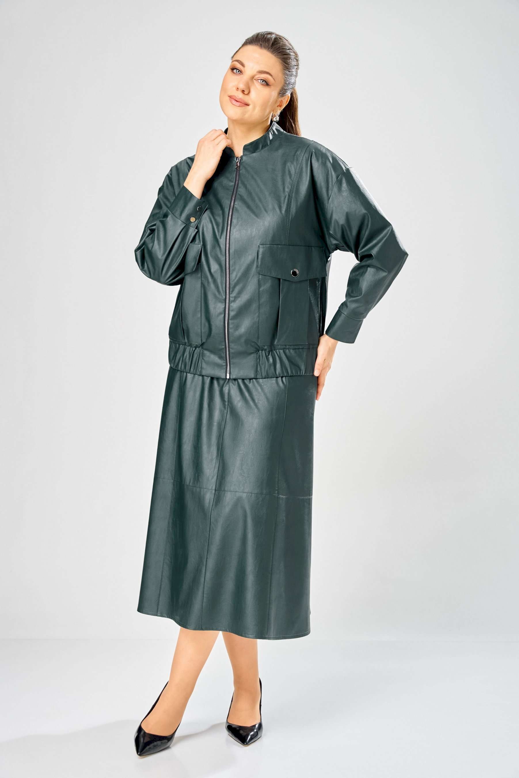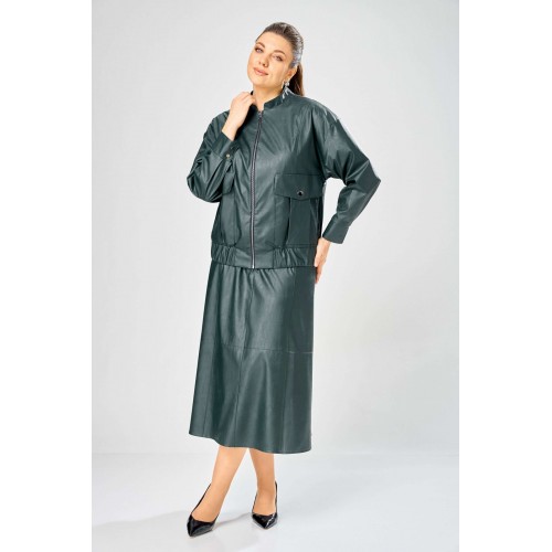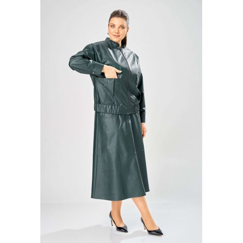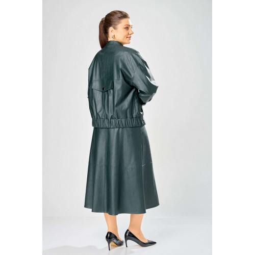 Стильный женский комплект, выполнен из эко-кожи. Куртка свободного силуэта, застегивается на молнию, по переду накладные карманы с клапаном и декоративной кнопкой. Головина оформлена воротником стойка. По спинке отрезная кокетка с клапаном. Рукава со спущенной поймой, по низу притачной манжет с застежкой на кнопки. По низу куртки, притачная планка с резинкой. Куртка на подкладке. Юбка «А» образного силуэта, по переду и спинке рельефные швы, по переду от рельефа до бокового шва, карманы с листочкой, застежка на молнию в центральном шве переда. Верх юбки на поясе с застежкой на кнопки. Юбка на подкладке. Длина куртки – 62 см Длина рукава – 50 см Длина юбки – 87 см